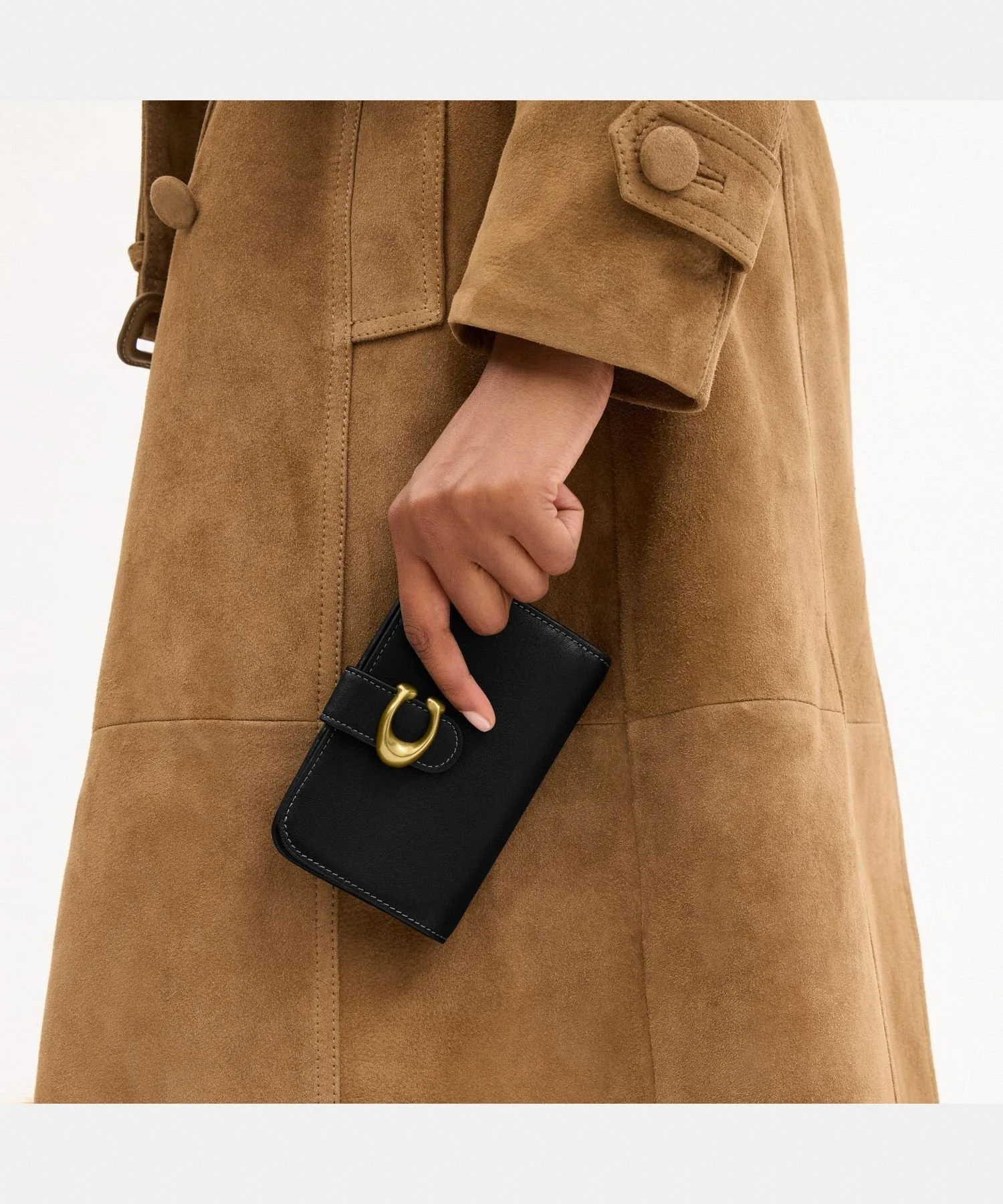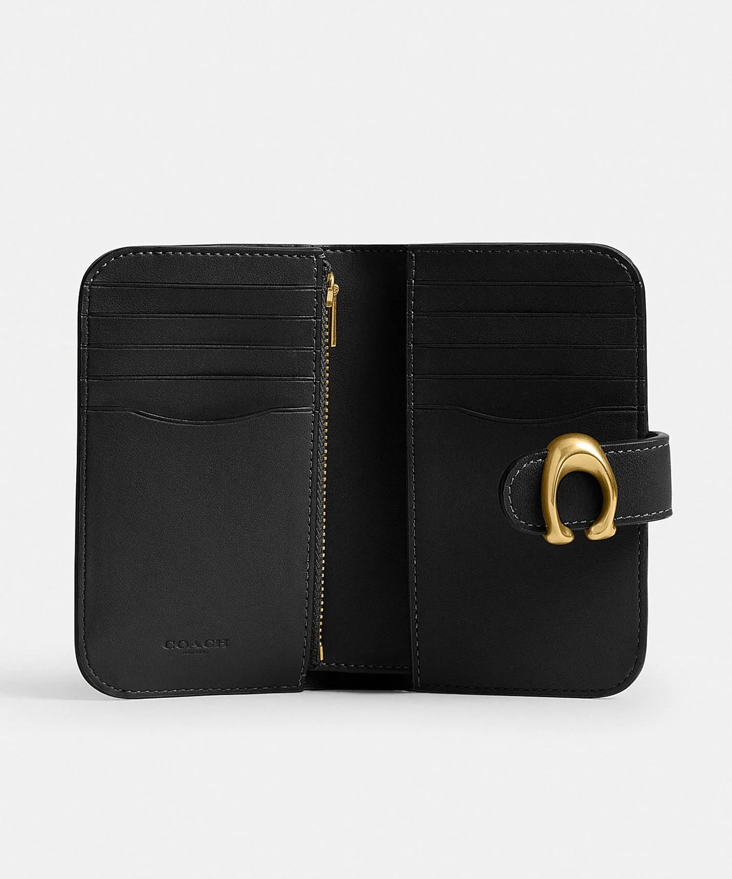 Этот миниатюрный складной кошелек украшен привлекательной фурнитурой Coach в виде буквы "C". Это современная интерпретация архивного дизайна Coach 1970-х годов, выполненная из мягкой зернистой кожи.