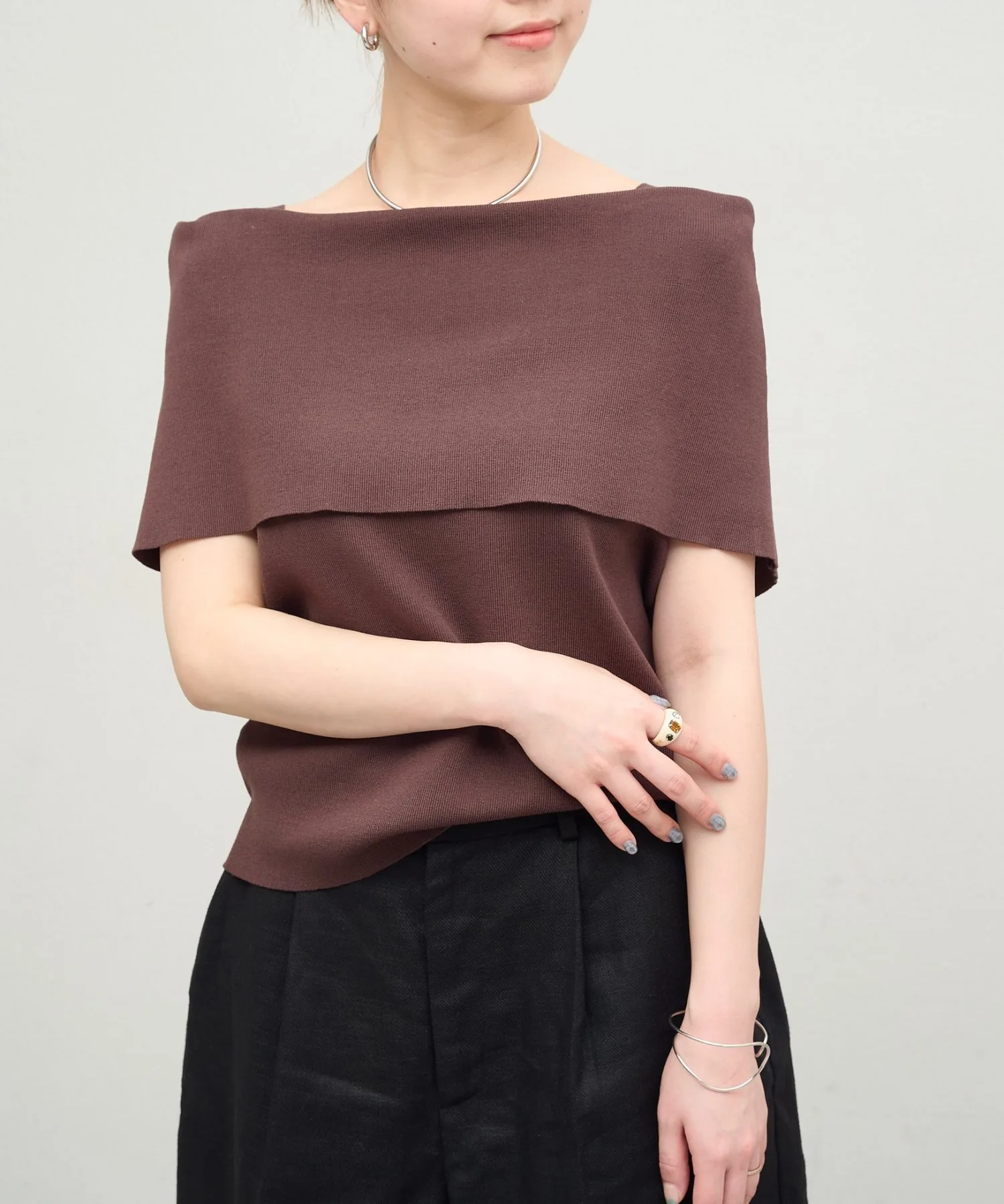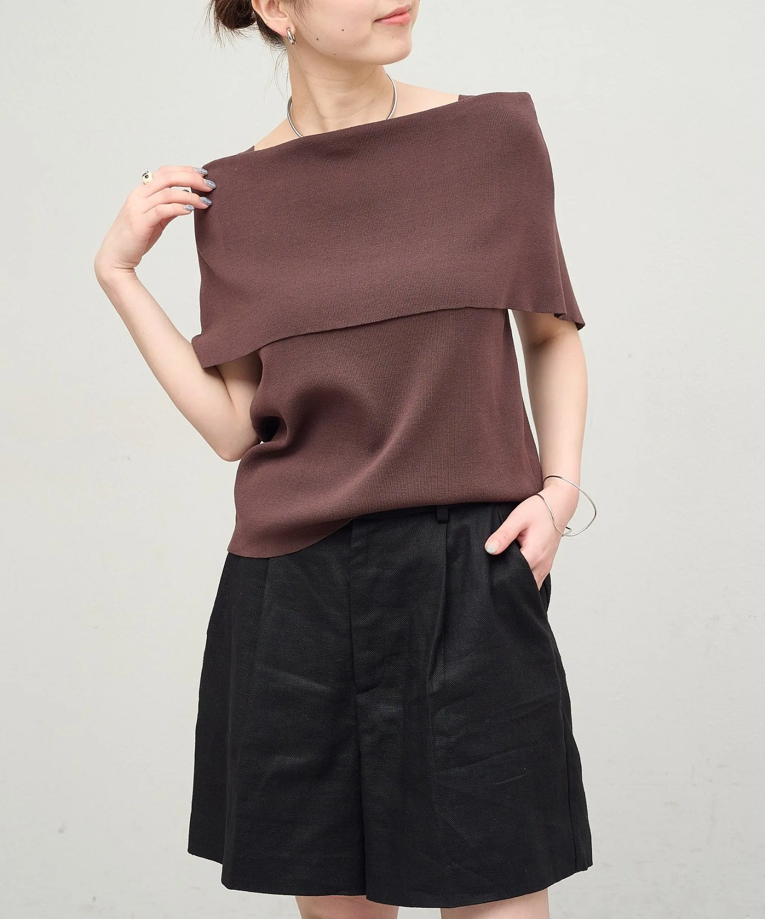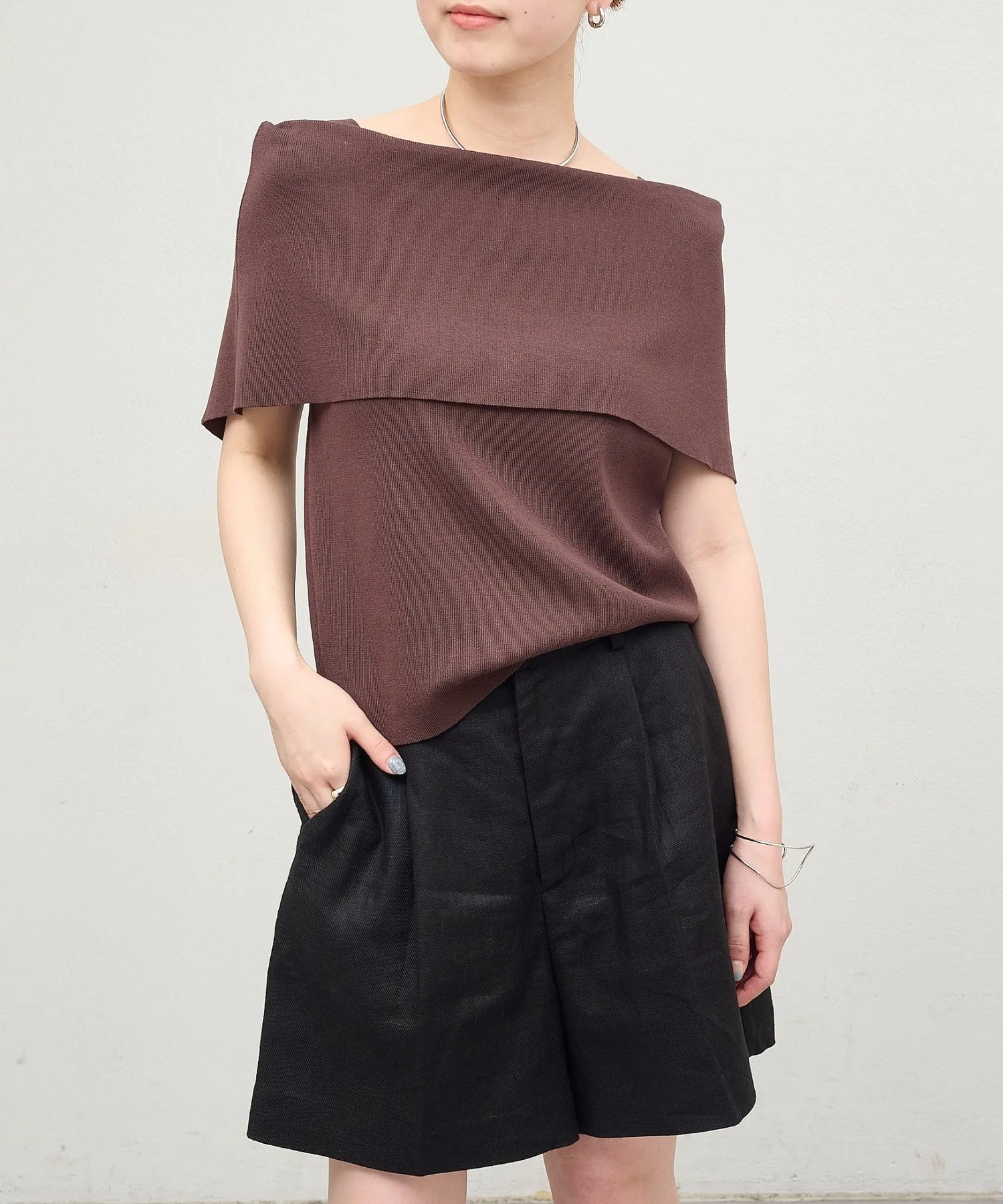 - Дизайн с открытыми плечами делает этот трикотаж изысканным и женственным.