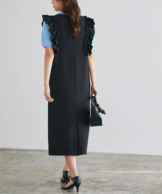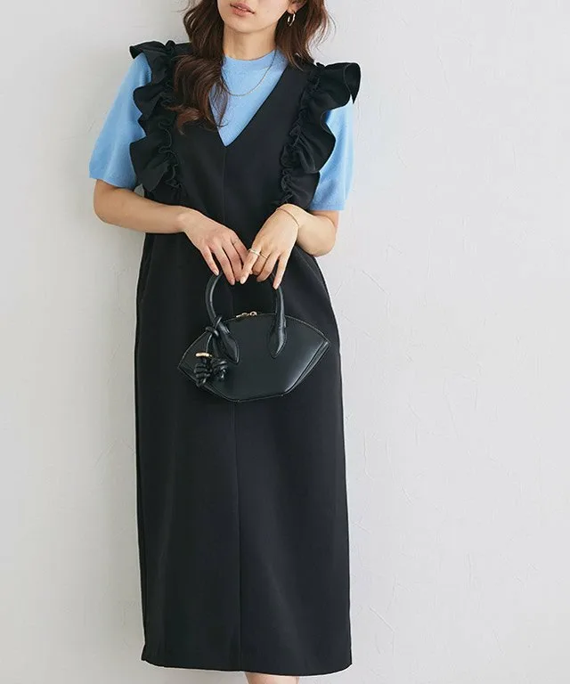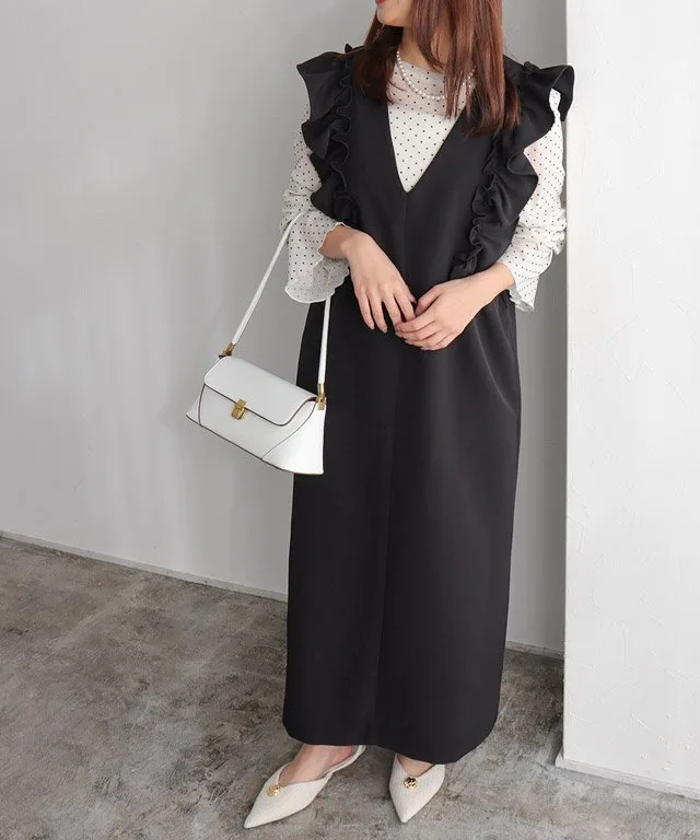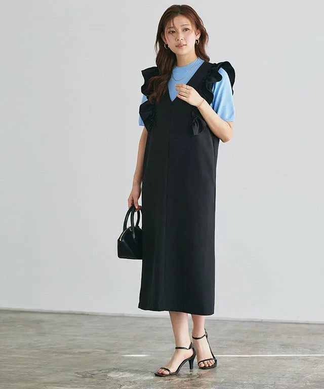Элегантная юбка-свитер с привлекательным дизайном в виде оборок на плечах. V-образный вырез создает безупречный вид. Умеренно свободный силуэт I-образной формы придает ей аккуратный вид и подчеркивает ее солидный стиль.