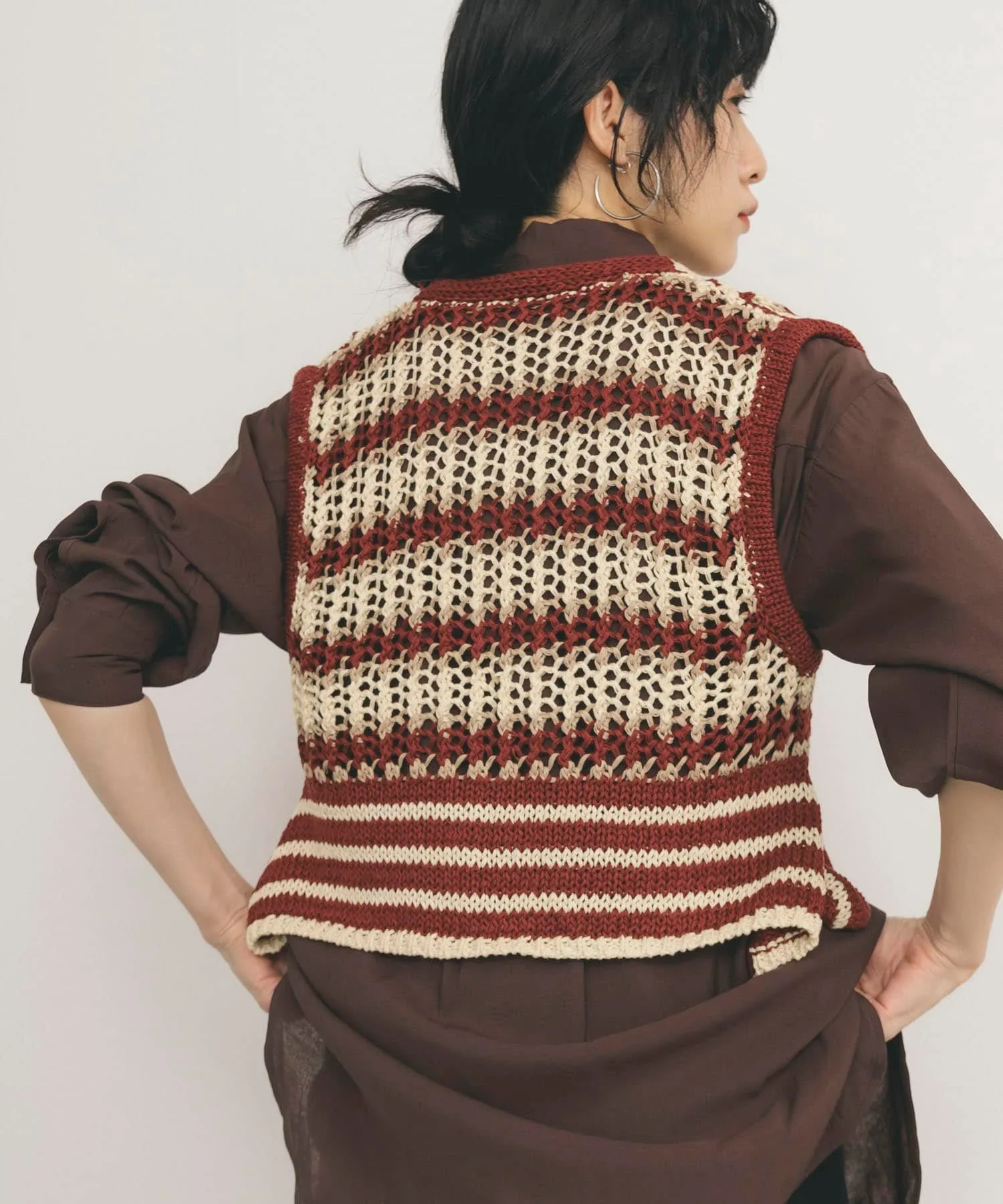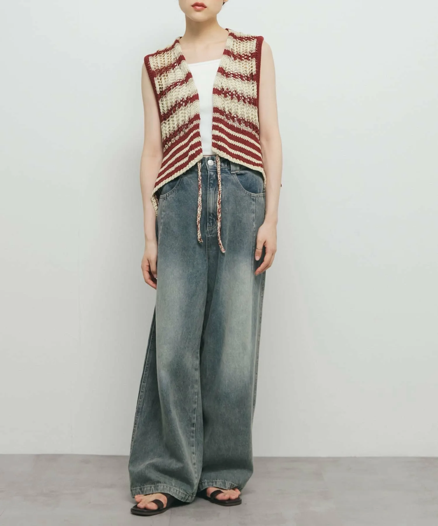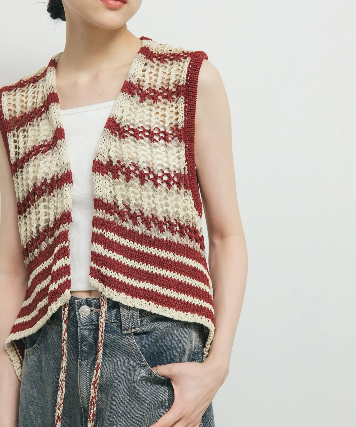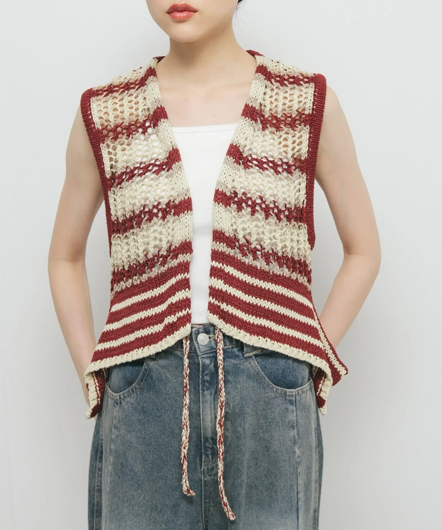 Этот жилет украшен эффектным полосатым узором. Модная пряжа и ажурная вязка создают стильный образ. Затяните переднюю ленту, чтобы собрать ткань вокруг воротника, что позволит вам изменить силуэт.