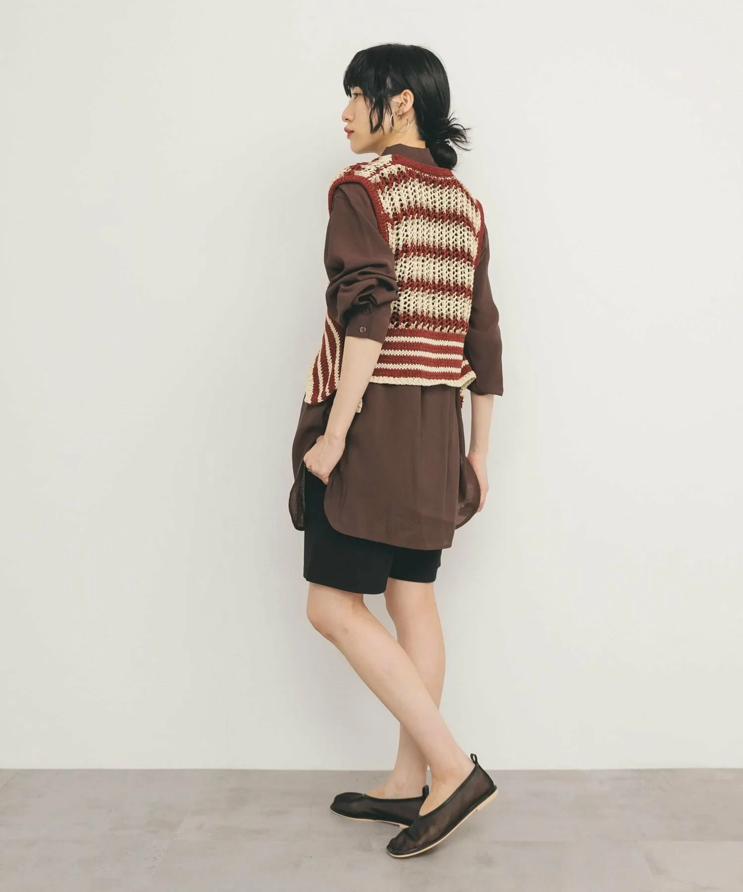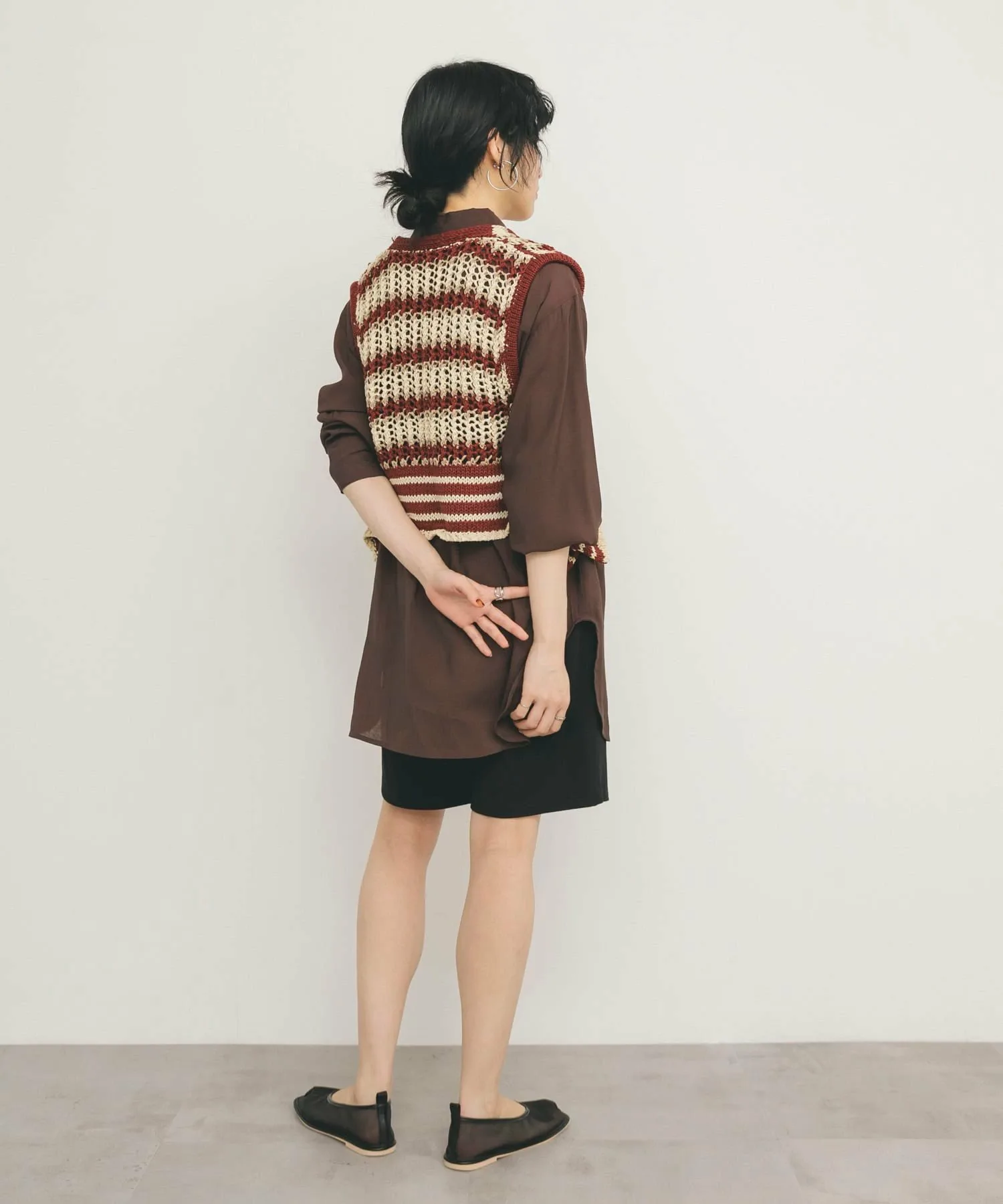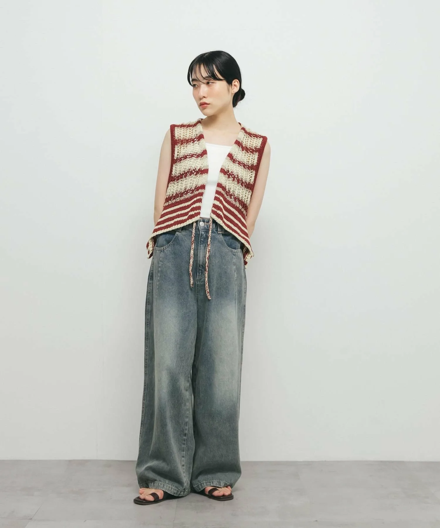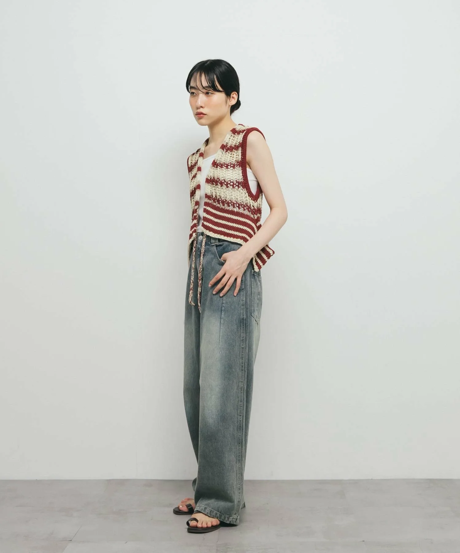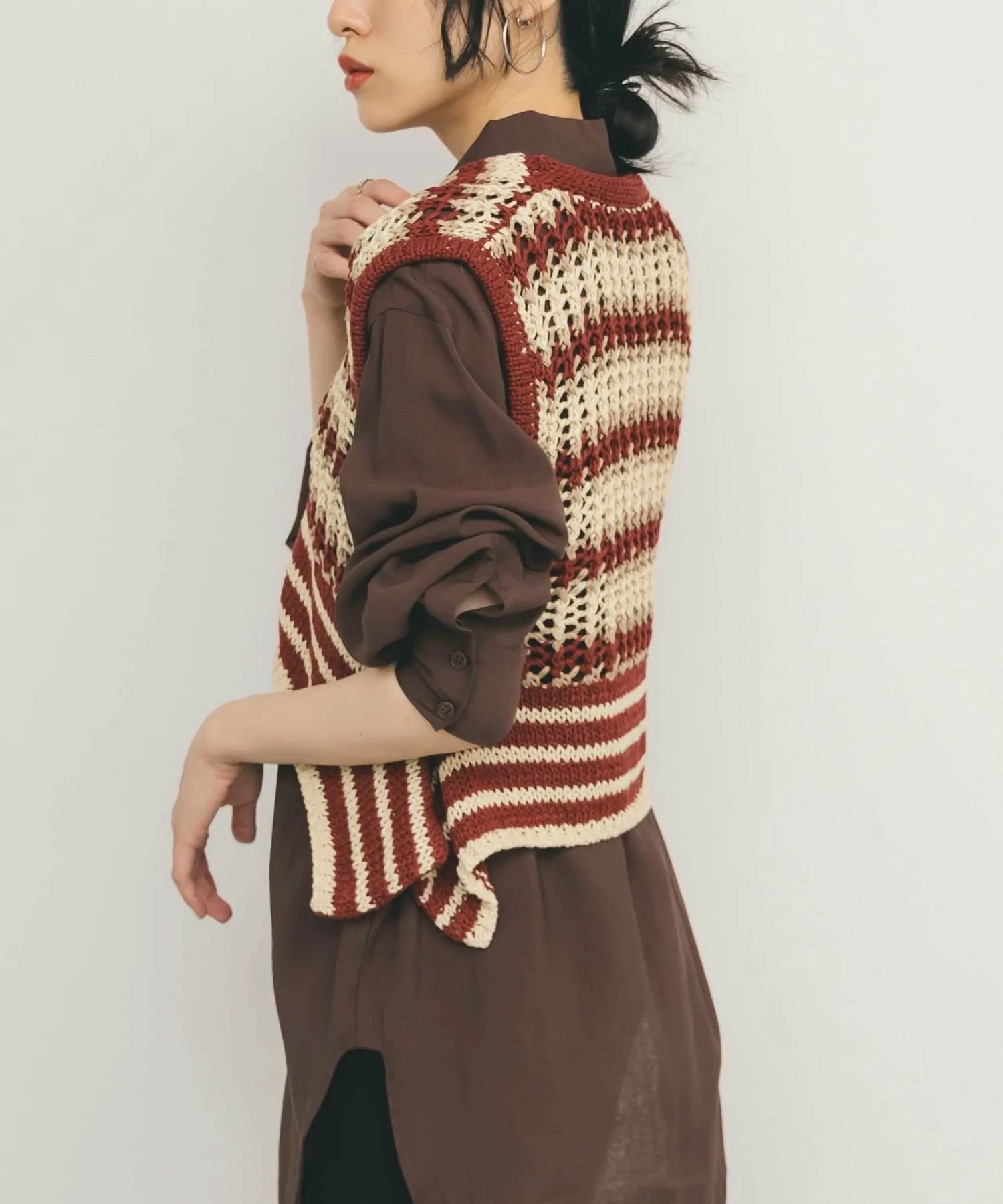Этот жилет украшен эффектным полосатым узором. Модная пряжа и ажурная вязка создают стильный образ. Затяните переднюю ленту, чтобы собрать ткань вокруг воротника, что позволит вам изменить силуэт.