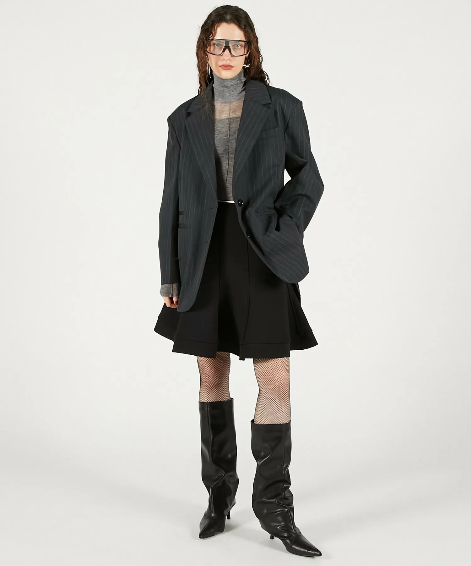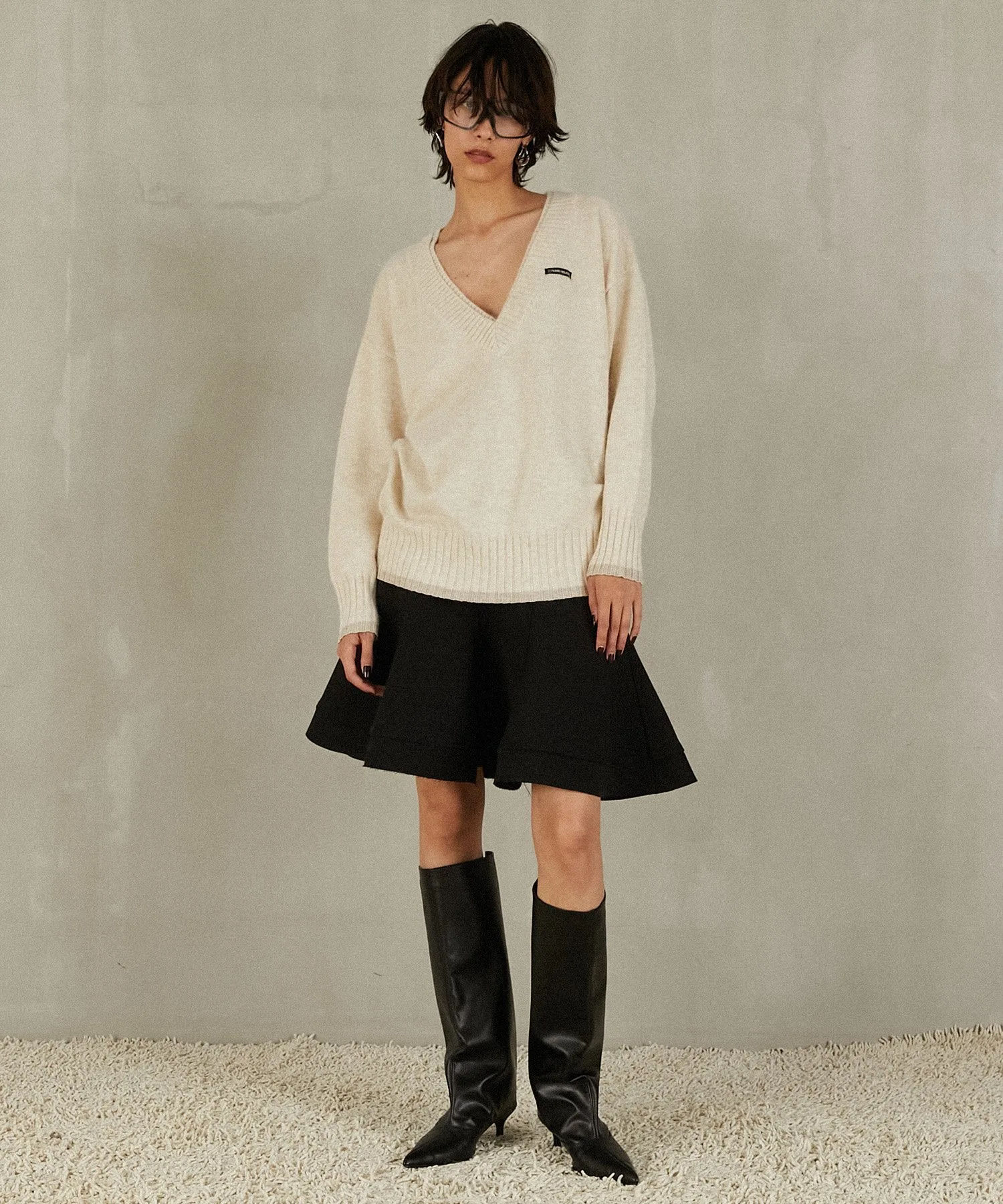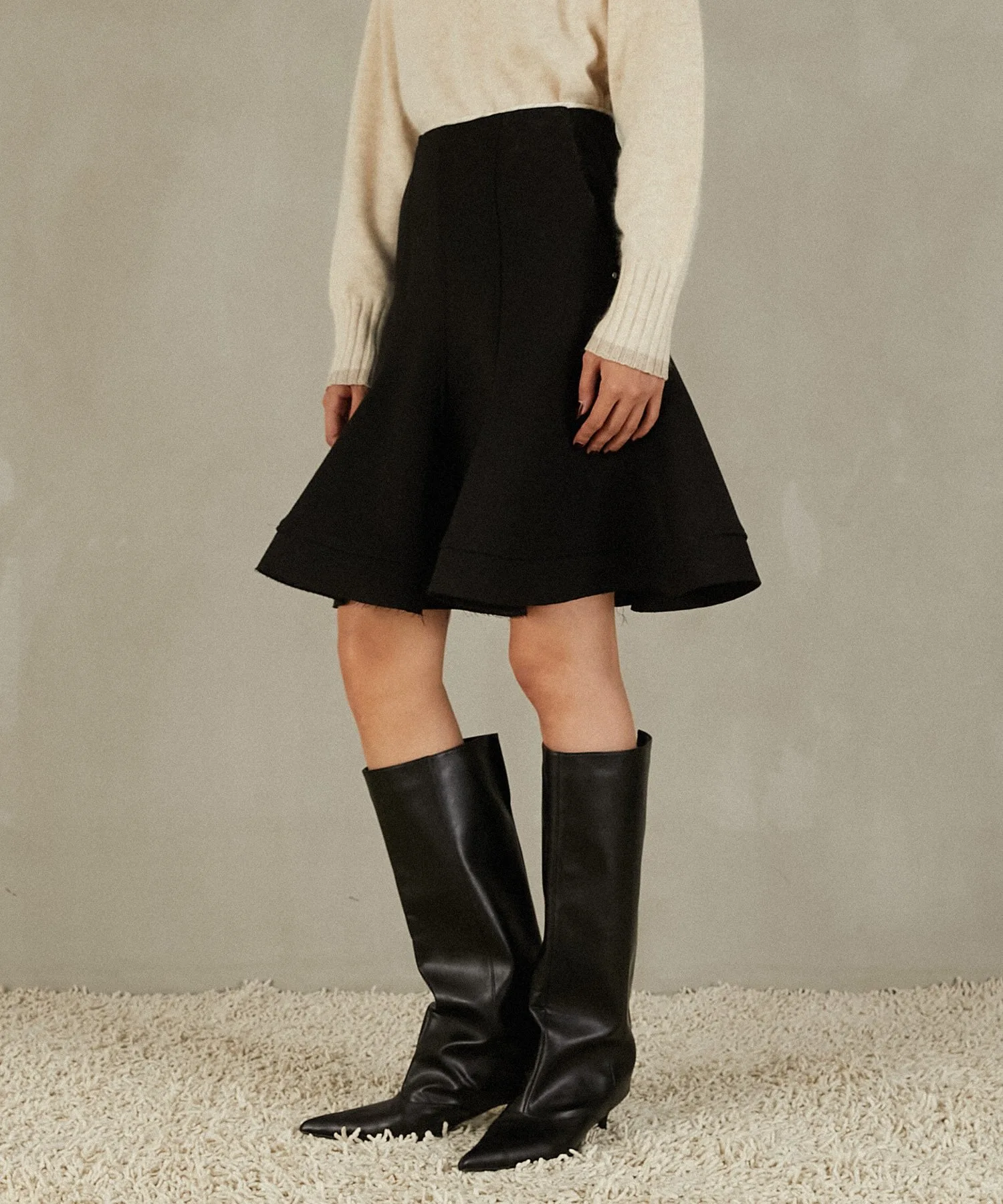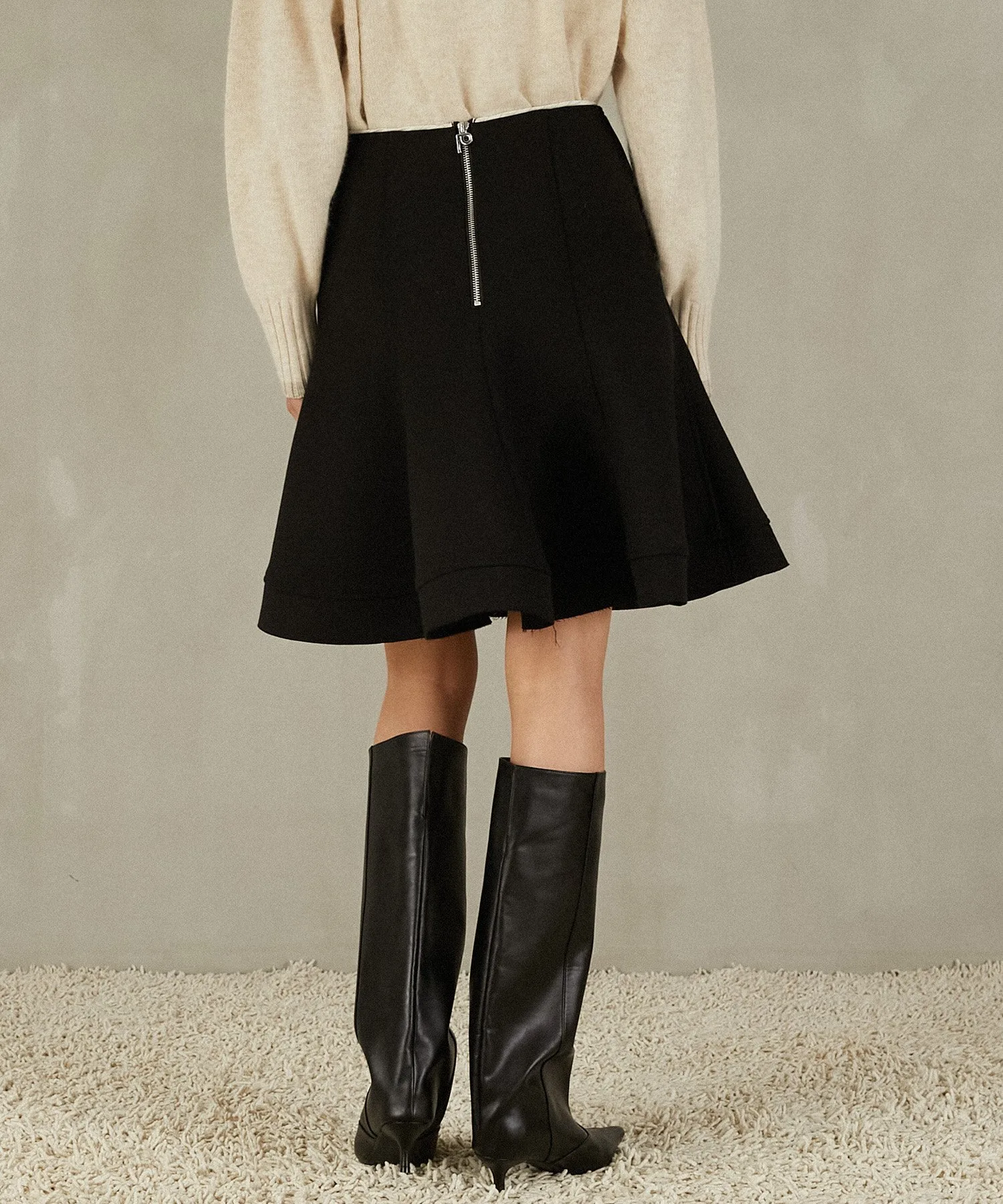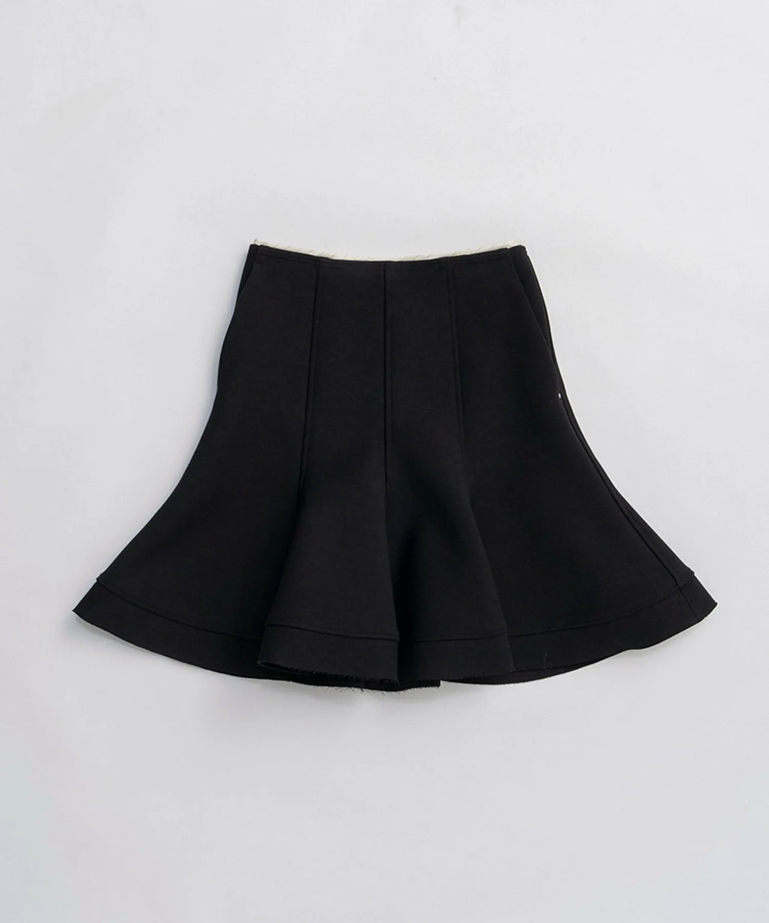 Расклешенная юбка с плотной, структурированной текстурой, достигаемой за счет пришивания подкладки с изнаночной стороны.