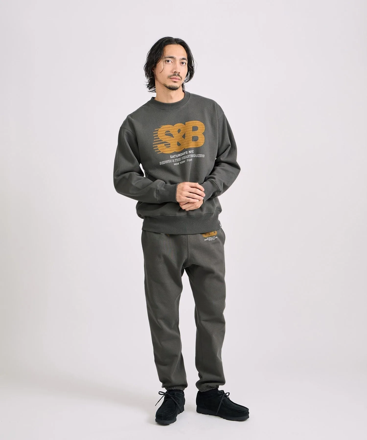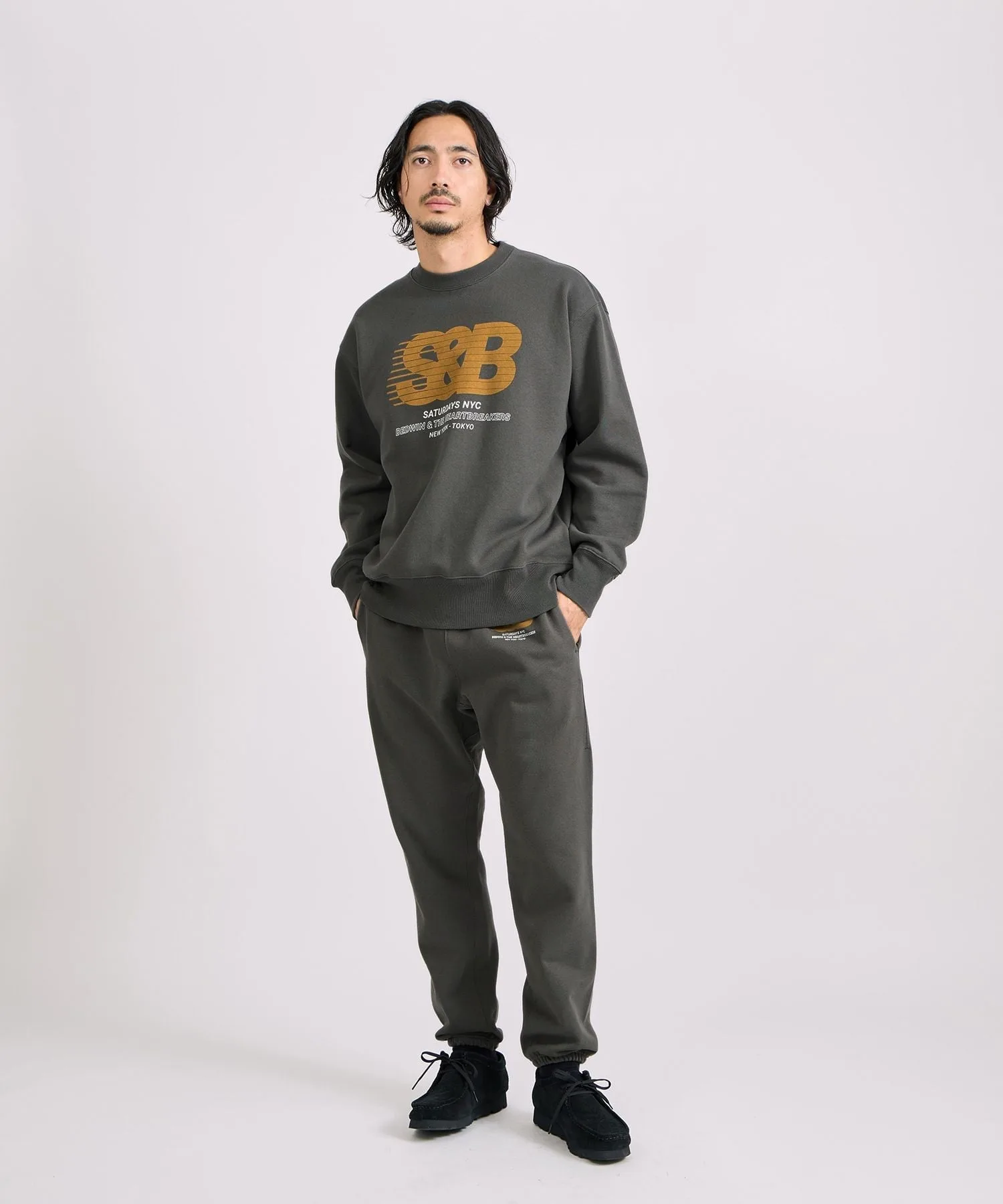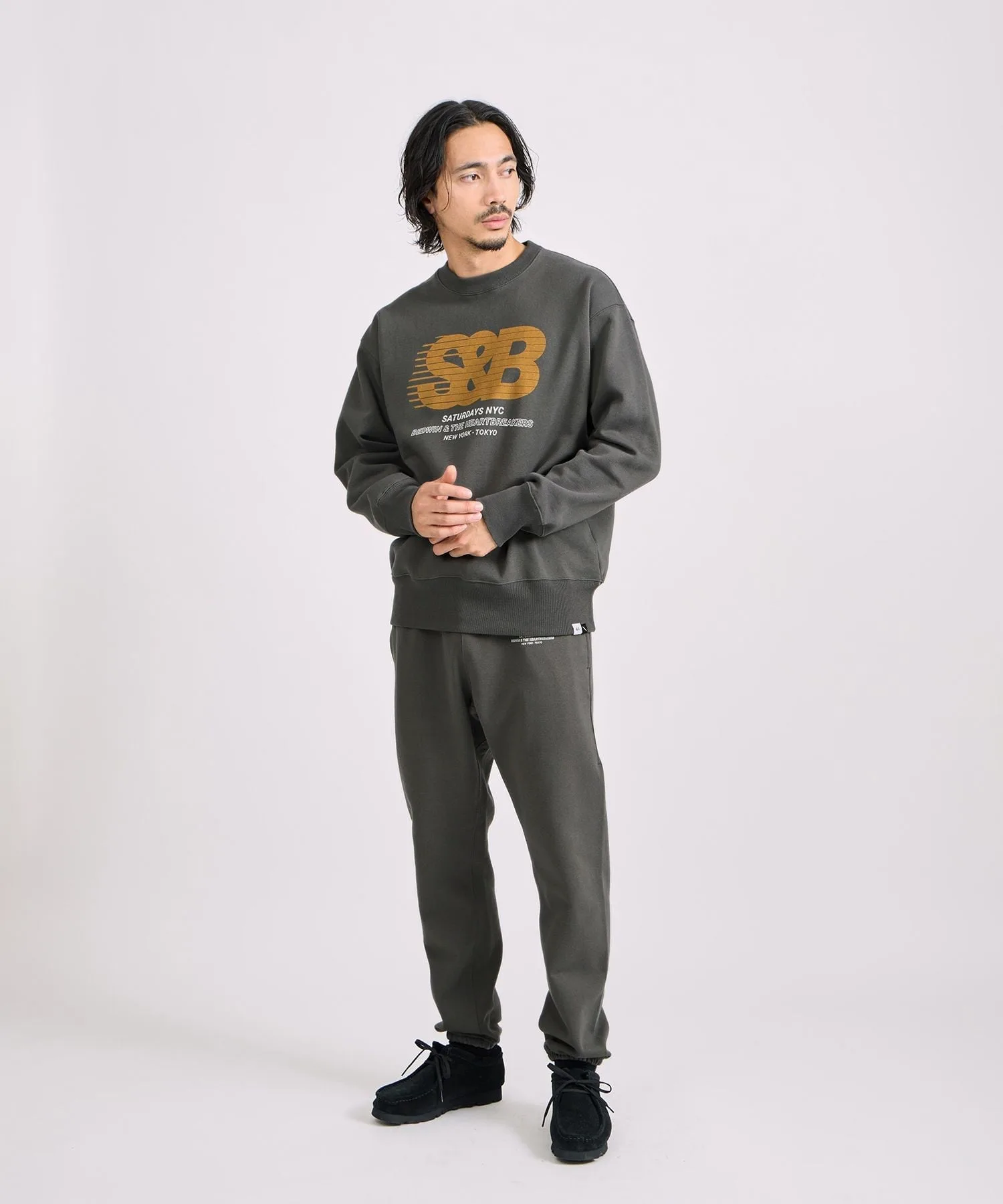 Графический рисунок на правой штанине символизирует сотрудничество: логотип BEDWIN наложен на косую черту SATURDAYS NYC.