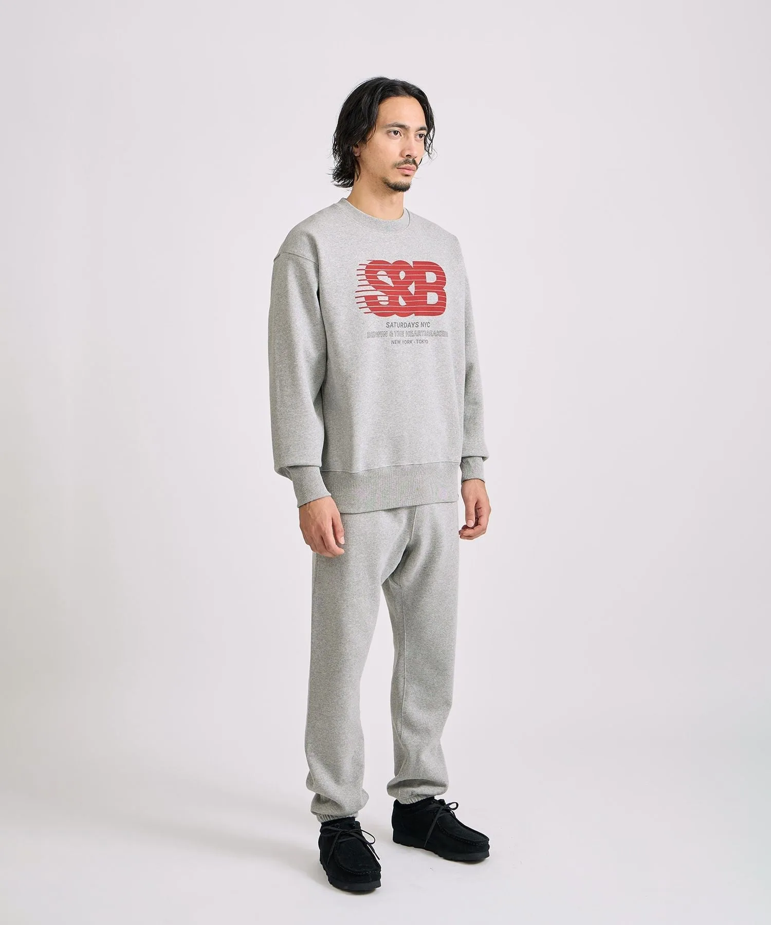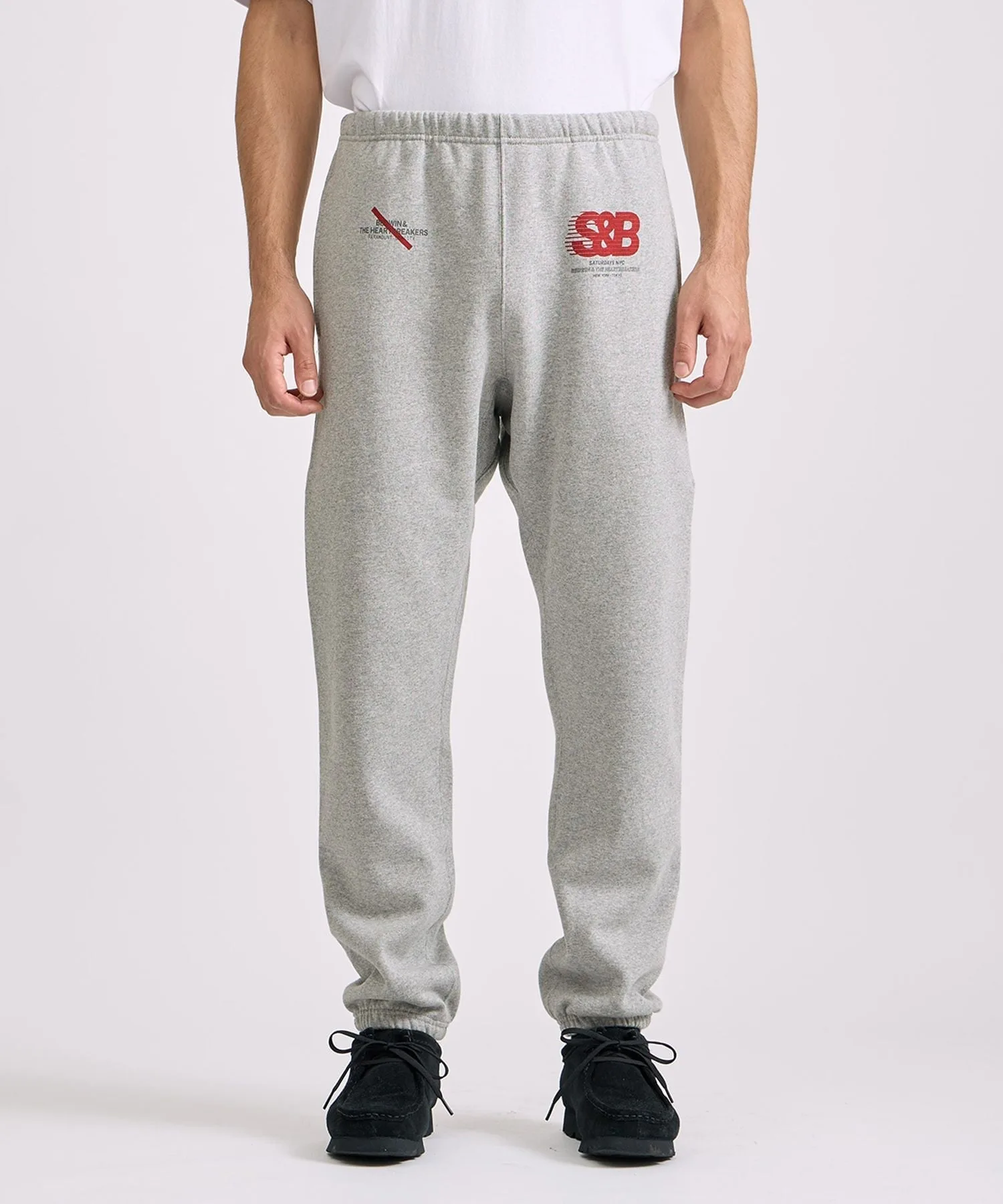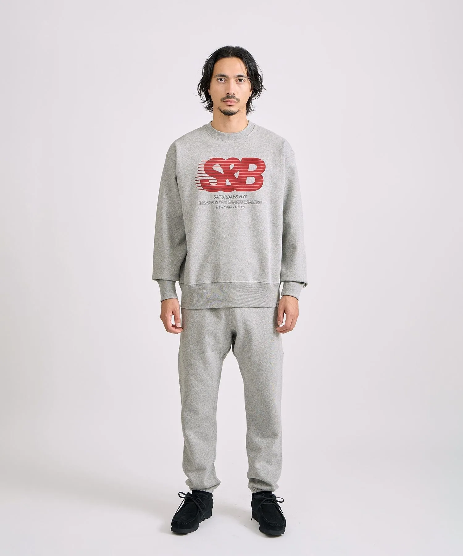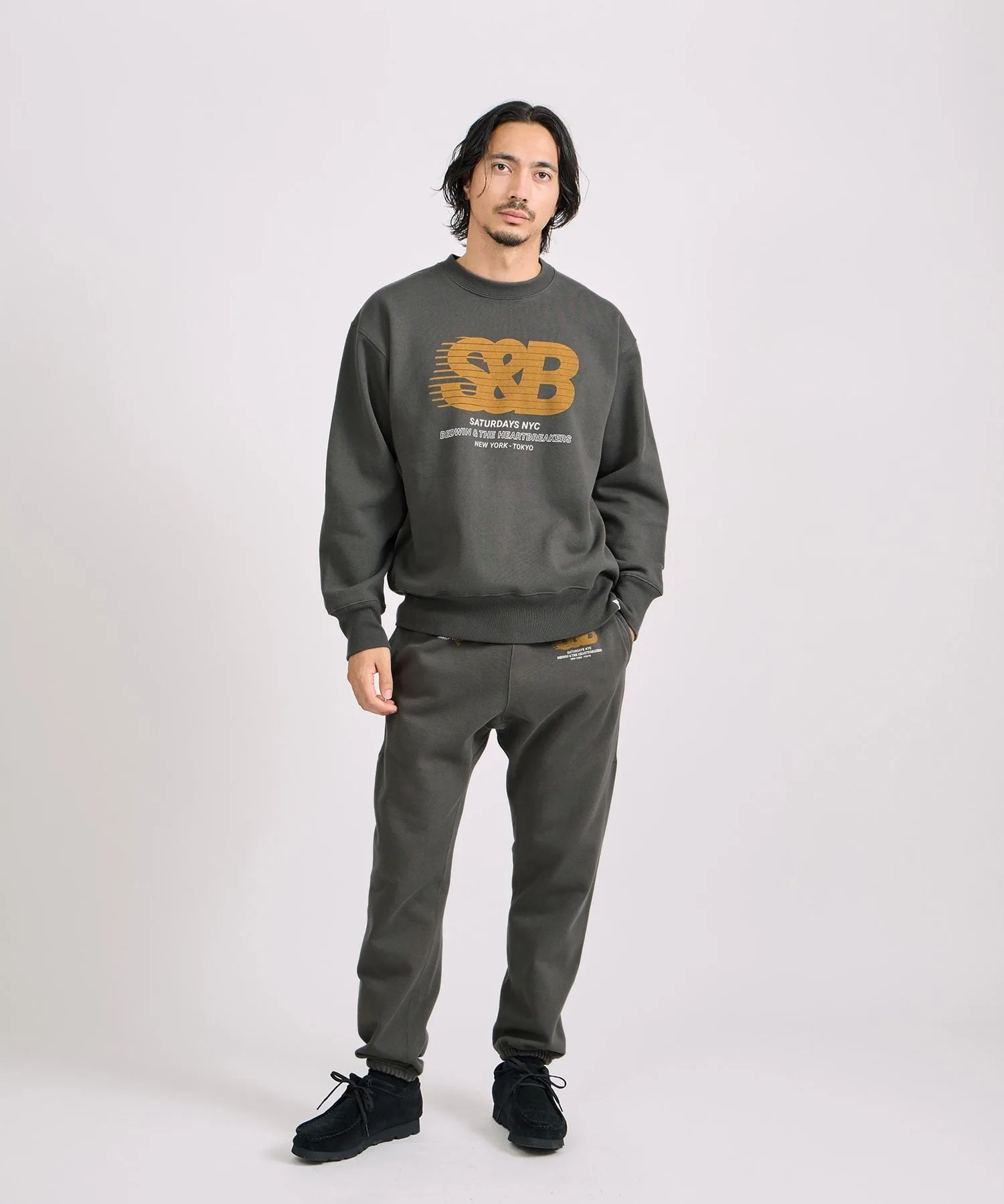 Графический рисунок на правой штанине символизирует сотрудничество: логотип BEDWIN наложен на косую черту SATURDAYS NYC.