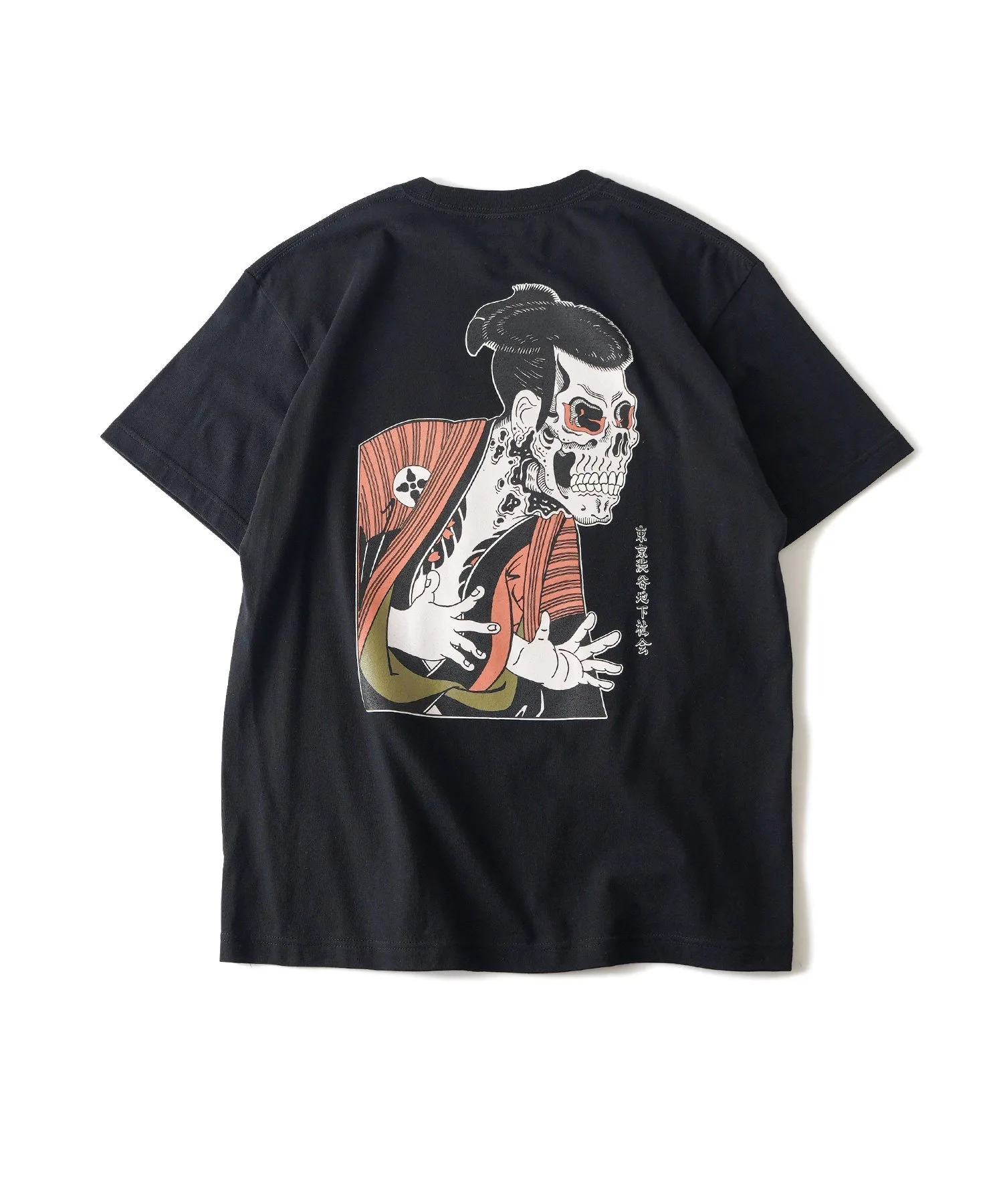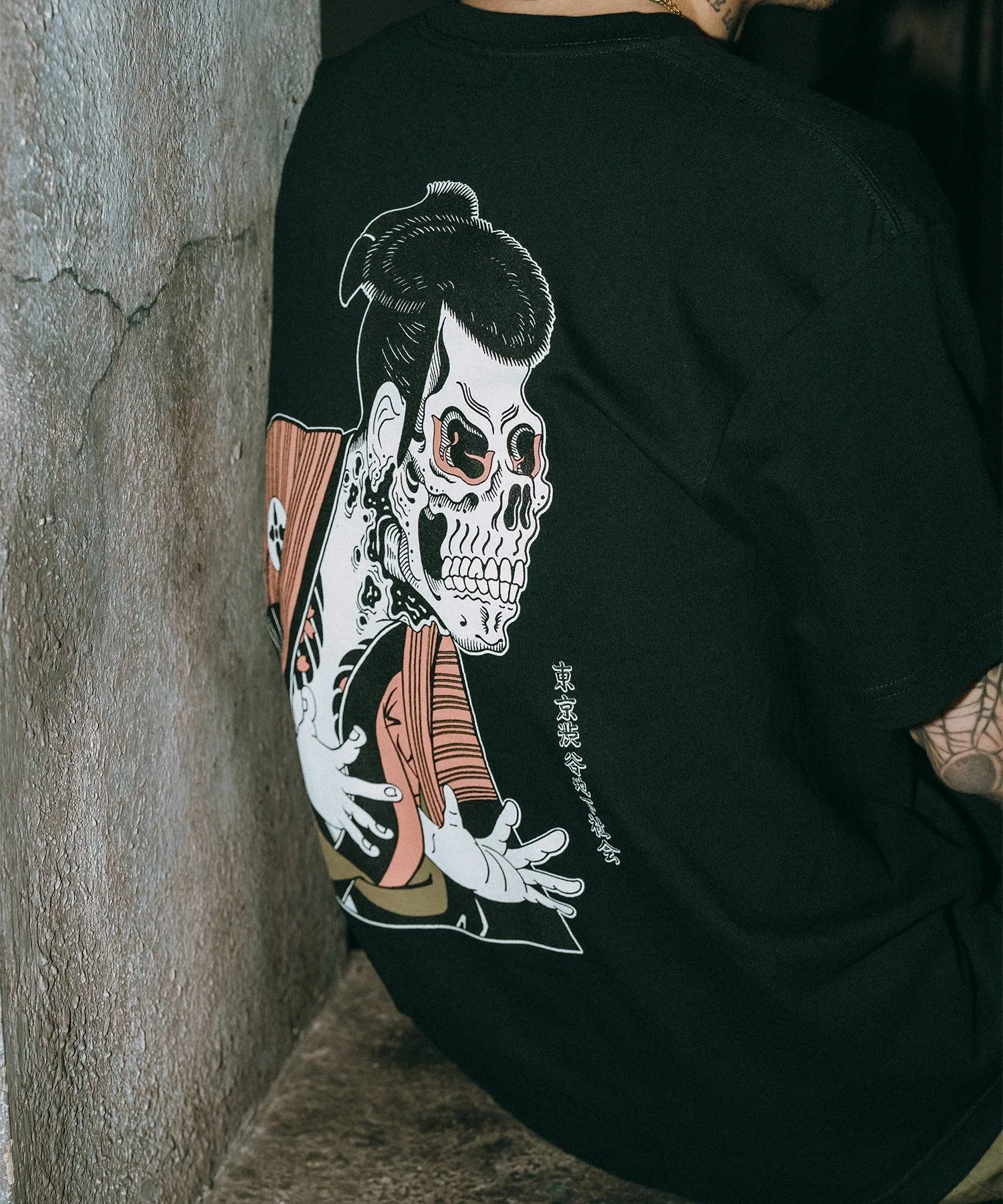 Футболка с принтом, изображающим черепа на знаменитом рисунке укиё-э «Эдобэй III» Отани Онидзи работы Тосюсая Шараку, представленном брендом.