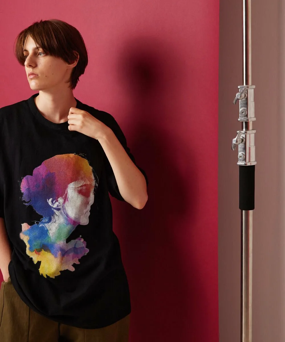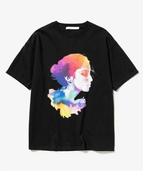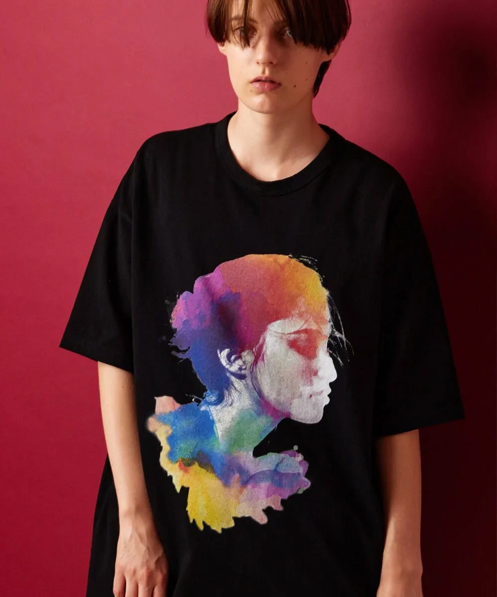 Это футболка с графическим принтом, на лицевой стороне которой изображен коллаж из акварельных картин и фотографий. Текстура рисунка передана с помощью струйной печати.