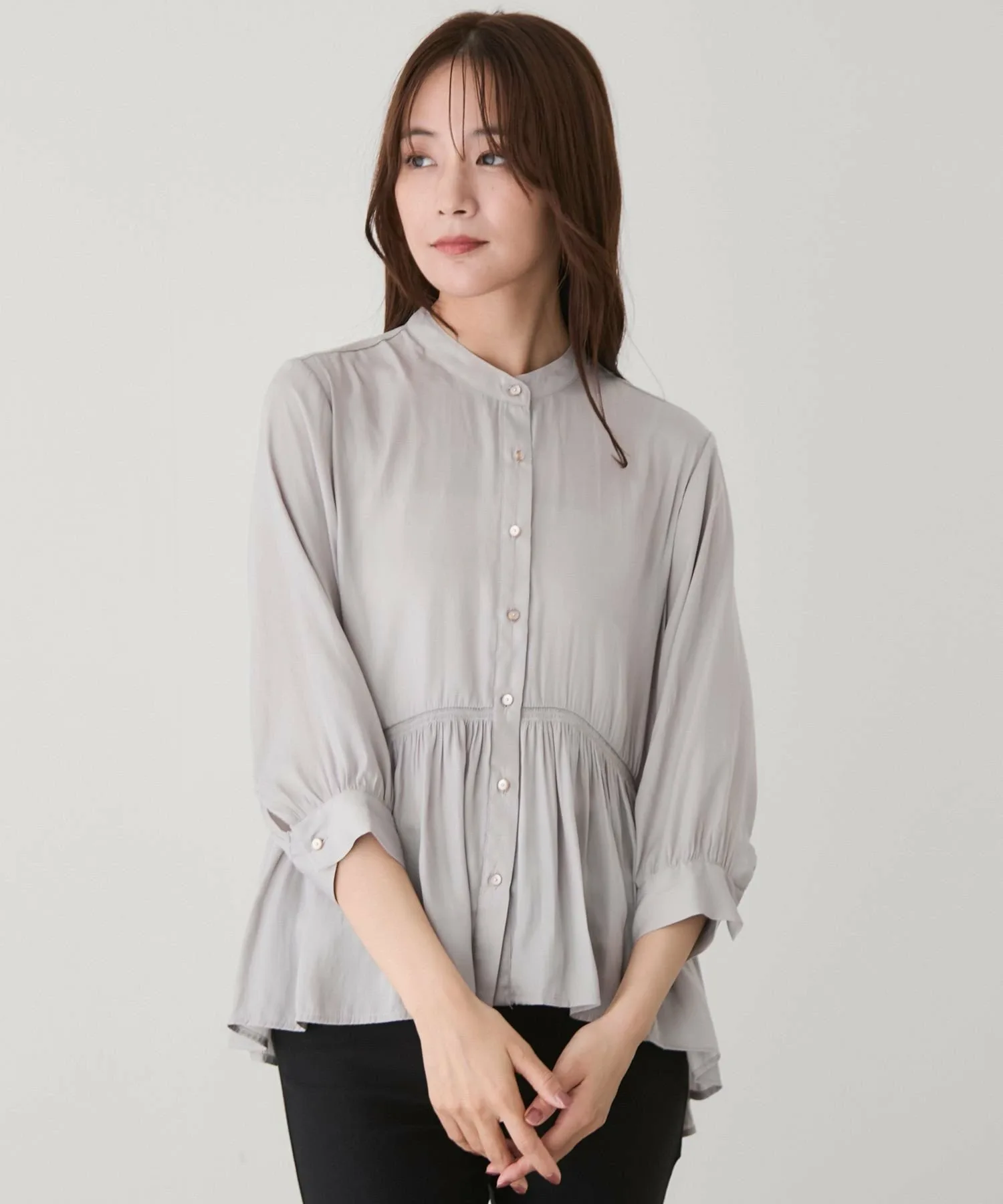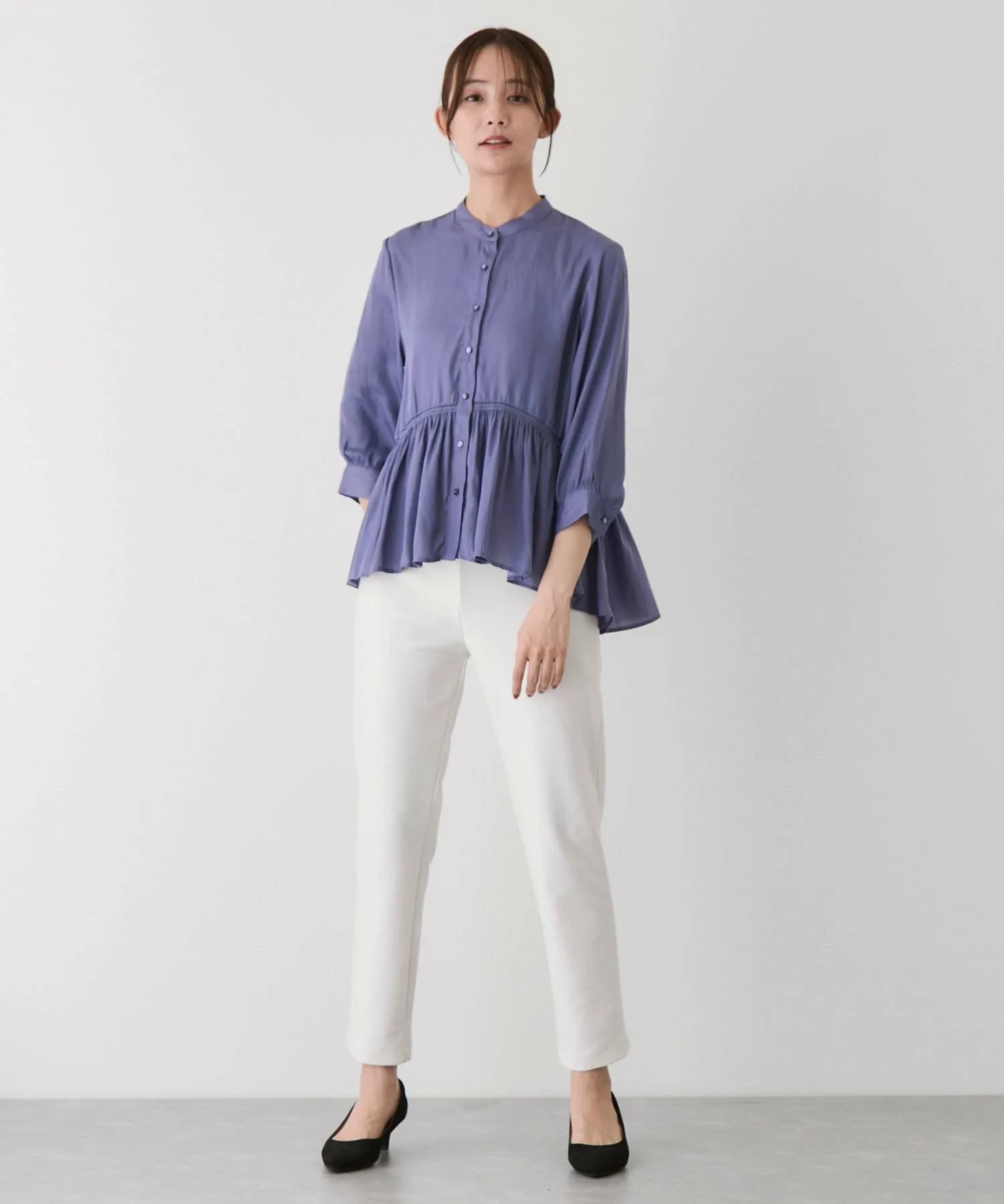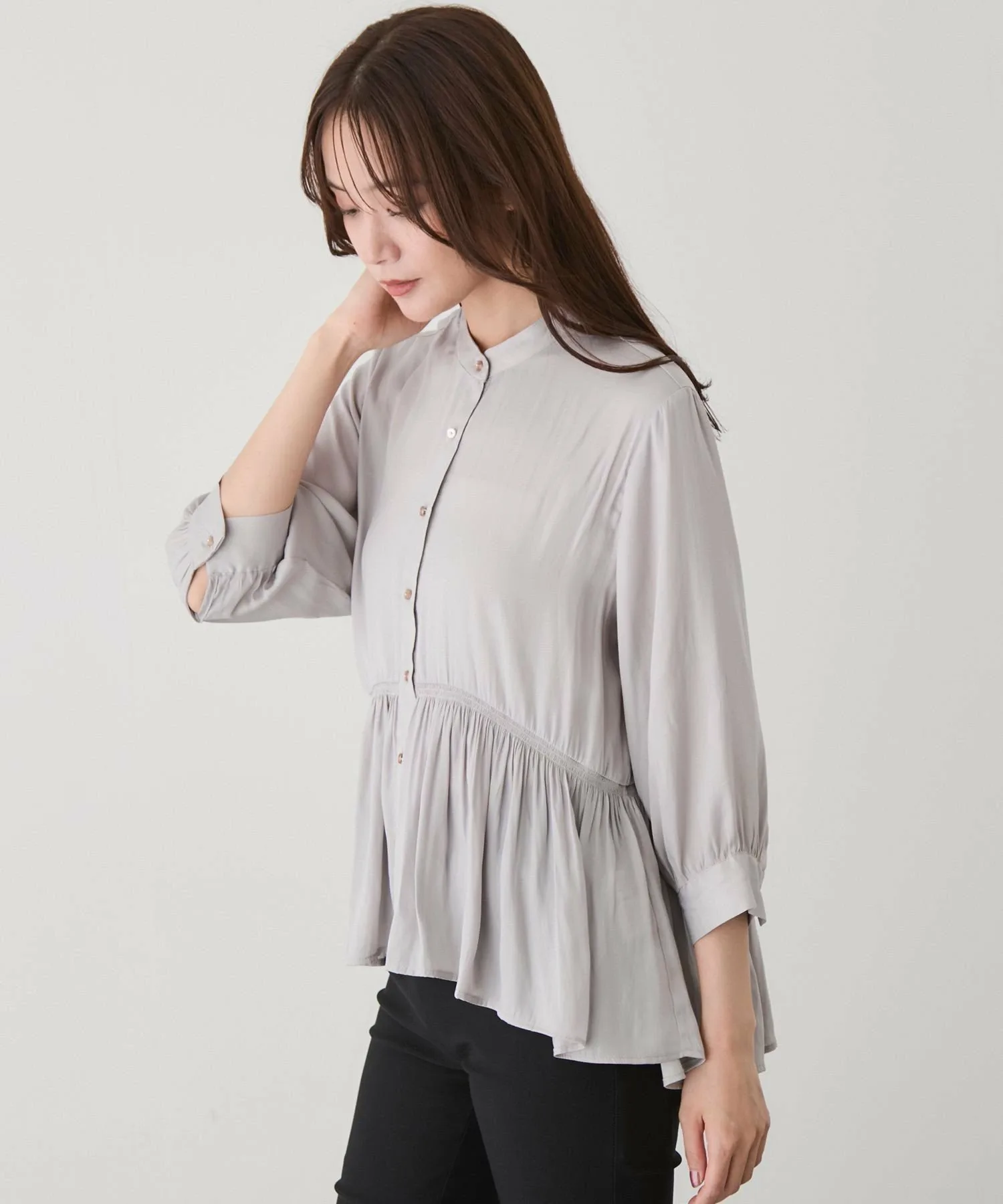 - Длина подола, отличающаяся спереди и сзади, создает изысканный вид даже в расстегнутом виде и добавляет легкости и непринужденности.