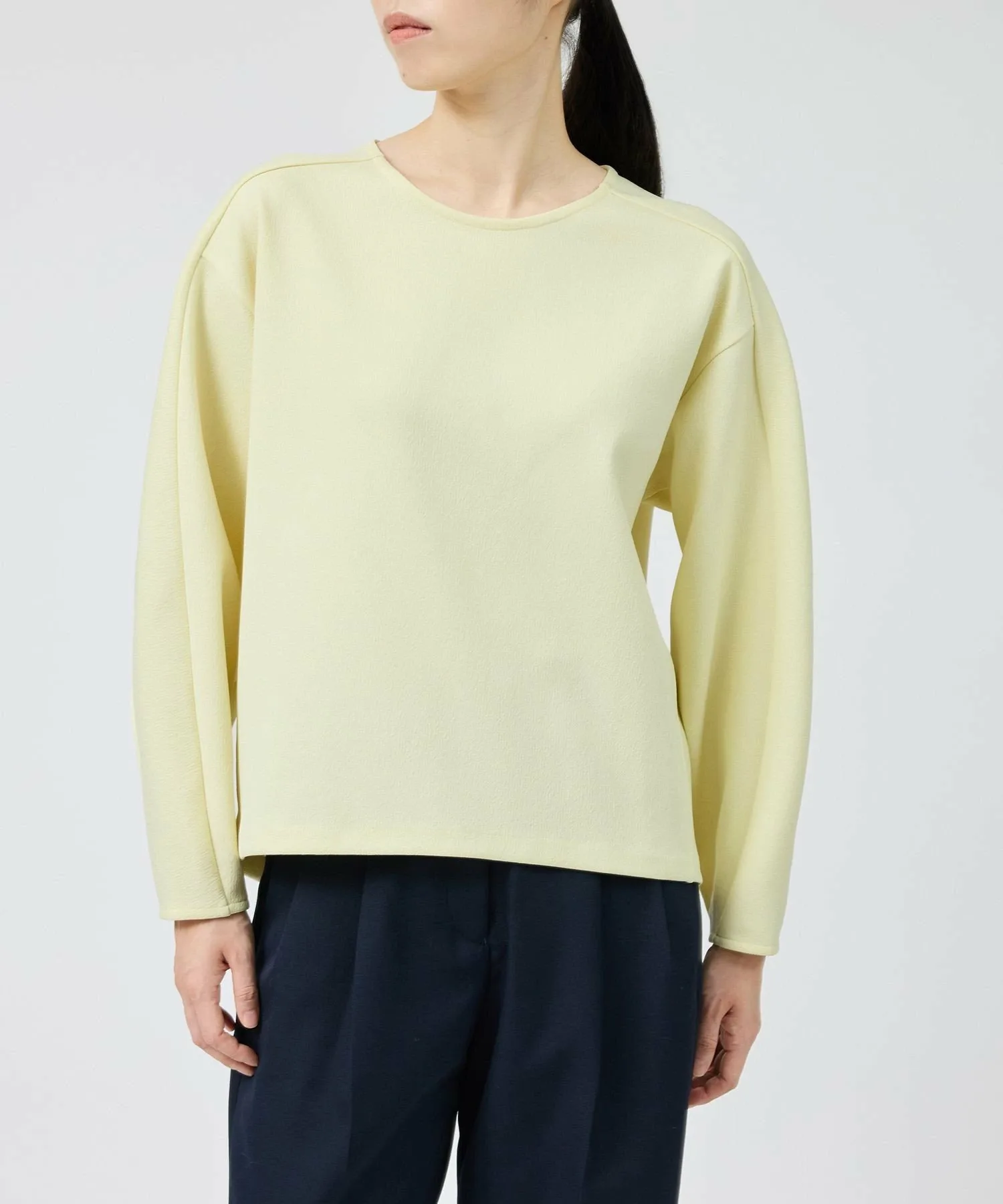 Этот топ изготовлен из полиэстера, частично переработанного из ПЭТ-бутылок, собранных в Японии. Он выполнен из трикотажа, похожего на картон (пушистая ткань, напоминающая картон), обеспечивающая оптимальную толщину и удобную посадку. Жаккардовое плетение создает разный вид спереди и сзади. Передняя часть имеет текстурированную, похожую на трикотаж поверхность, а задняя — плоскую и гладкую. Этот универсальный материал можно носить круглый год, и его можно комбинировать с другими вещами.