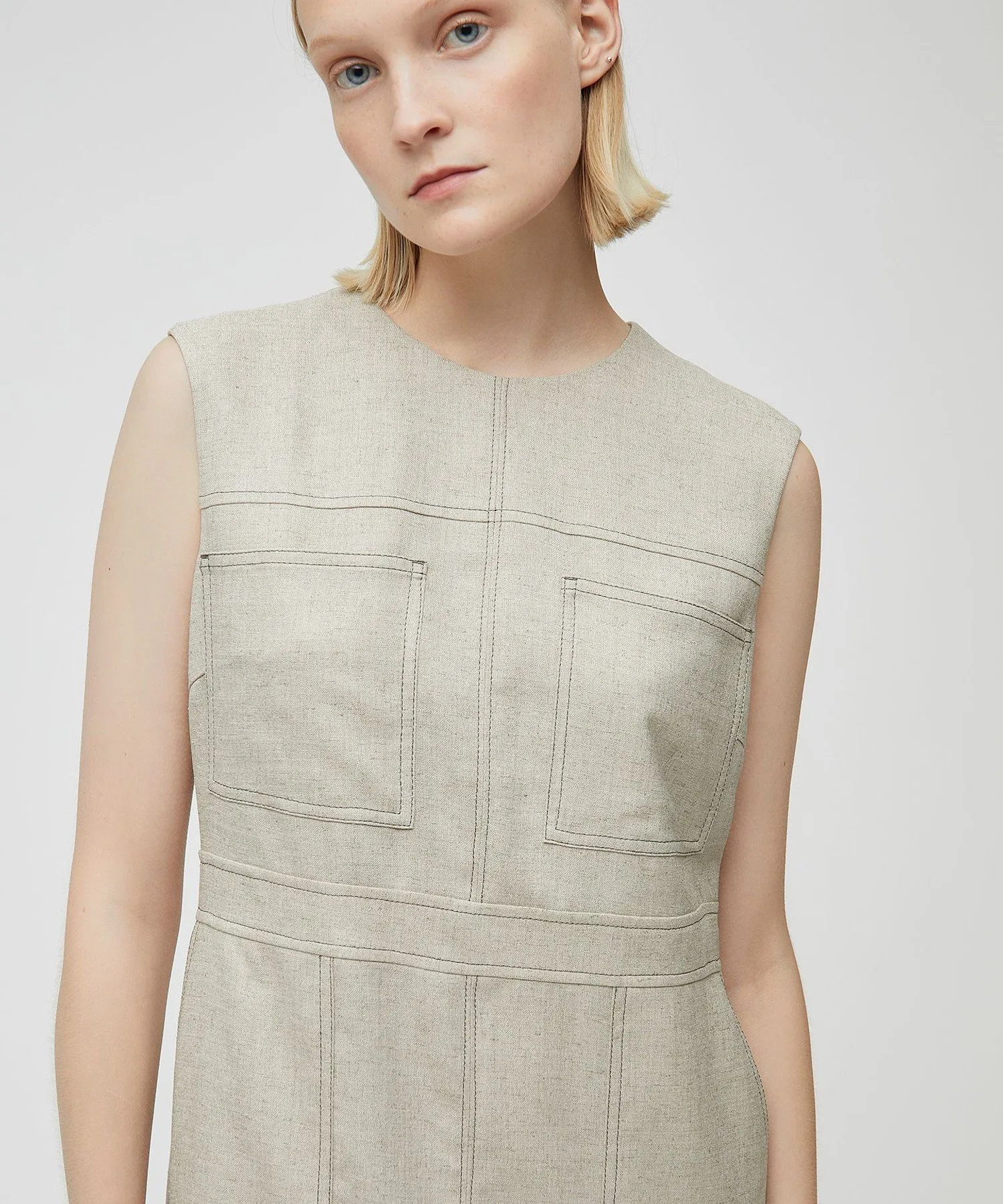 Это платье имеет высокую талию и четкий силуэт, который выгодно подчеркивает фигуру. Рекомендуем носить его отдельно в предстоящем сезоне. Также можно носить его в комплекте с жакетом из того же материала.