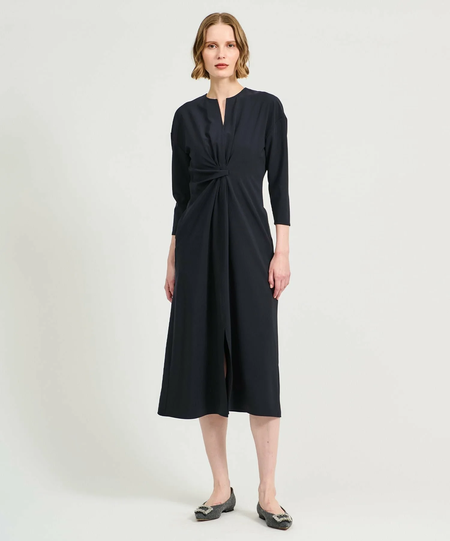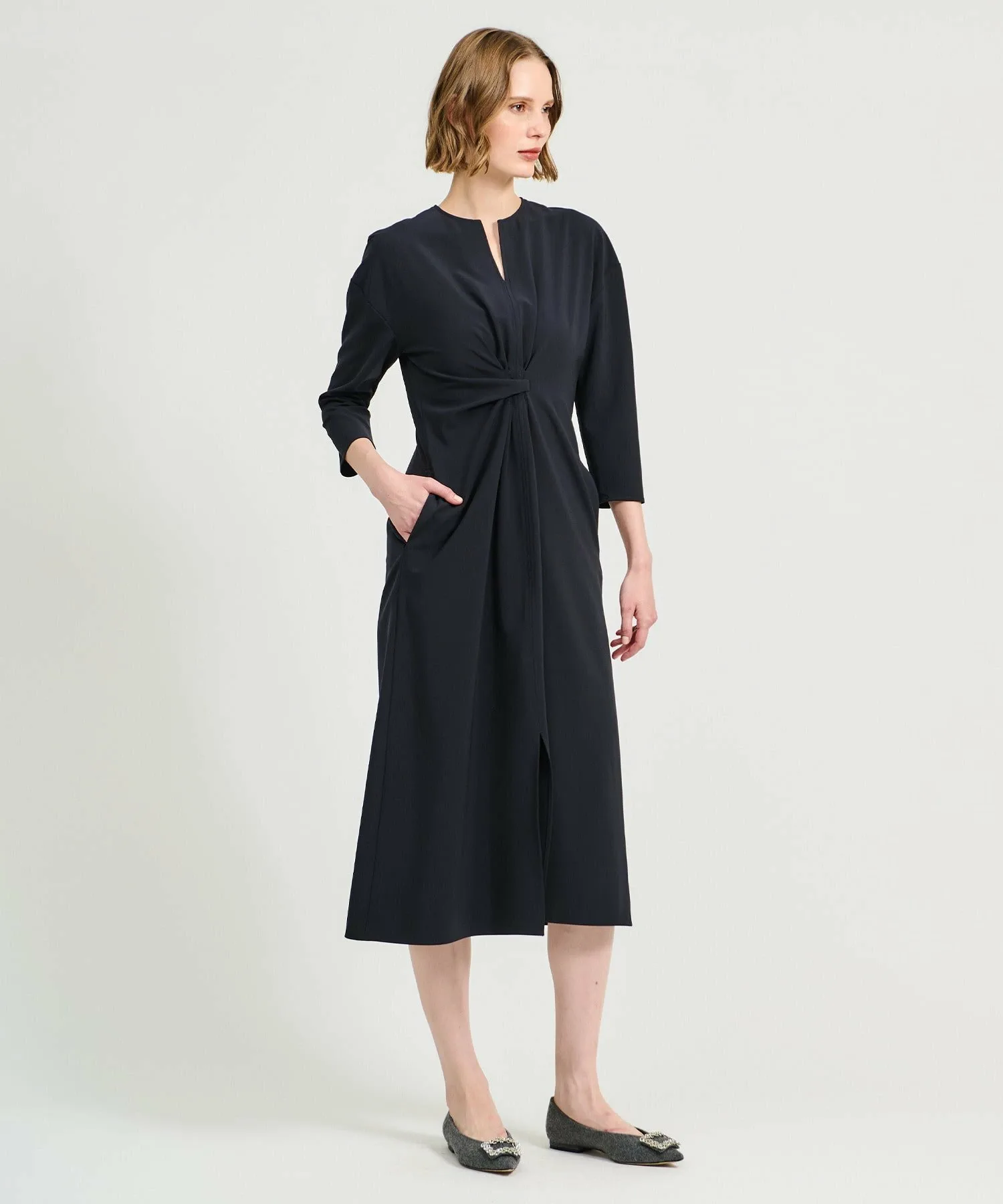 Элегантное платье с оригинальным перекрученным дизайном спереди.