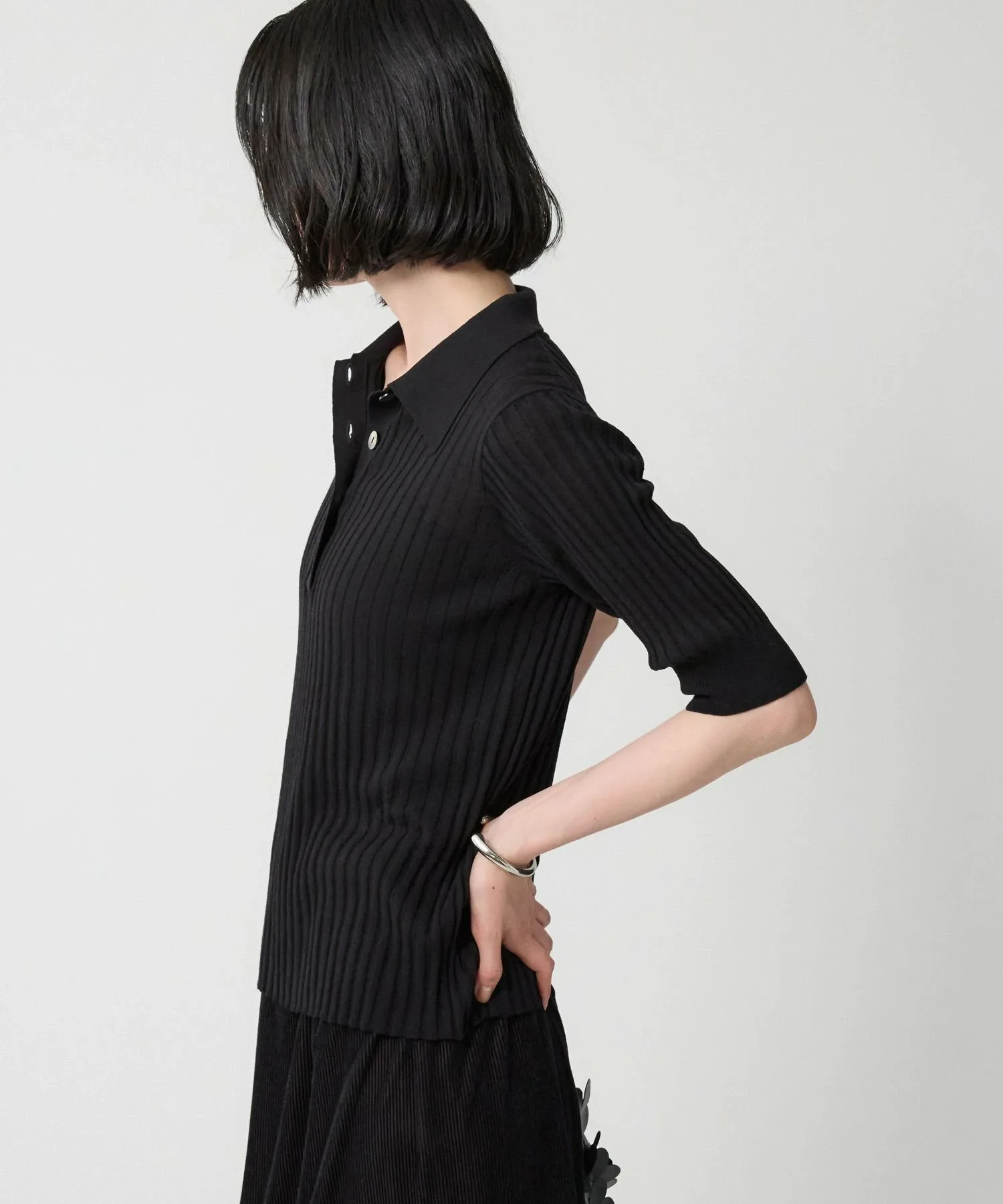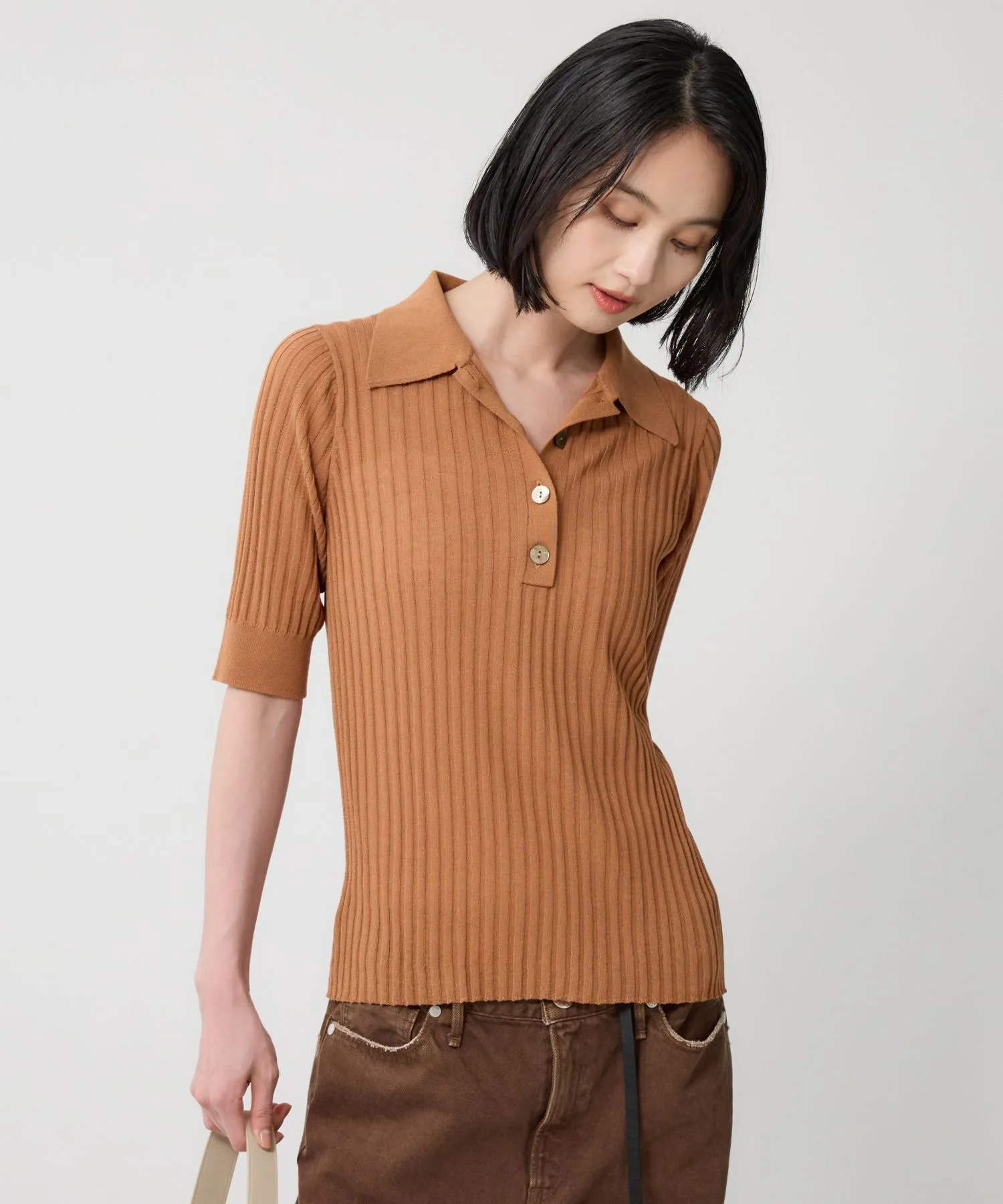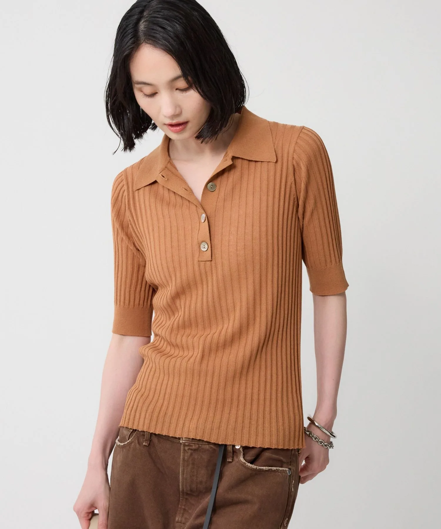 Поло из трикотажа в широкую резинку, создающее изысканный базовый образ