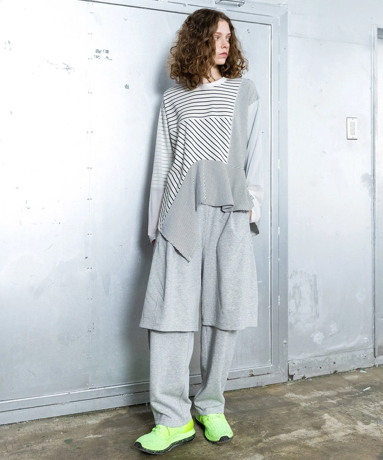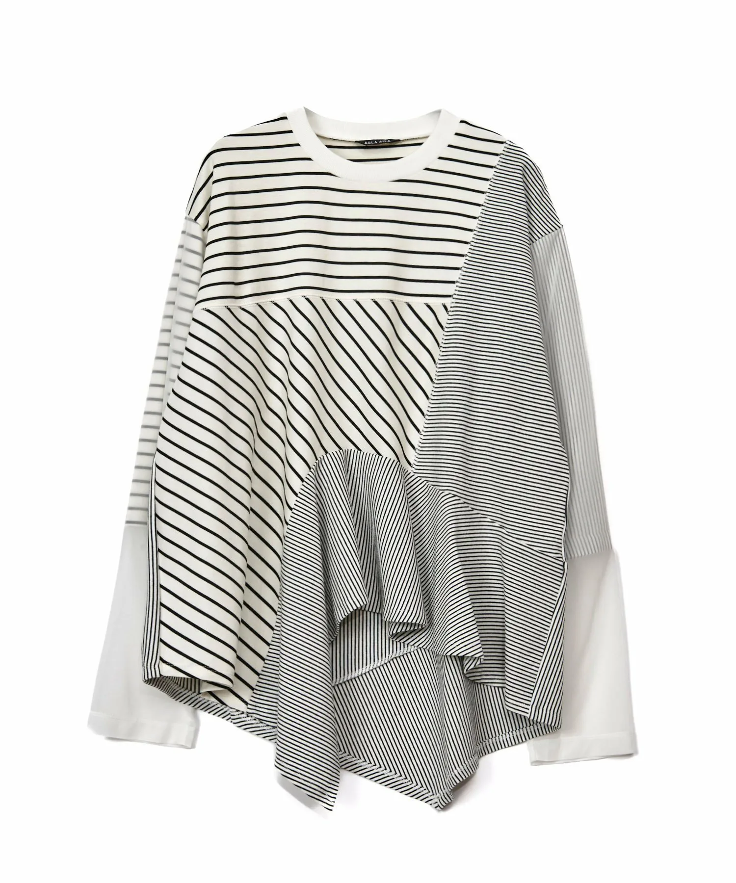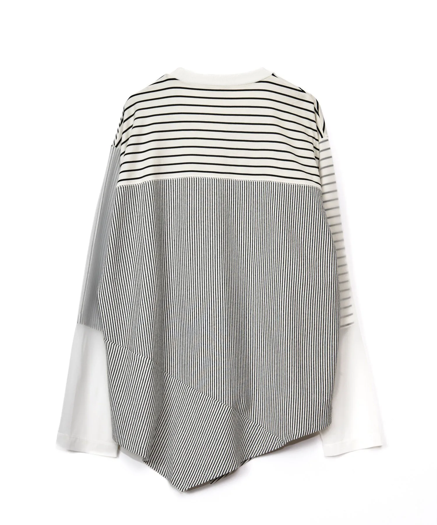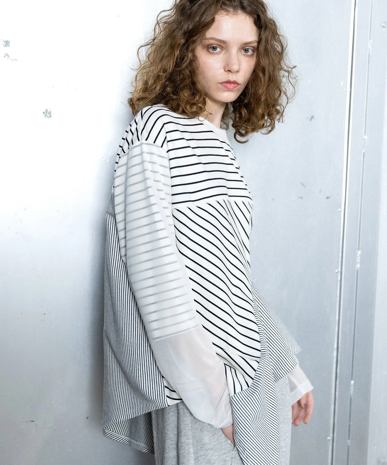 Длинная футболка с двумя видами каймы разной толщины, на рукавах из прозрачного трикотажа.
