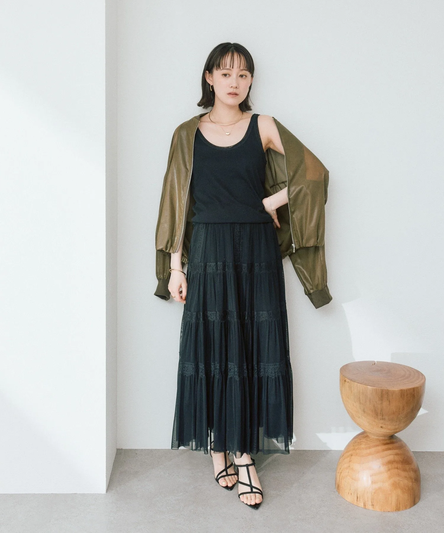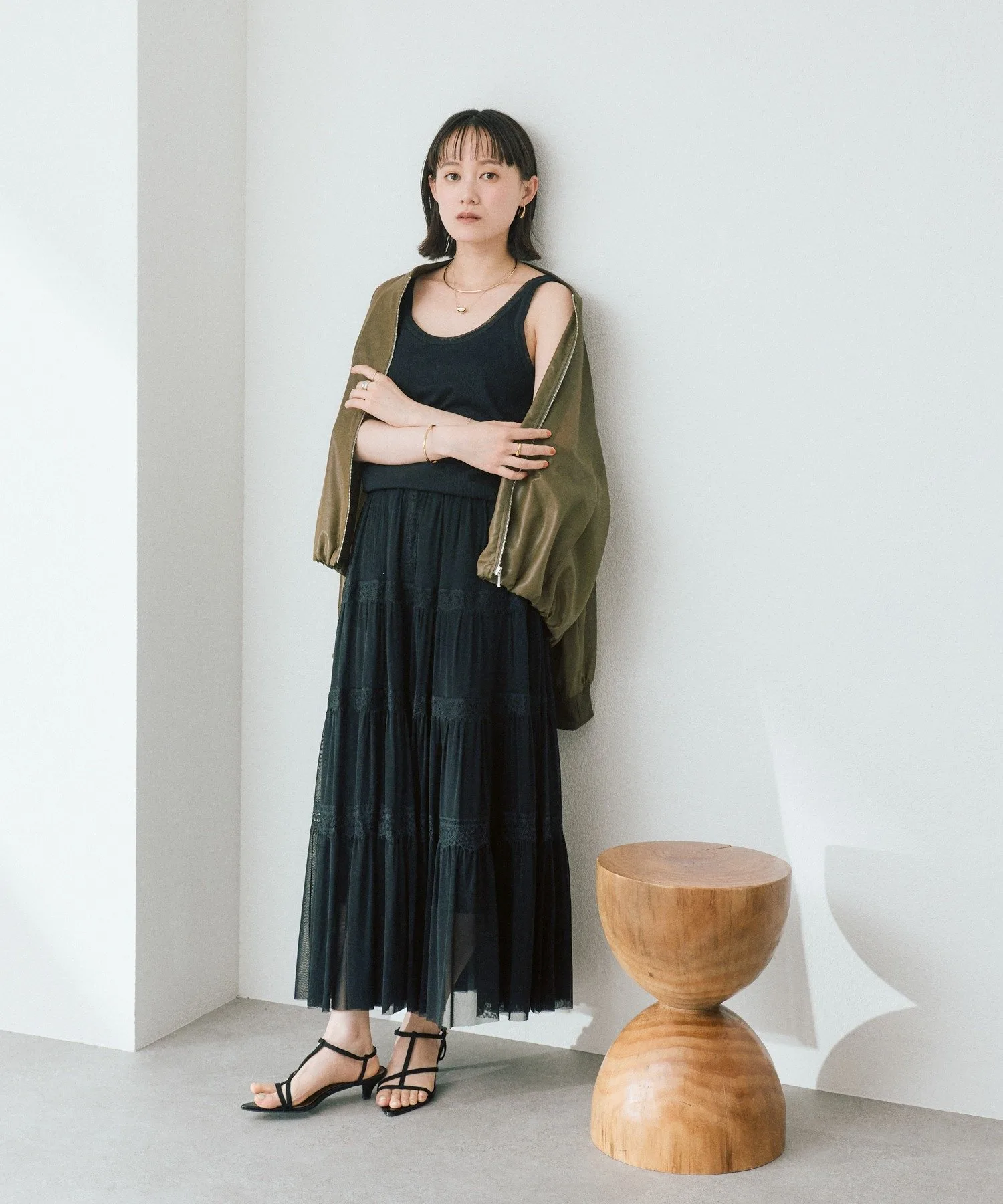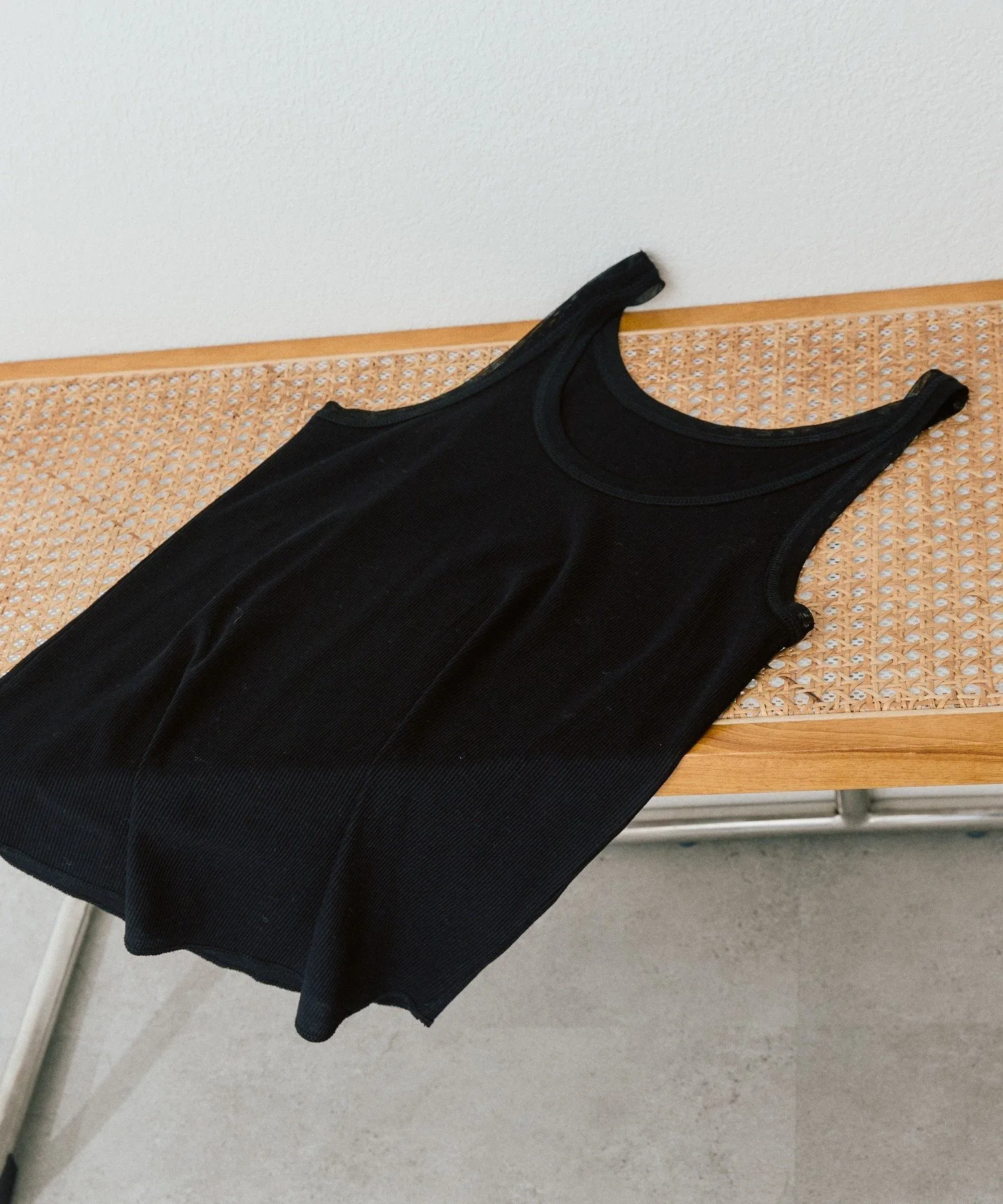 - Майка, которая отлично смотрится как топ, с отделкой из тюля в качестве изюминки.