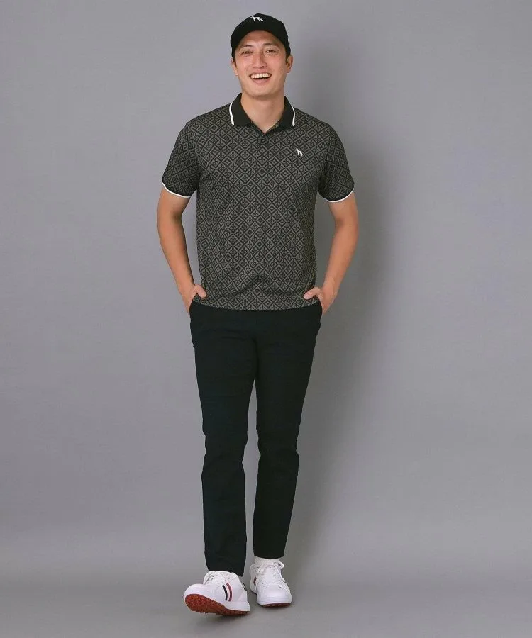 Поло с короткими рукавами, полосатым ребристым воротником в тон и элегантным геральдическим принтом
