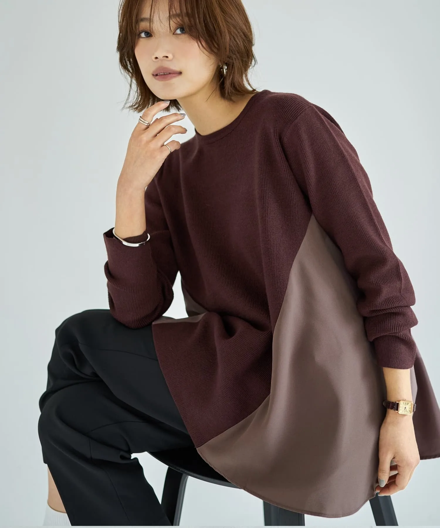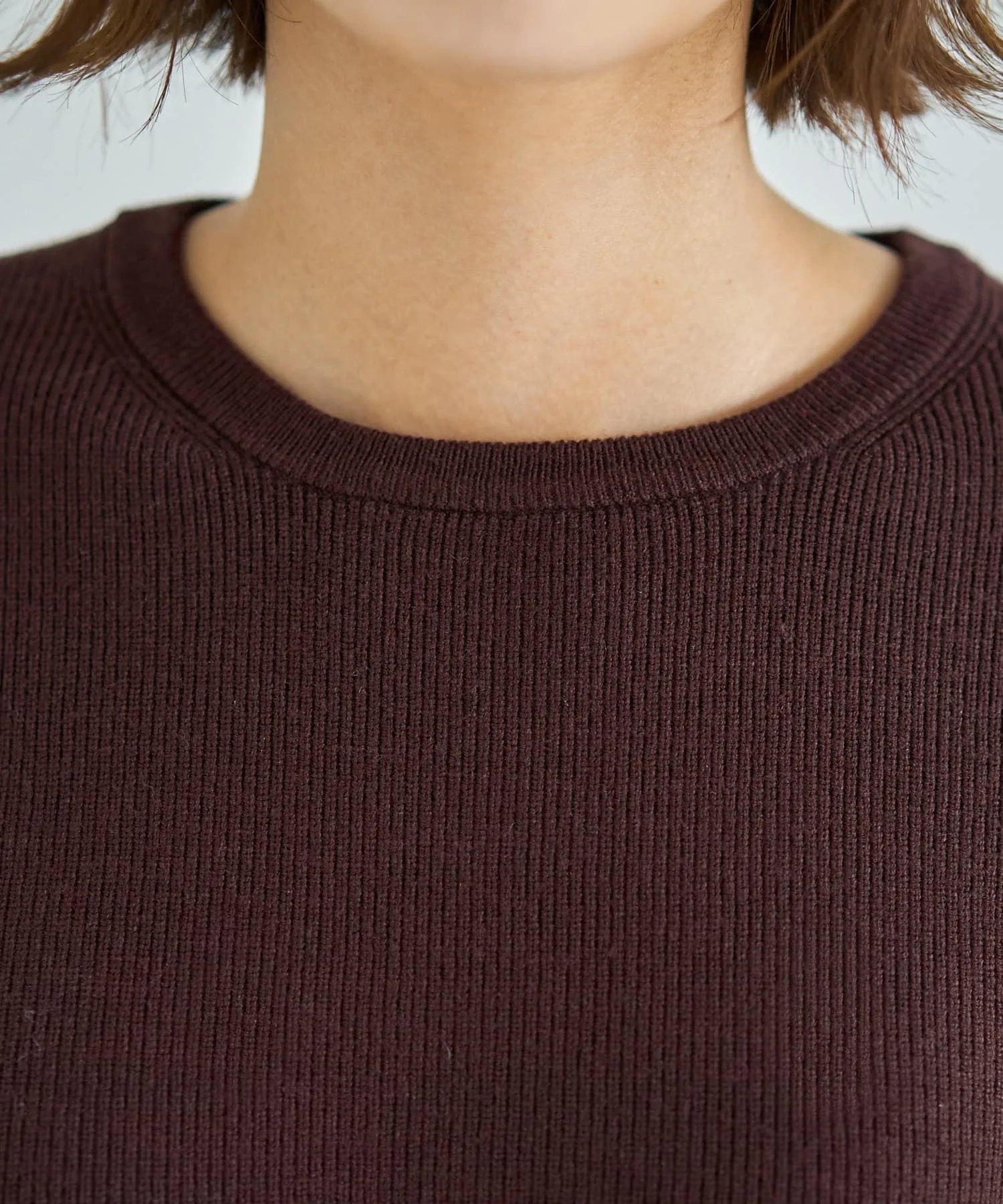 Трикотажная ткань, гладкая, плотная и шелковистая на ощупь. Это трикотаж средней плотности с легким блеском, придающим изделию расслабленный, аккуратный вид, не слишком формальный.