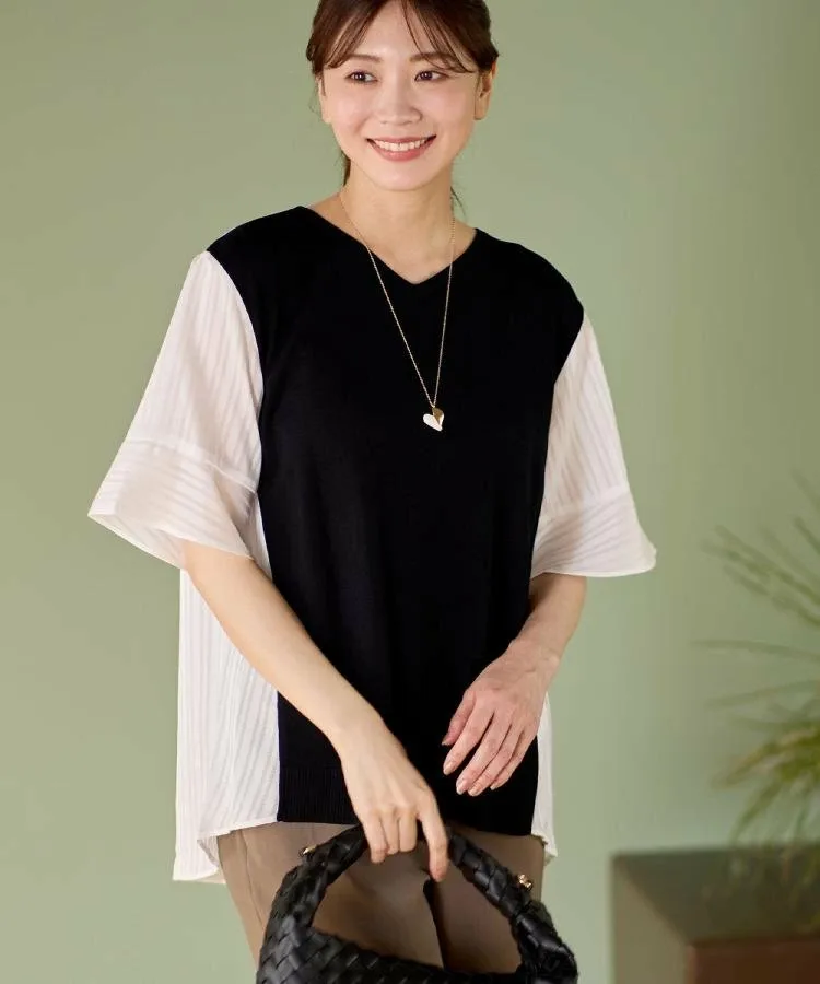 Двухцветный вязаный пуловер из трикотажной и тканой ткани.