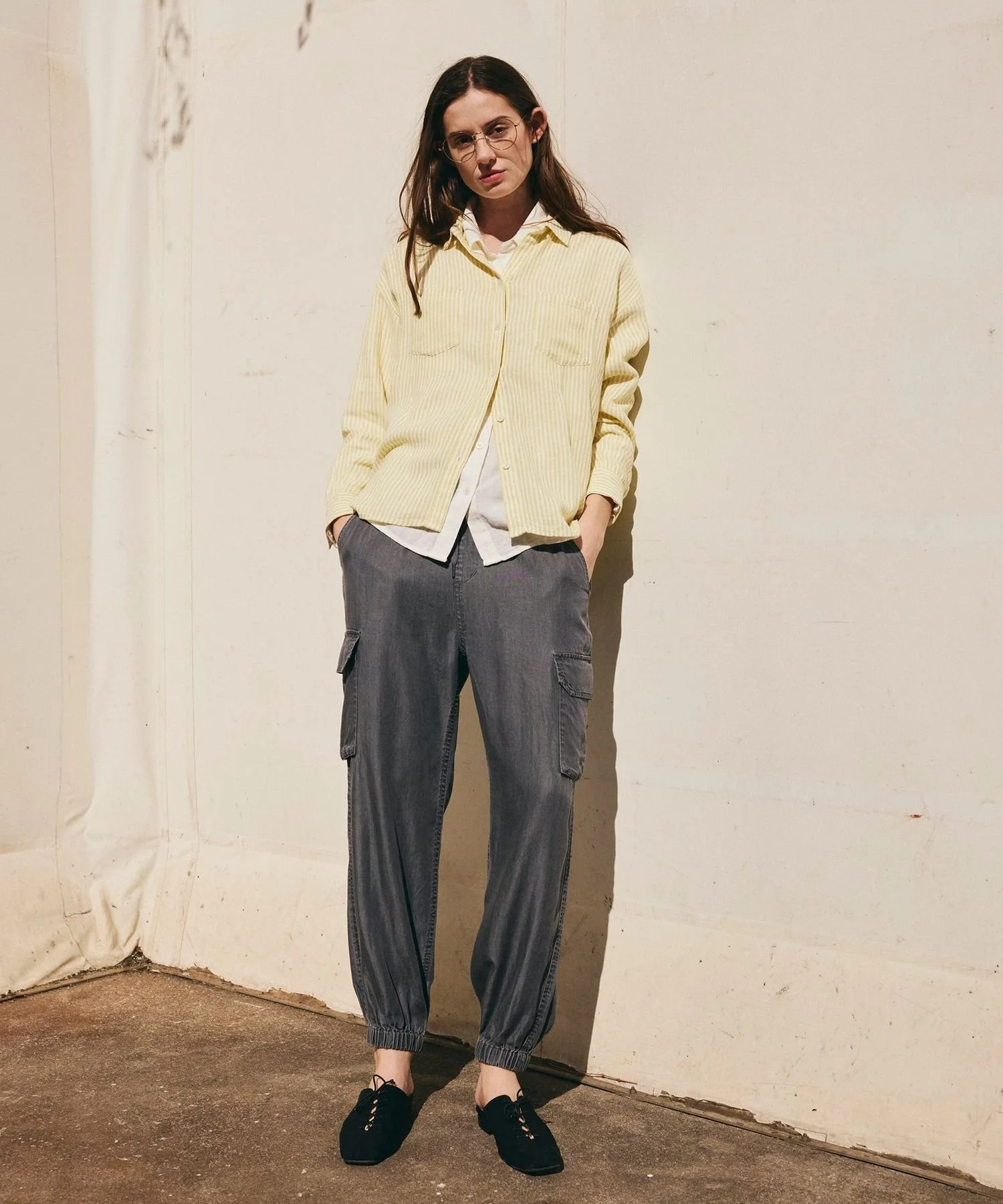 Рекомендуем сочетать их с футболкой с логотипом. Хотя это брюки-карго, полупрямой силуэт позволяет создать более повседневный образ.
