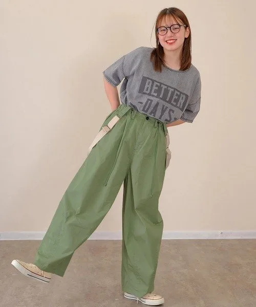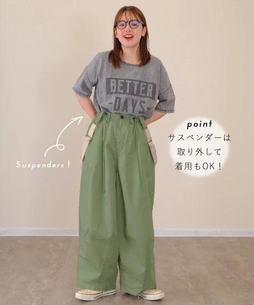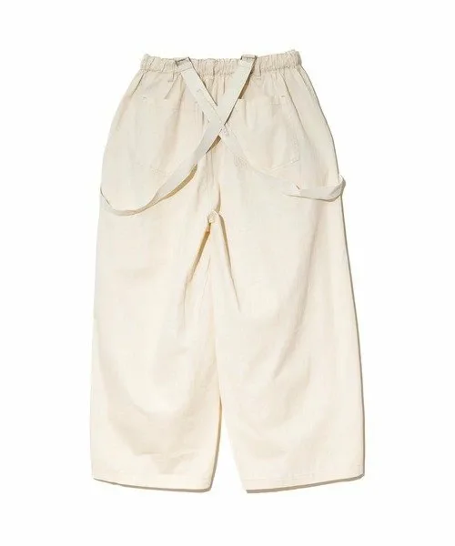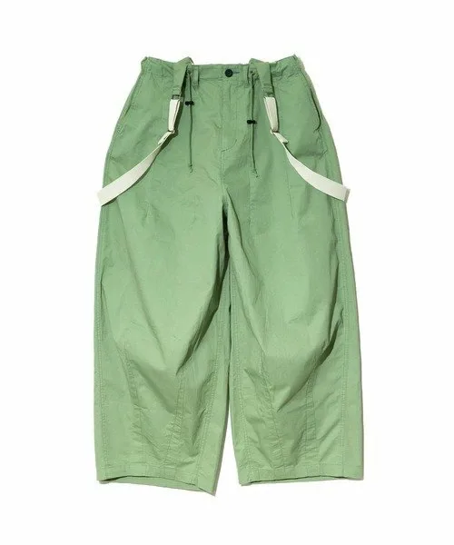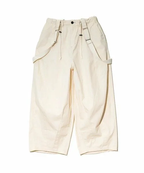 Брюки с округлым силуэтом, открывающим колени. Подтяжки можно носить на плечах или снимать, что позволяет создавать множество образов.