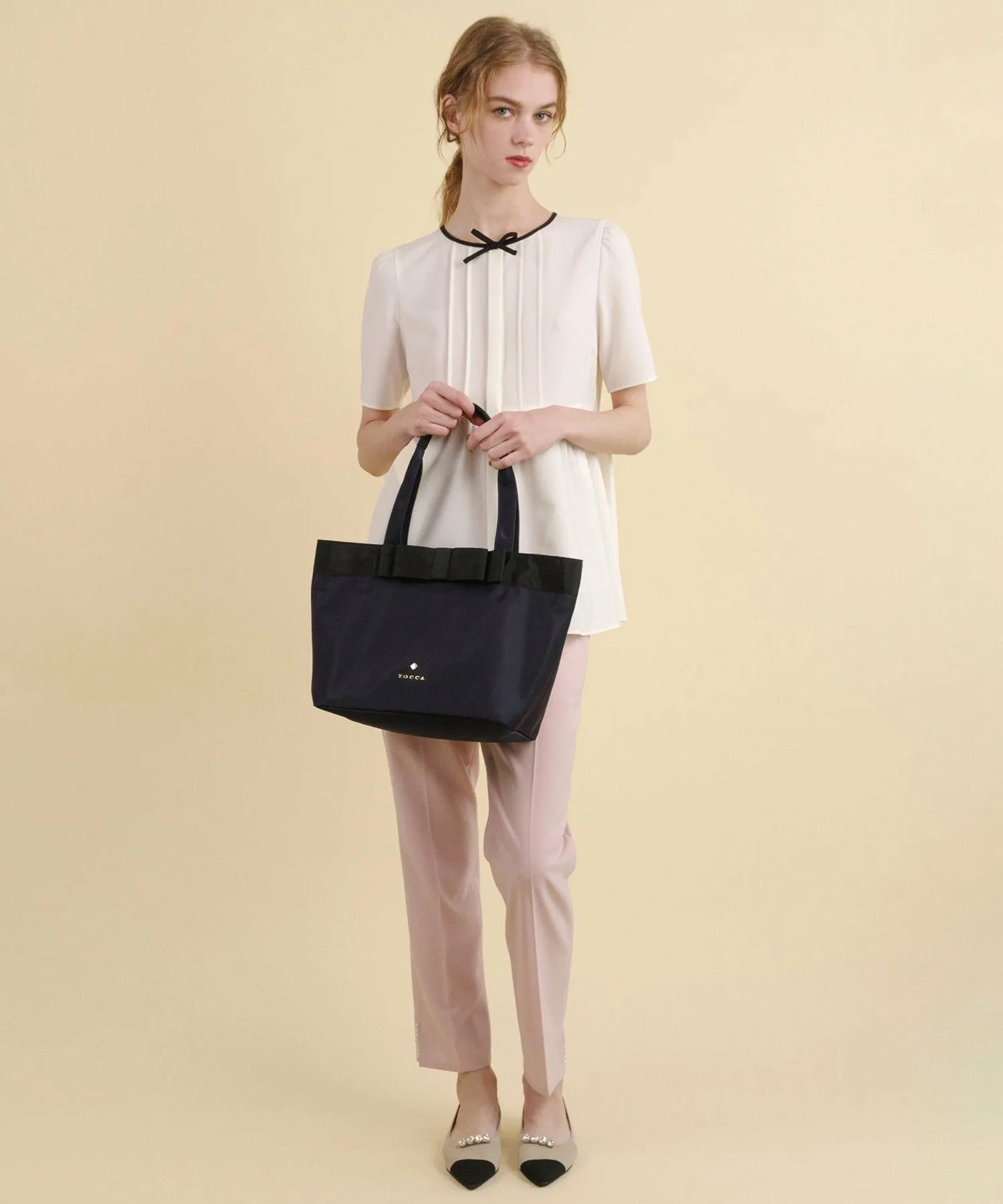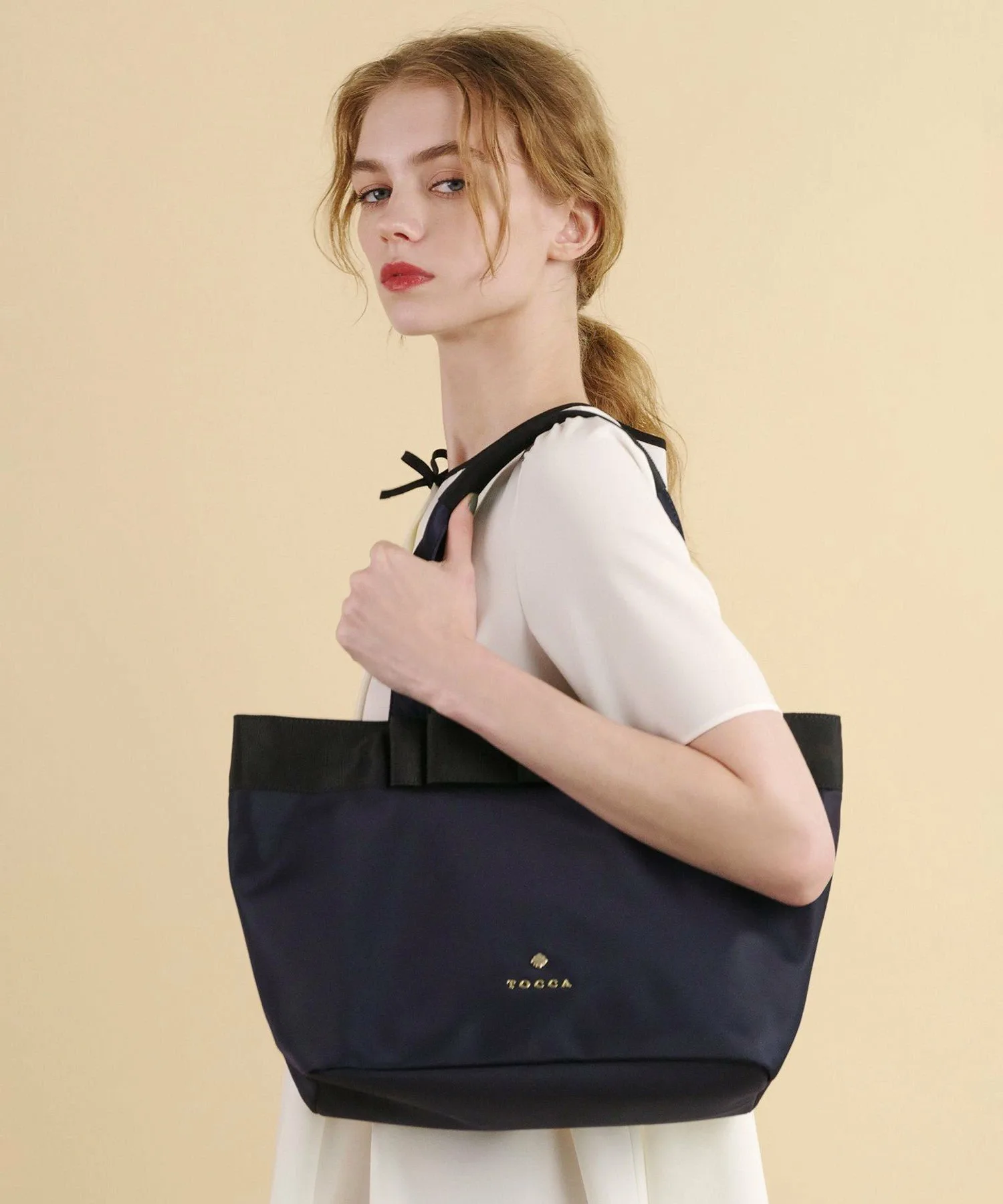 Эта простая сумка-тоут формата А4 украшена крупным мотивом из репсовой ленты и металлическими деталями логотипа, что придает ей изысканный и утонченный вид.