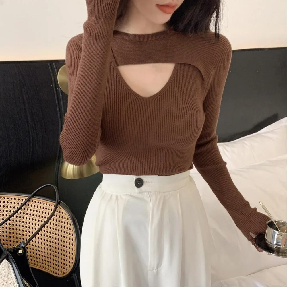 Многослойная однотонная нижняя рубашка, универсальная ребристая вязка, вязаный свитер с открытой грудью