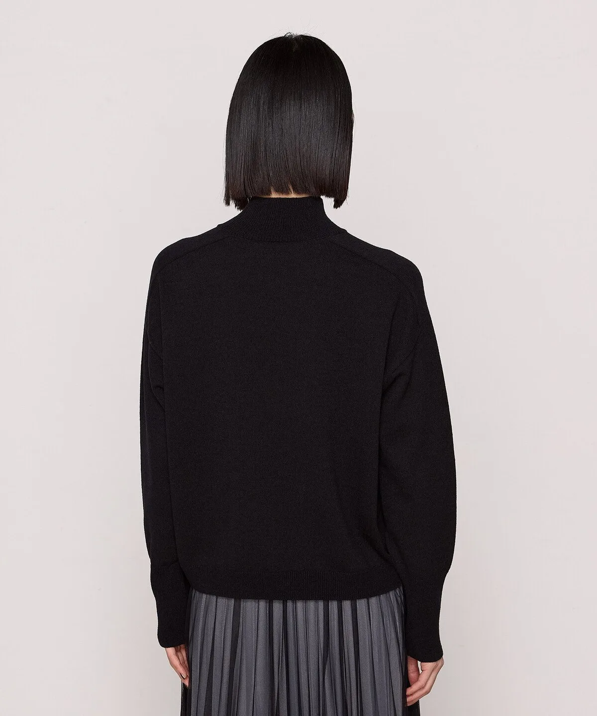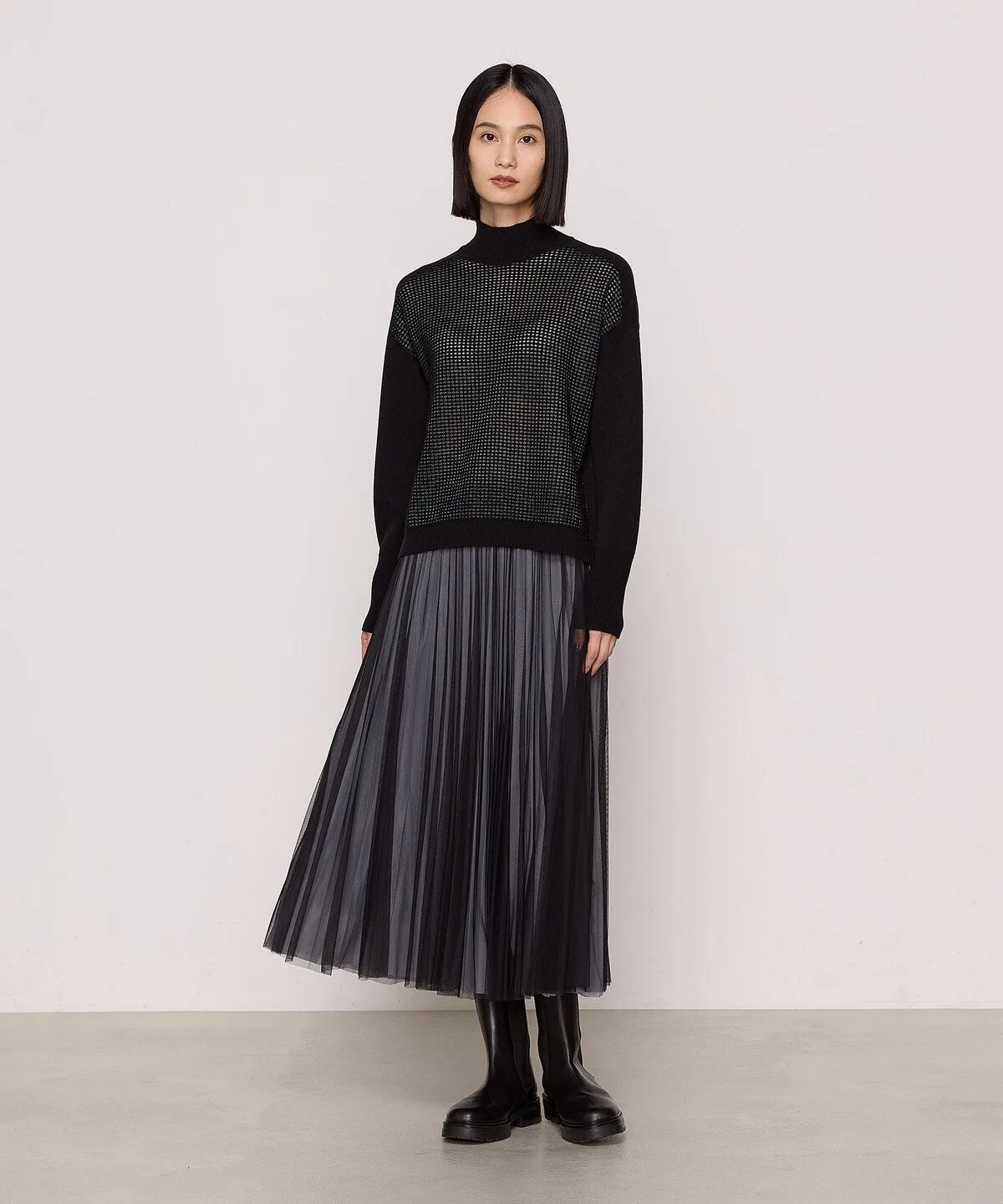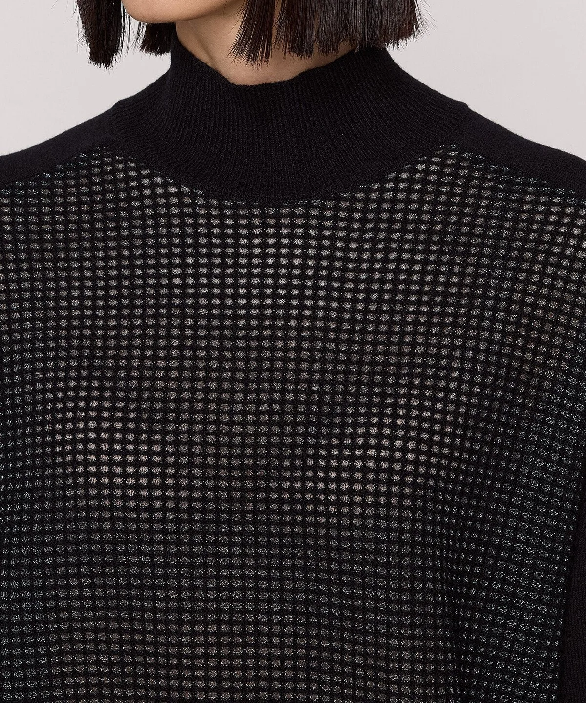 Этот пуловер с высоким воротником сочетает в себе плотную трикотажную вязку и узор из люрекса.