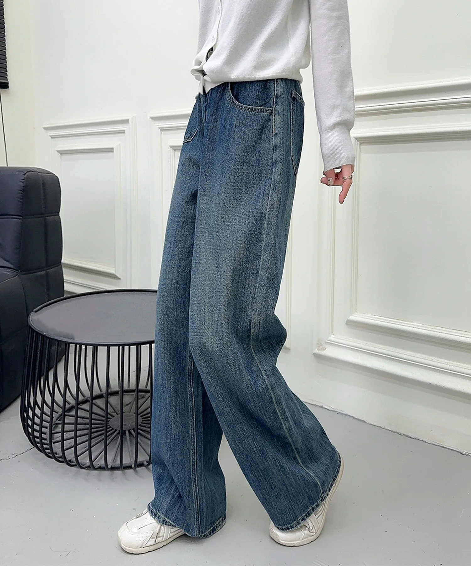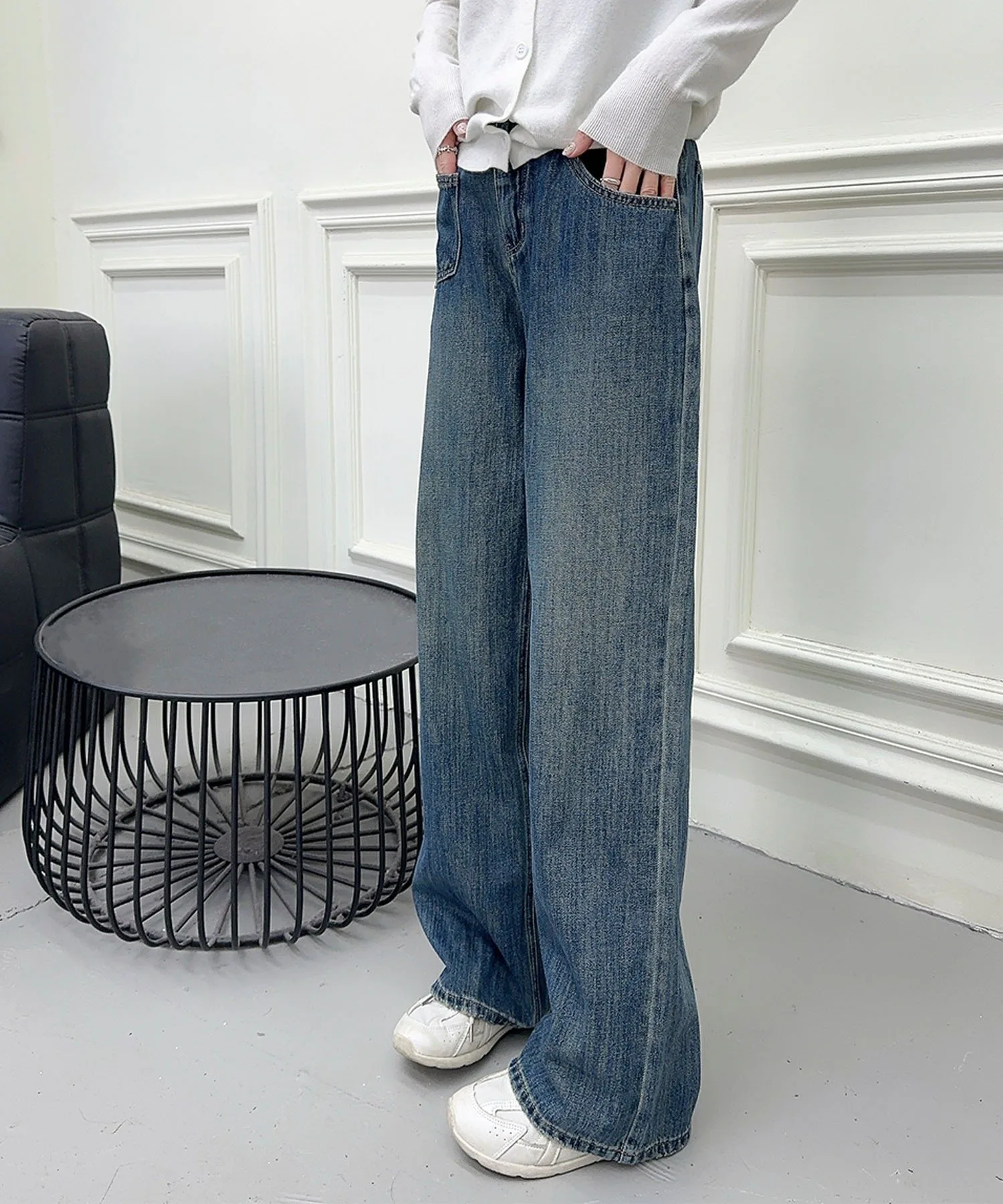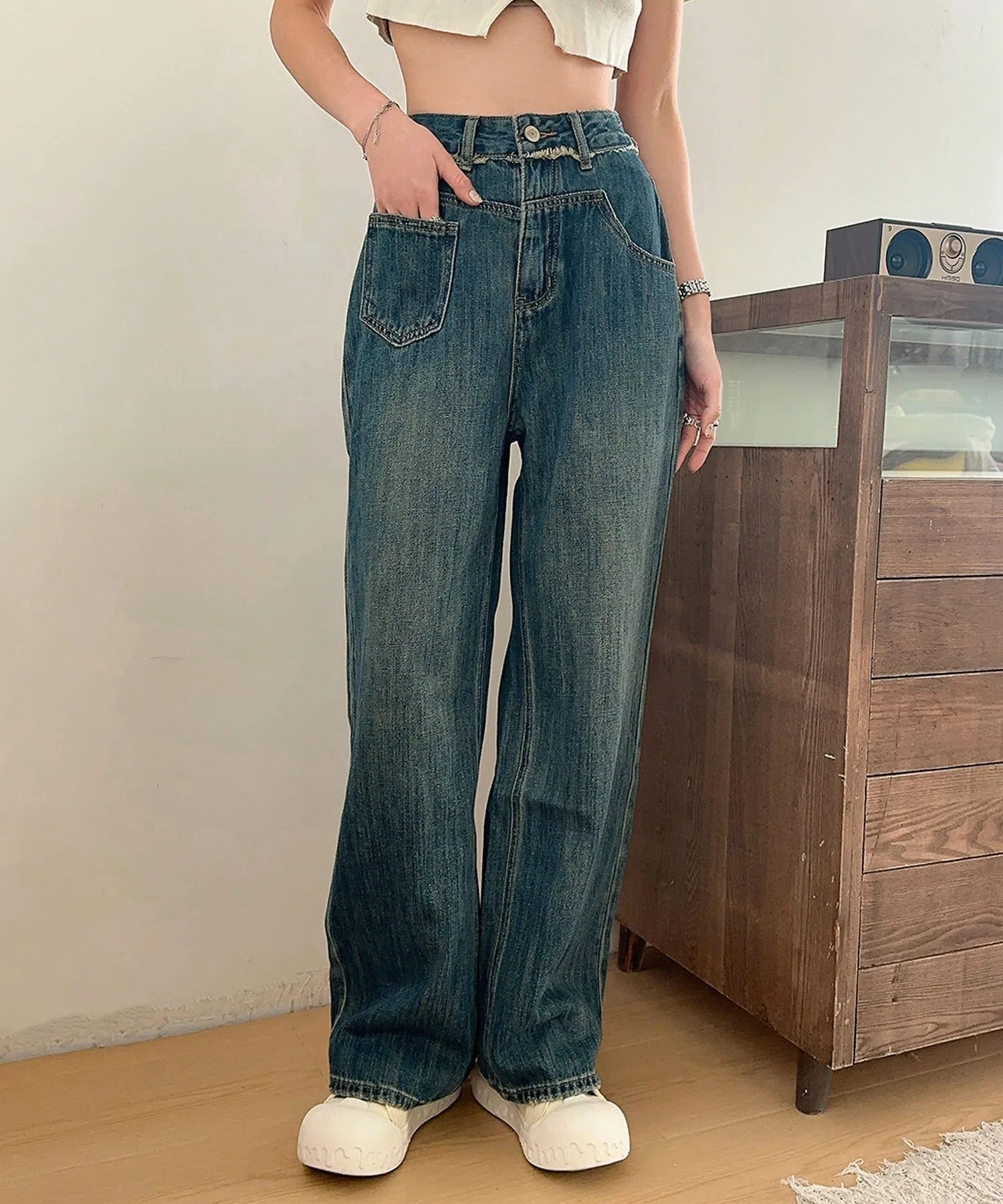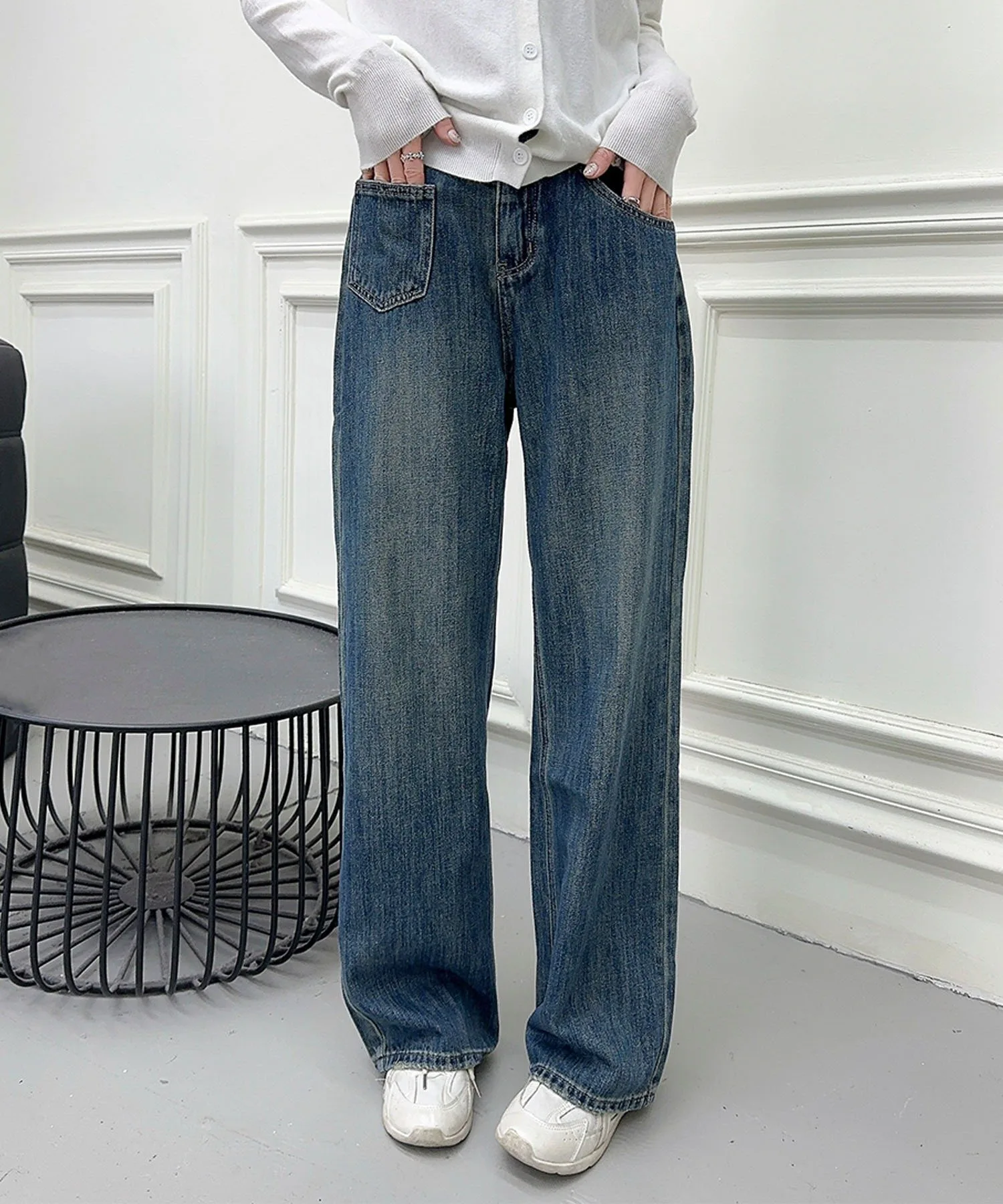 Простые и вневременные синие прямые джинсы. Обтекаемый дизайн и прямой силуэт позволяют легко сочетать их с любым нарядом, делая их полезным базовым элементом повседневной одежды. Пояс без пояса делает их стильными и удобными в ношении.
