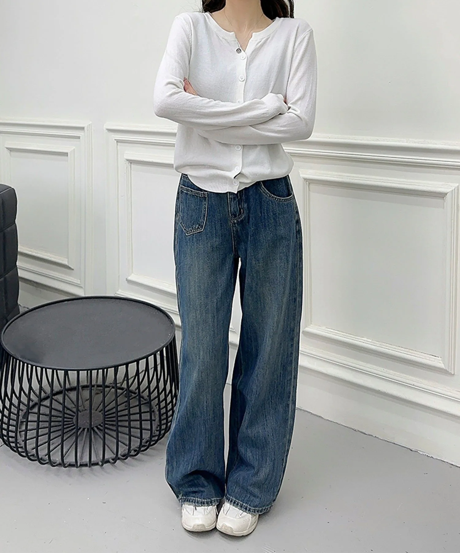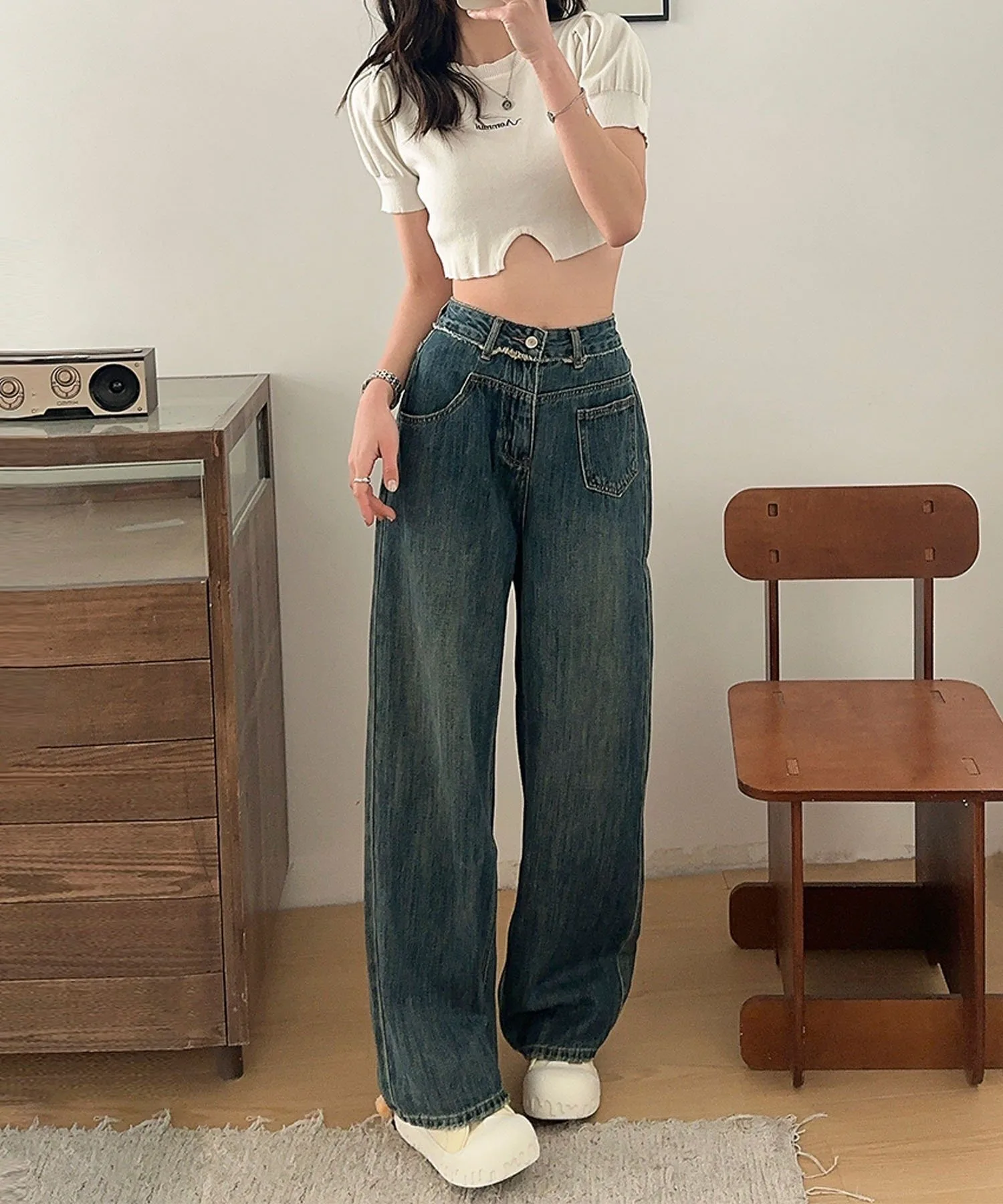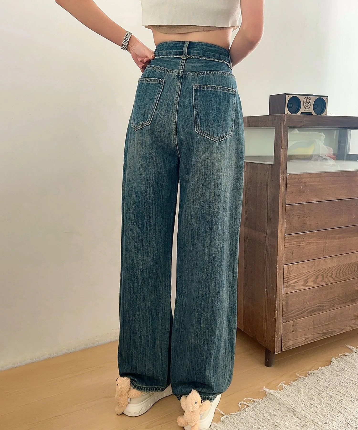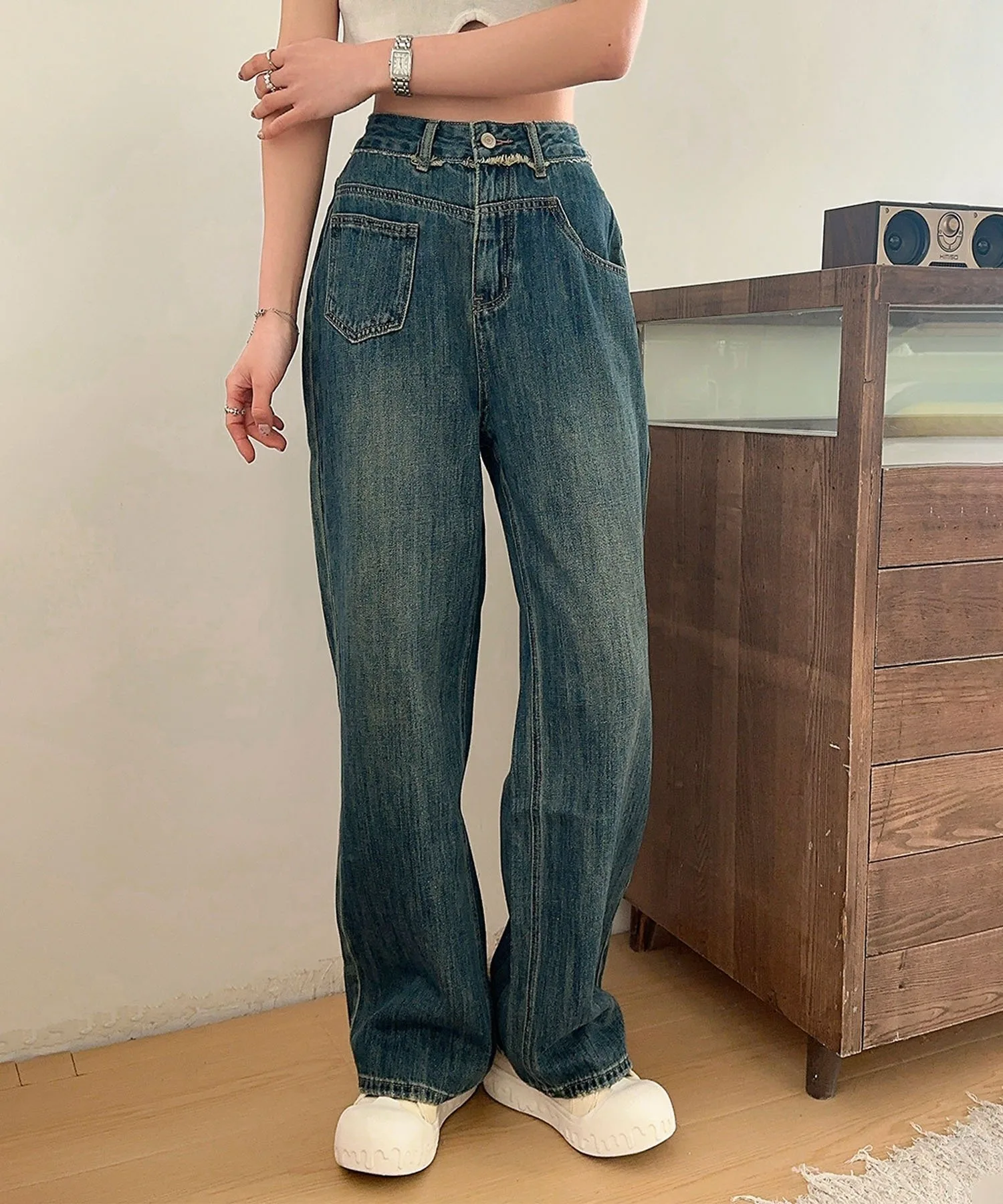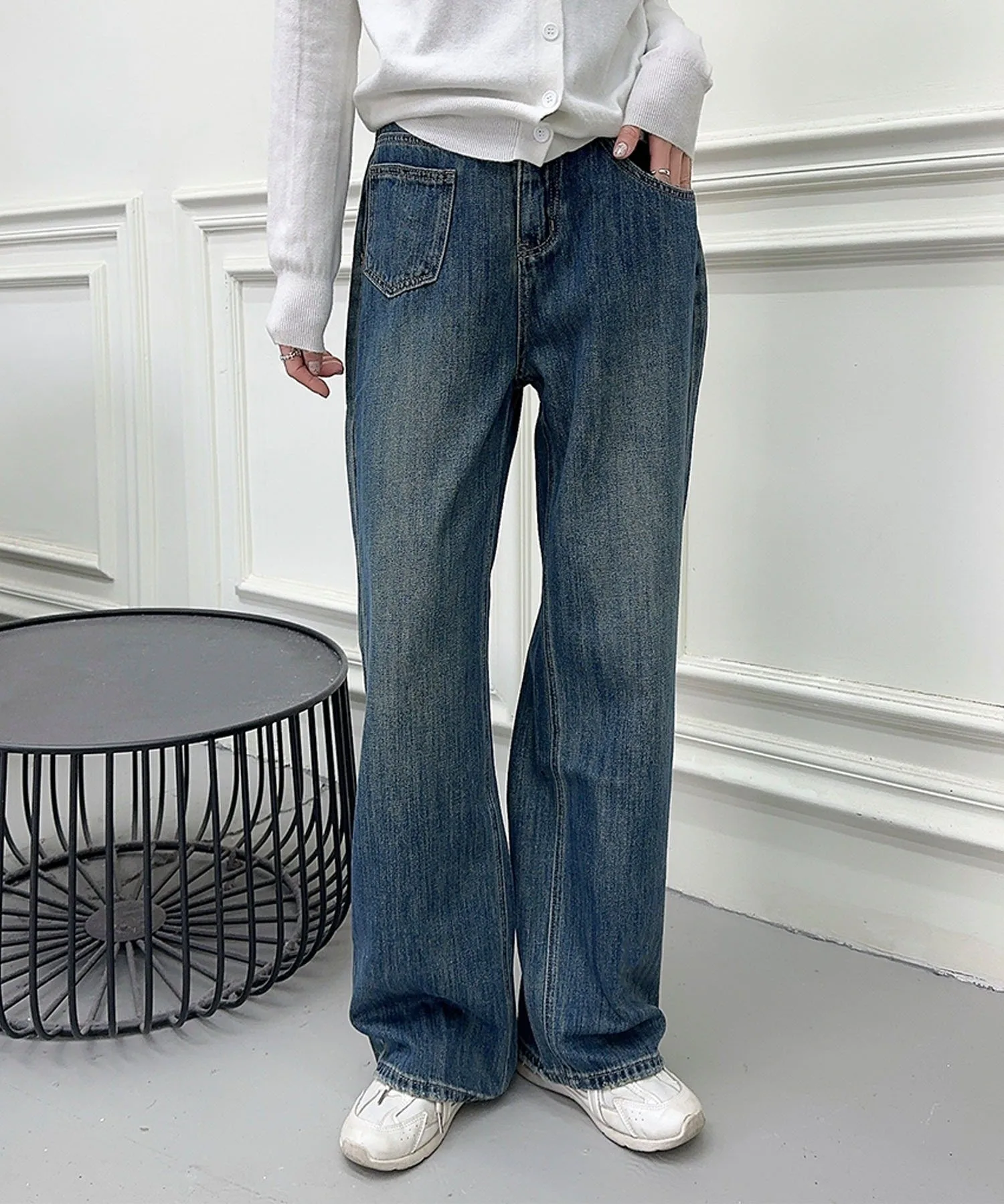 Простые и вневременные синие прямые джинсы. Обтекаемый дизайн и прямой силуэт позволяют легко сочетать их с любым нарядом, делая их полезным базовым элементом повседневной одежды. Пояс без пояса делает их стильными и удобными в ношении.