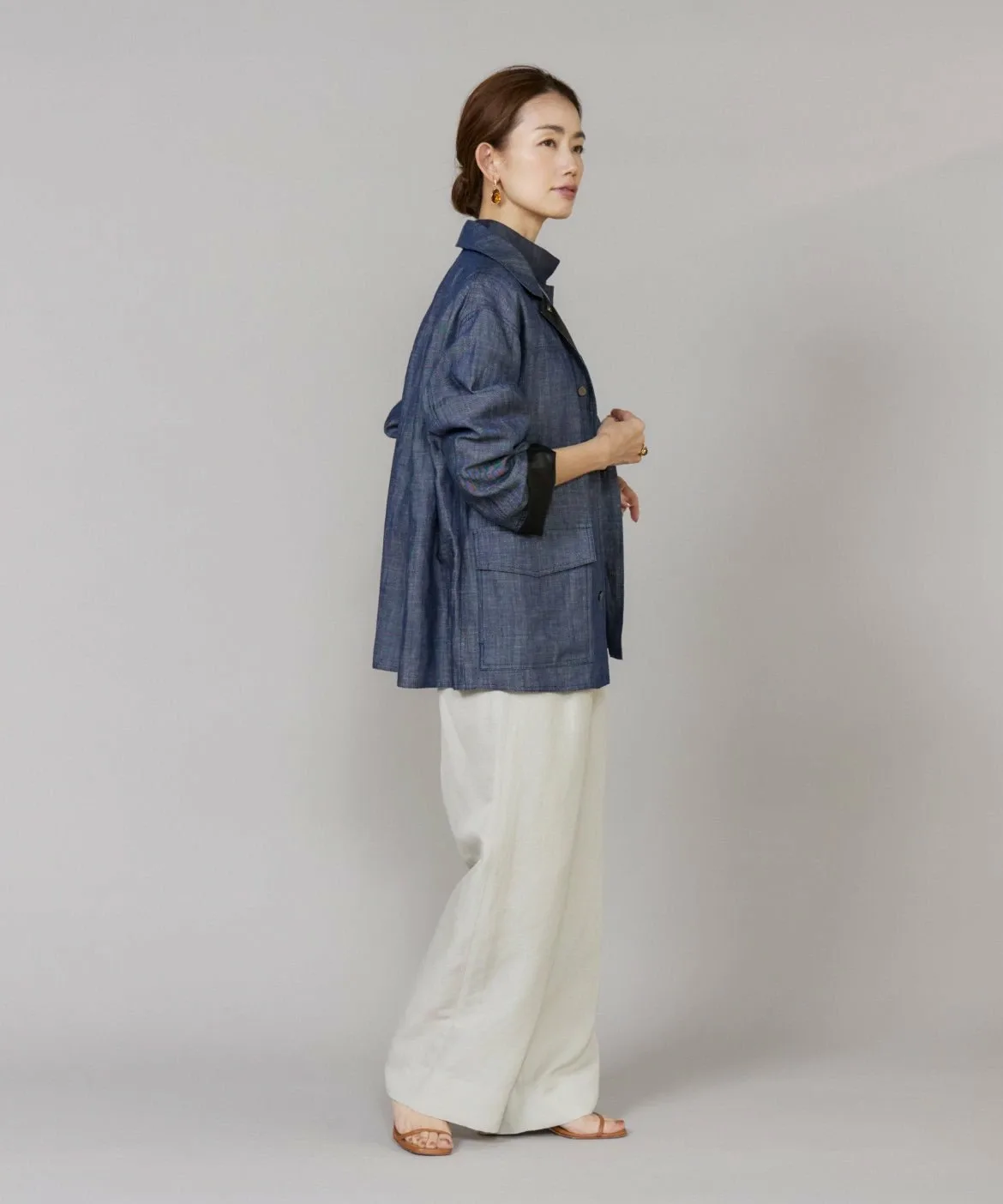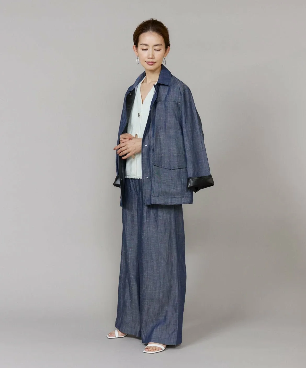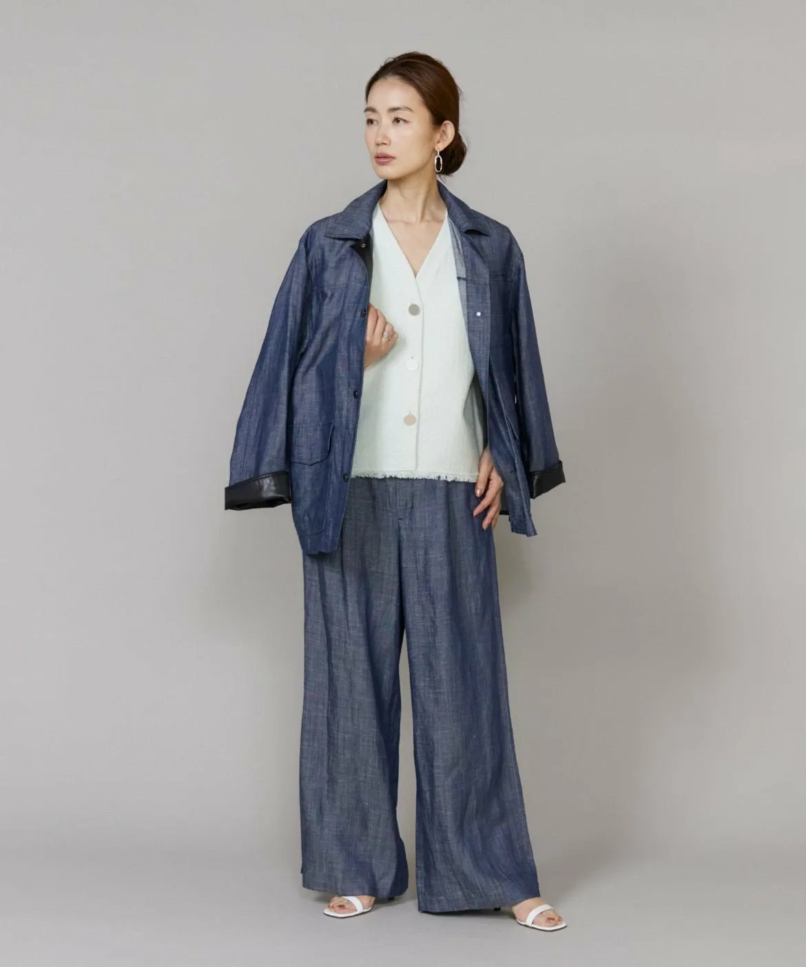 Повседневный джинсовый материал элегантно изготовлен из лиоцелла и льна. Он менее подвержен выцветанию, чем обычный деним, имеет гладкую поверхность и создает привлекательный силуэт. Он легче, чем кажется, и удобен в ношении. Кроме того, он изготовлен из легко моющегося материала, что делает его идеальным для повседневной носки.