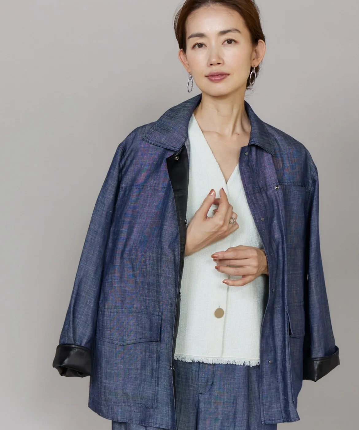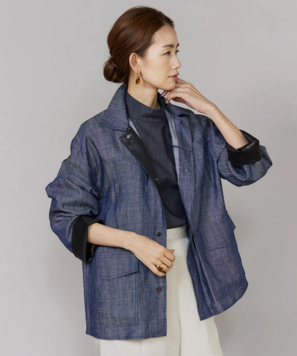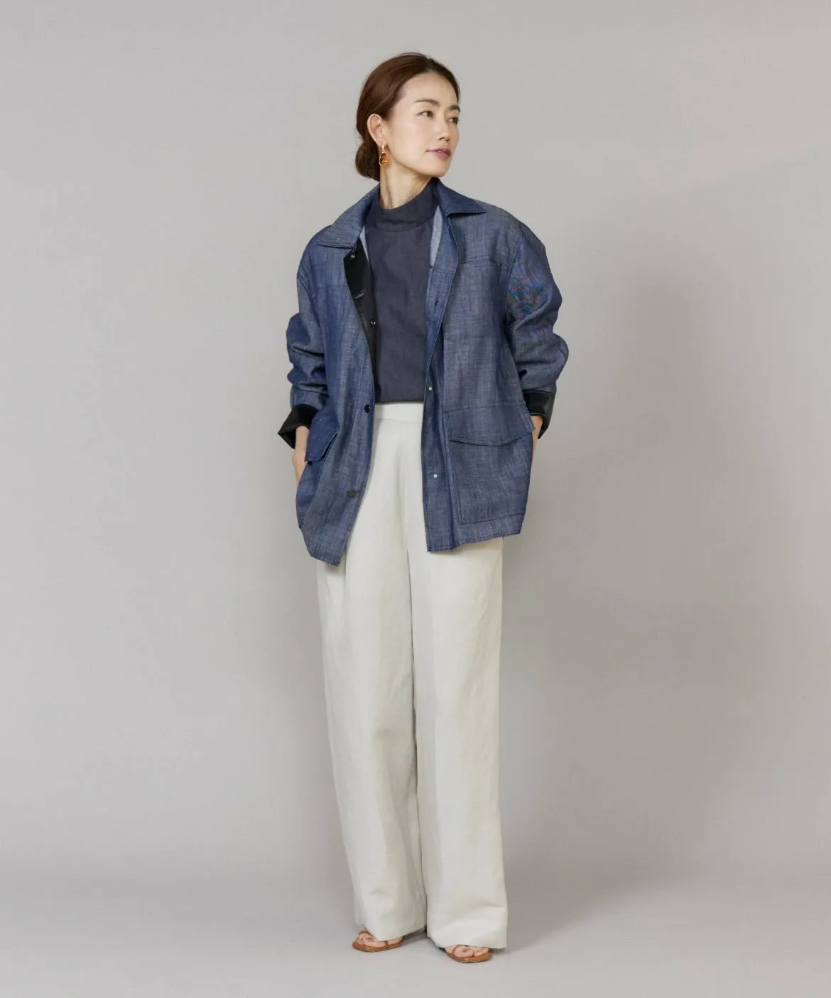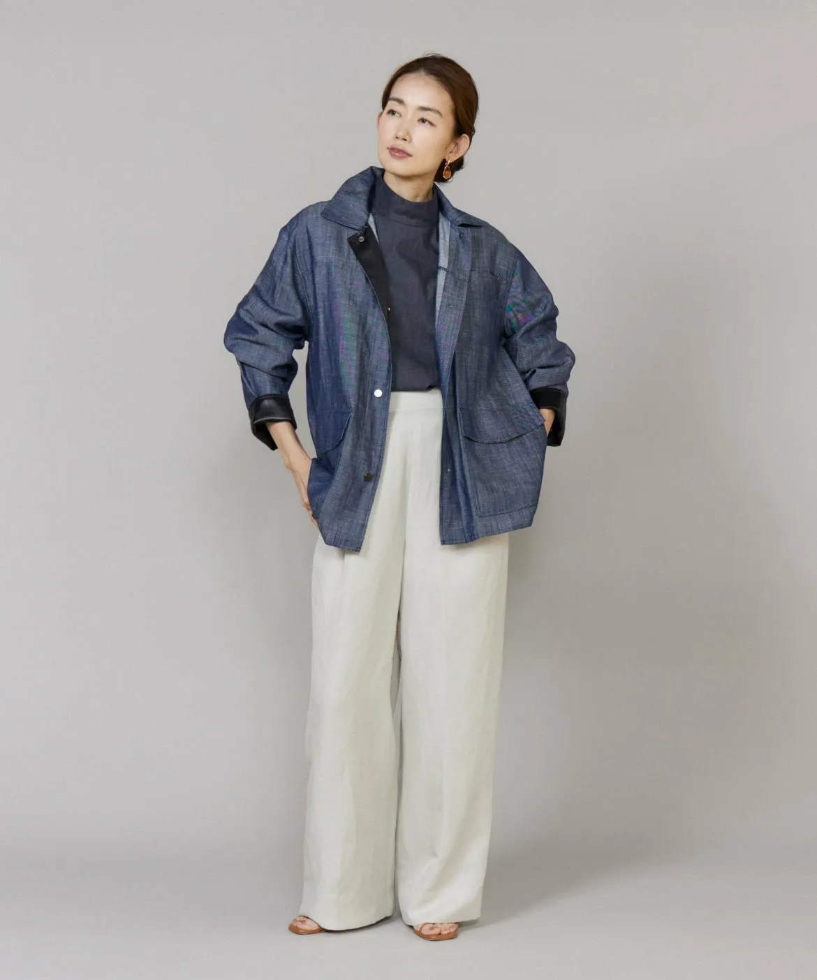 Повседневный джинсовый материал элегантно изготовлен из лиоцелла и льна. Он менее подвержен выцветанию, чем обычный деним, имеет гладкую поверхность и создает привлекательный силуэт. Он легче, чем кажется, и удобен в ношении. Кроме того, он изготовлен из легко моющегося материала, что делает его идеальным для повседневной носки.