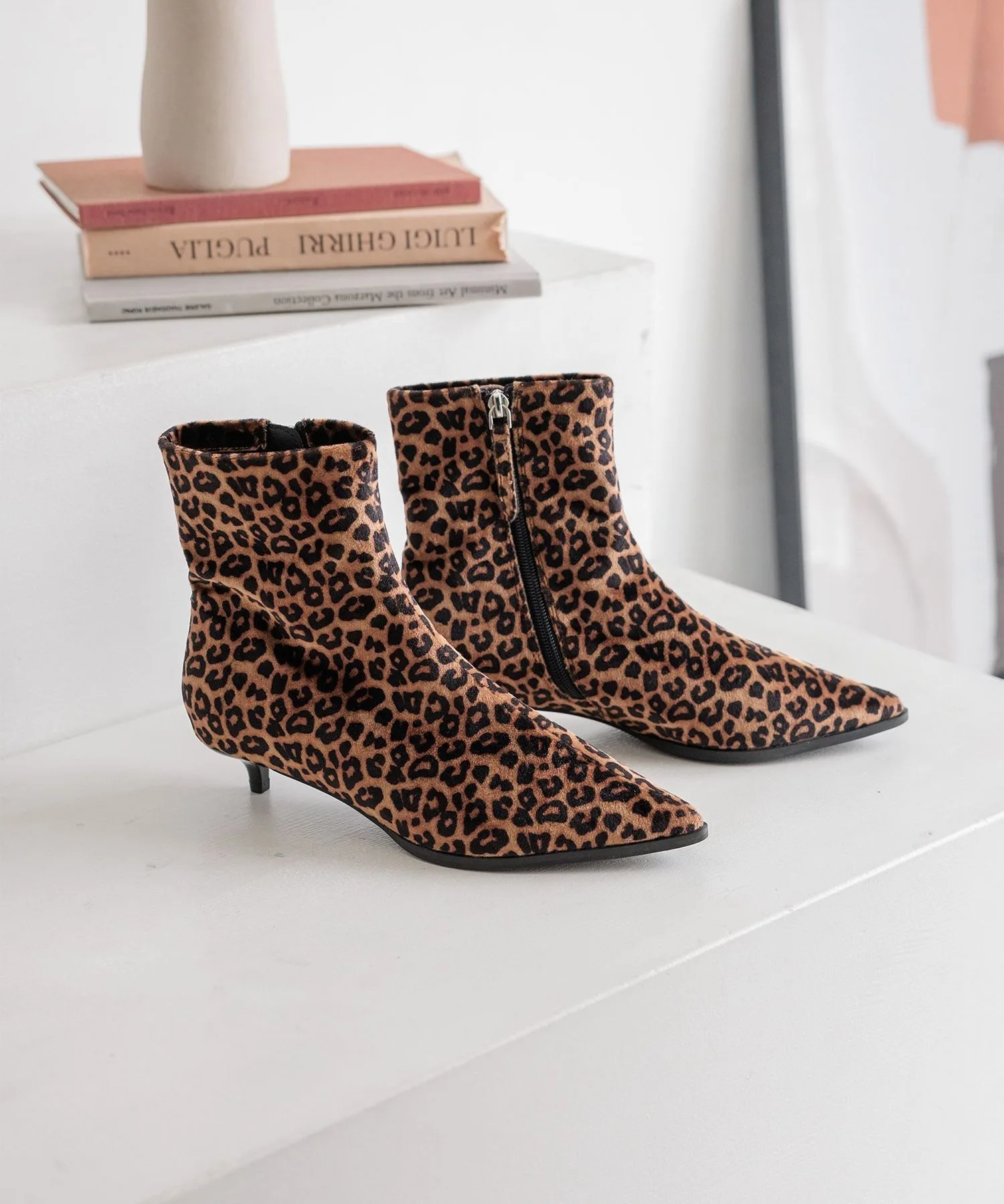 Эти короткие сапоги имеют выразительный носок и низкий каблук высотой 3 см, что придает им элегантный вид.