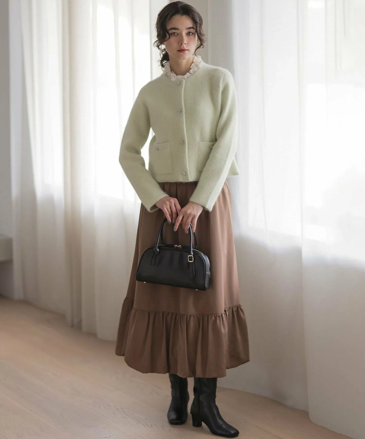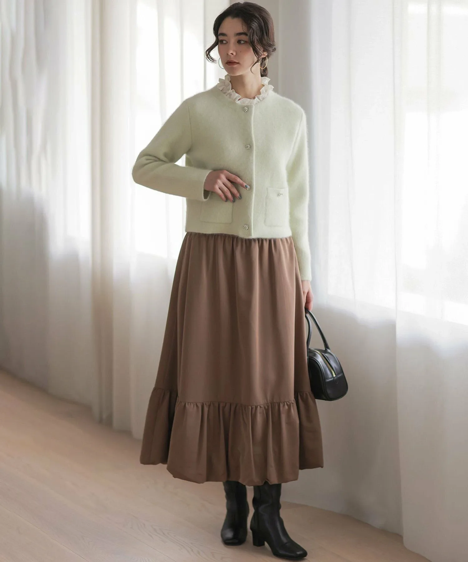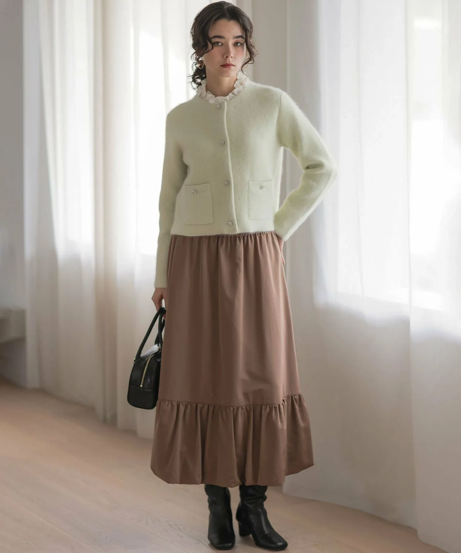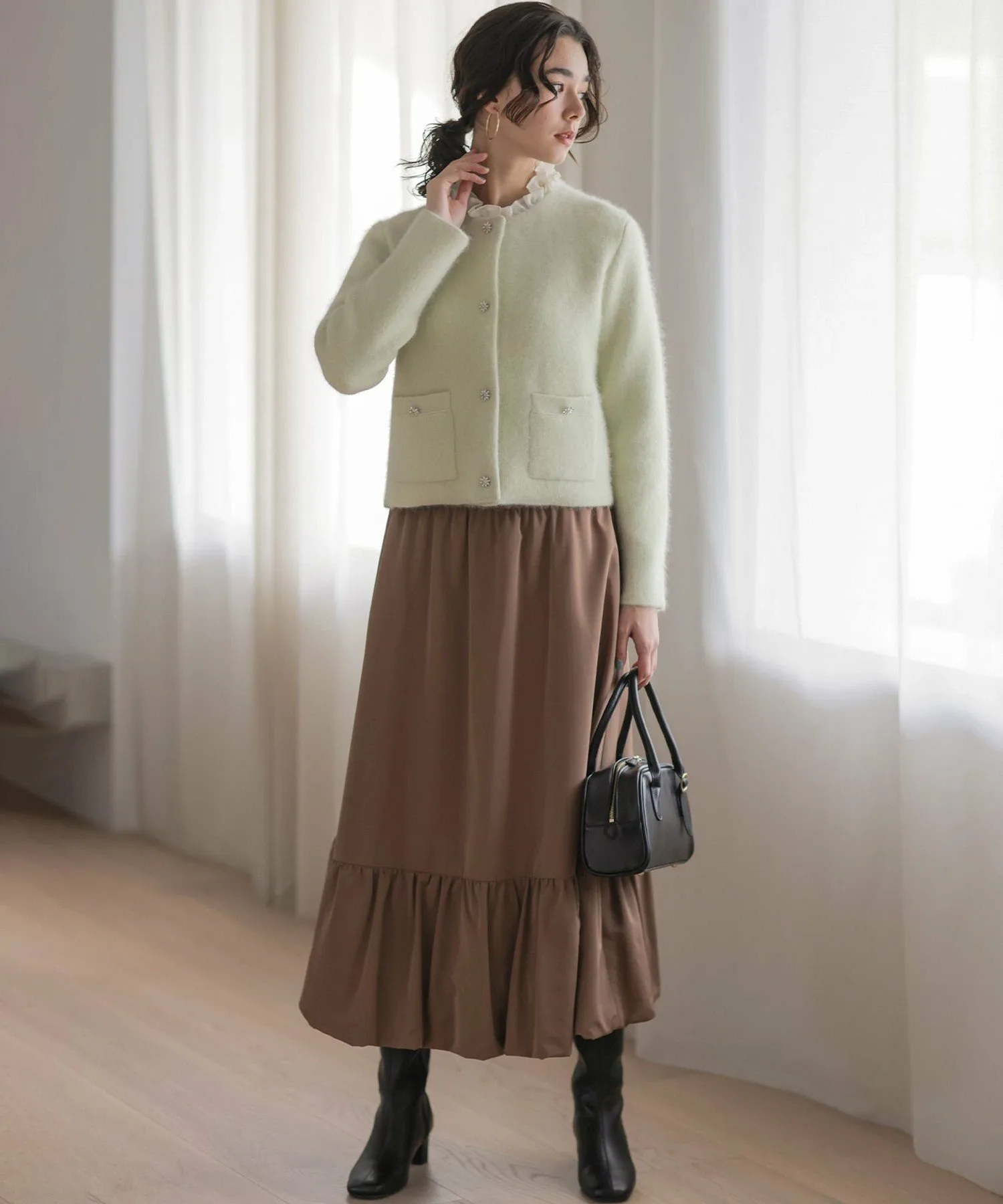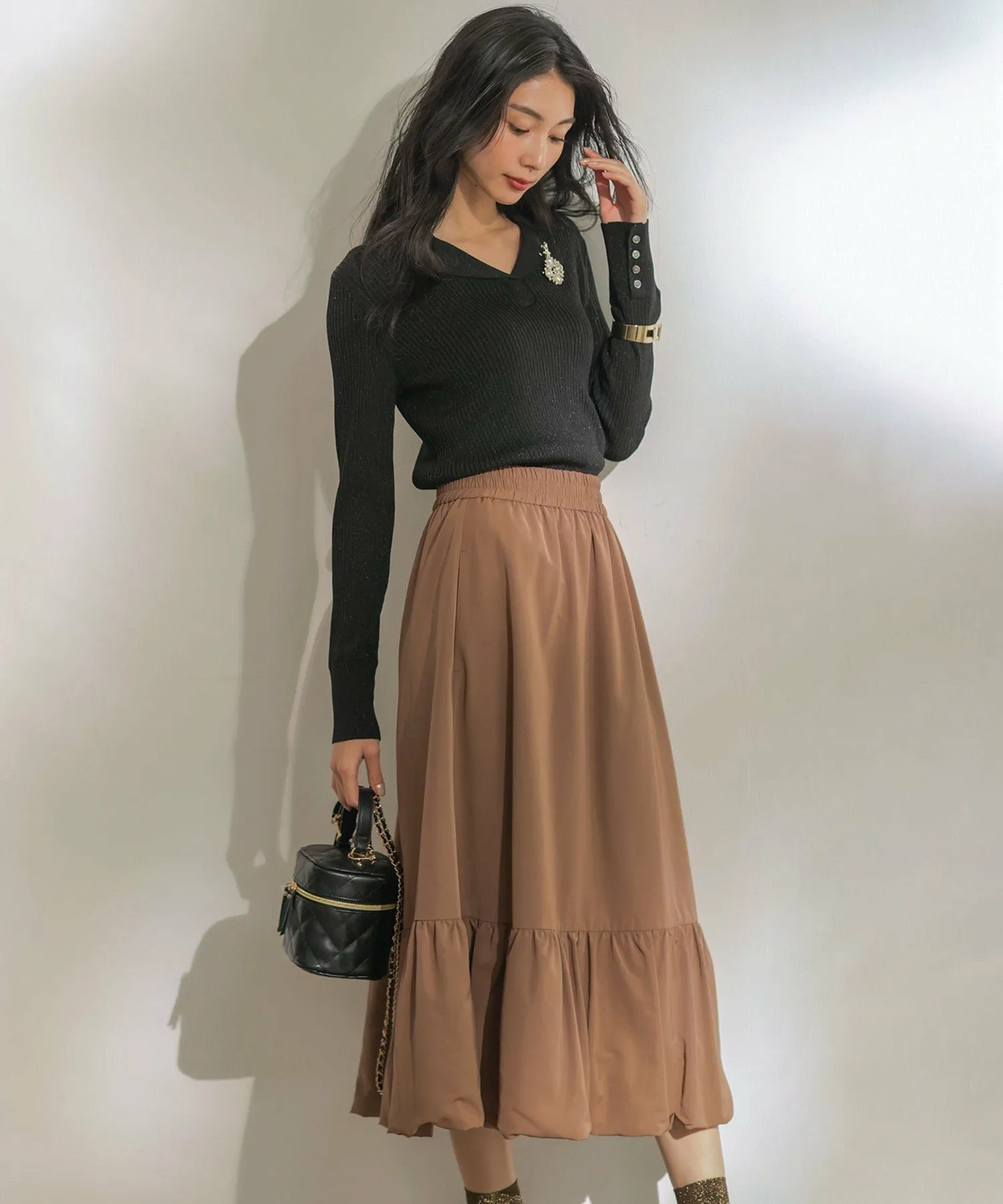 Дизайн: Эта юбка имеет модный силуэт «баллон», переосмысленный для повседневной носки. Полностью эластичный пояс обеспечивает удобную посадку, а широкий пояс гарантирует надежную фиксацию. Общий баланс тщательно продуман для создания трехмерного силуэта. Она хорошо сочетается с зимними трикотажными изделиями, становясь центральным элементом любого образа.