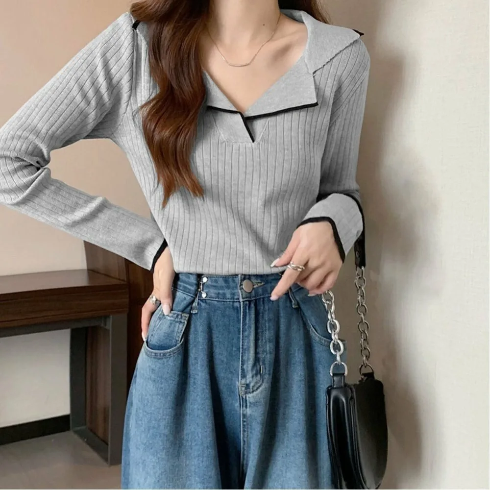 Женский повседневный вязаный свитер, облегающий силуэт, длинные рукава, осенняя одежда, ребристая вязка, стильный вязаный пуловер, стильный топ с воротником, модный вязаный топ в стиле поло, двухцветная расцветка добавляет стильный штрих, идеально сочетается с широкими брюками или длинными юбками, придавая изысканный вид любому образу, материал: 65% полиэстер + 35% хлопок, цвета: черный, белый, мокко, серый, коричневый, размер: один размер, длина: около 48 см, ширина плеч: около 34 см, длина рукава: около 55 см, ширина плеч: около 72 см, ширина груди: около 1 см. Обхват груди: приблизительно 80-140 см