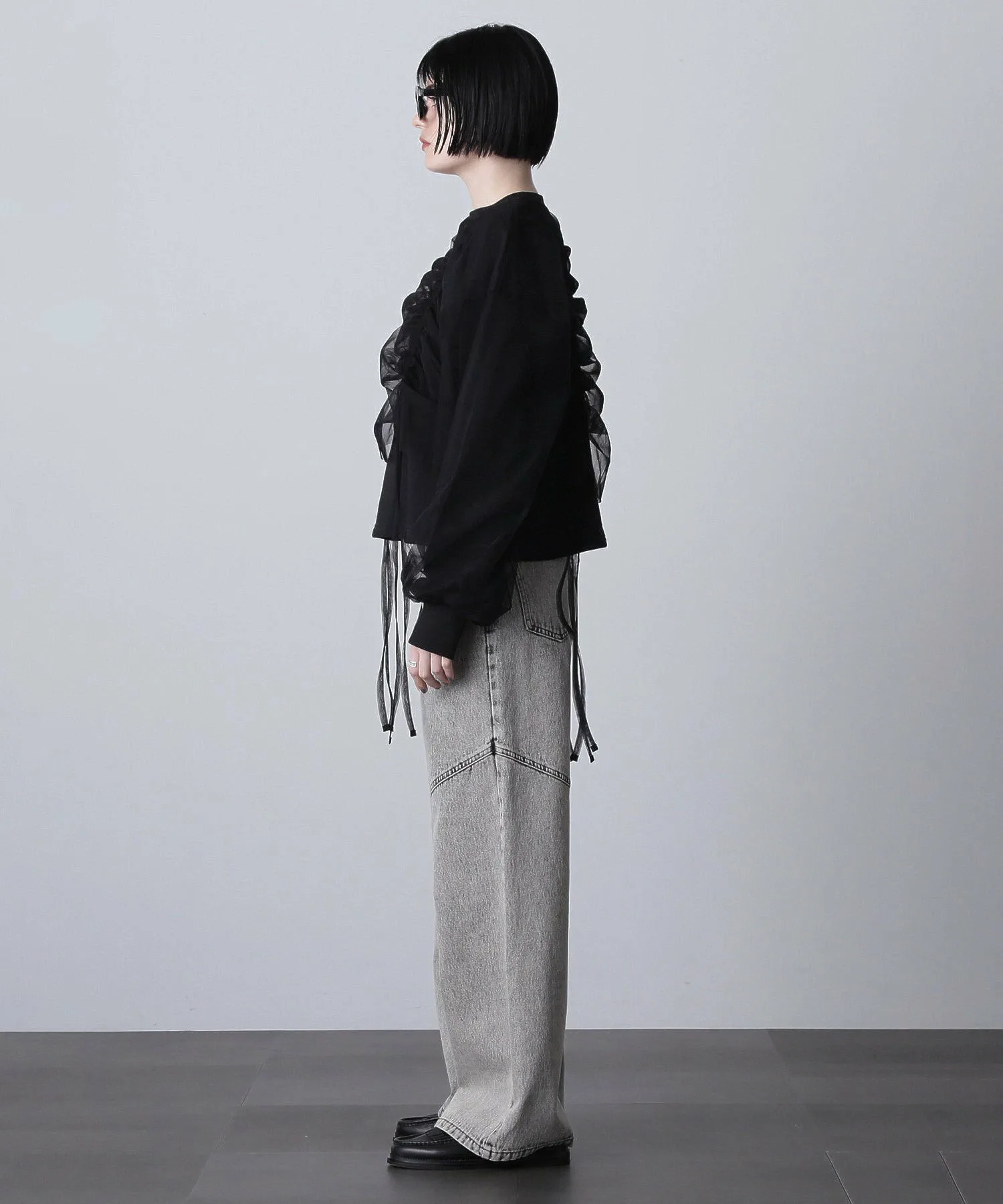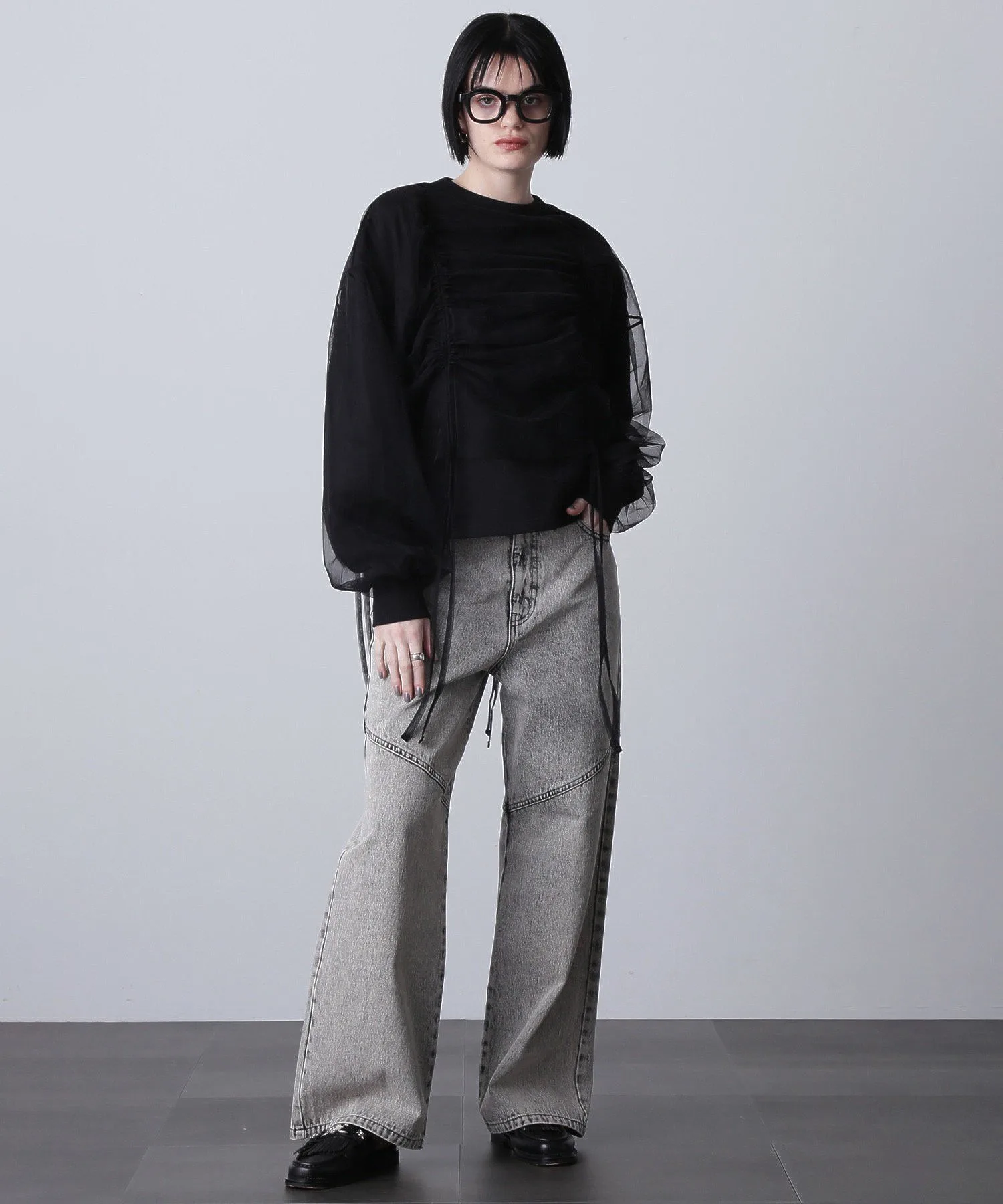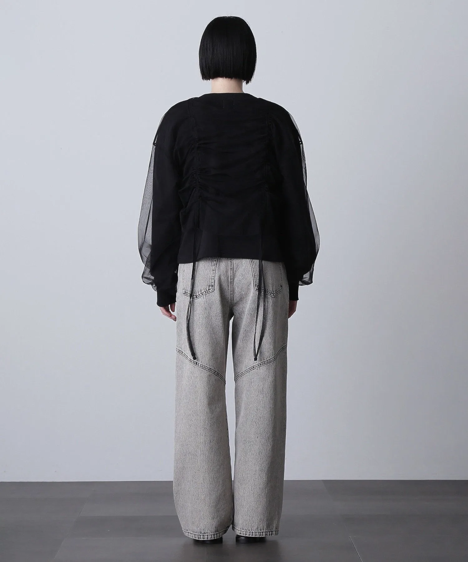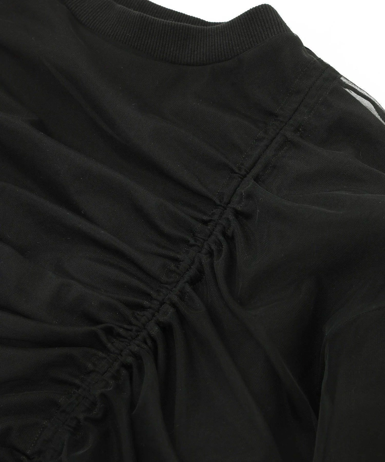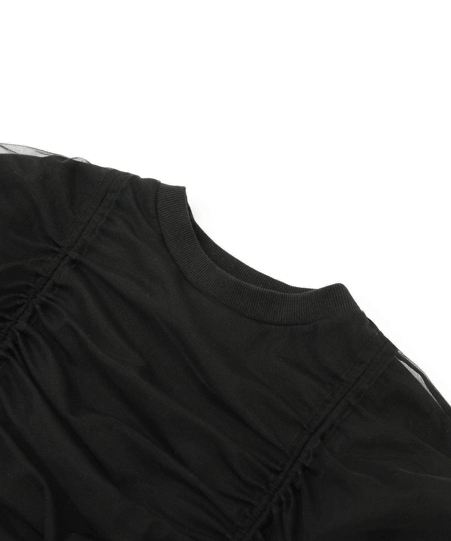Пуловер из тюля с присборенной отделкой, который дополнит многослойный образ всего одним элементом.