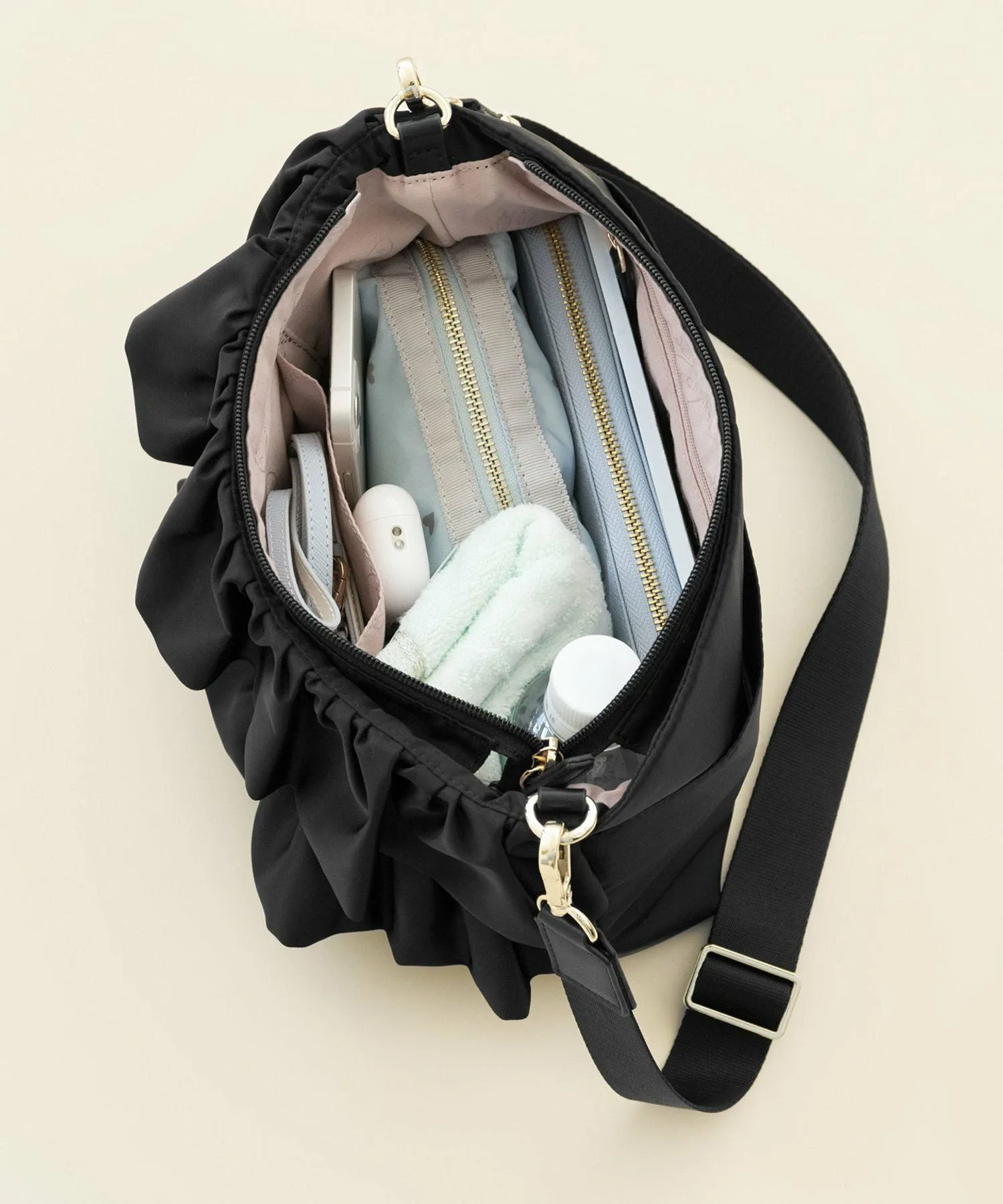 Хотя она выглядит небольшой, боковые складки достаточно вместительны, позволяя поместить длинный кошелек или бутылку воды. Сзади есть открытый карман, удобный для быстрого доступа к смартфону. Плечевой ремень отстегивается, что позволяет использовать сумку как клатч.