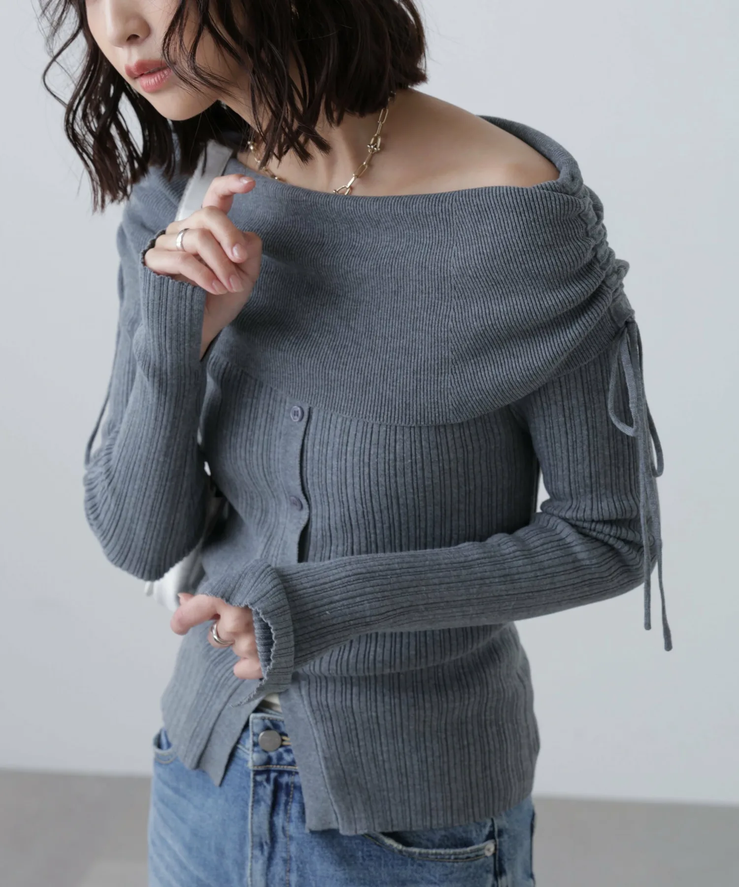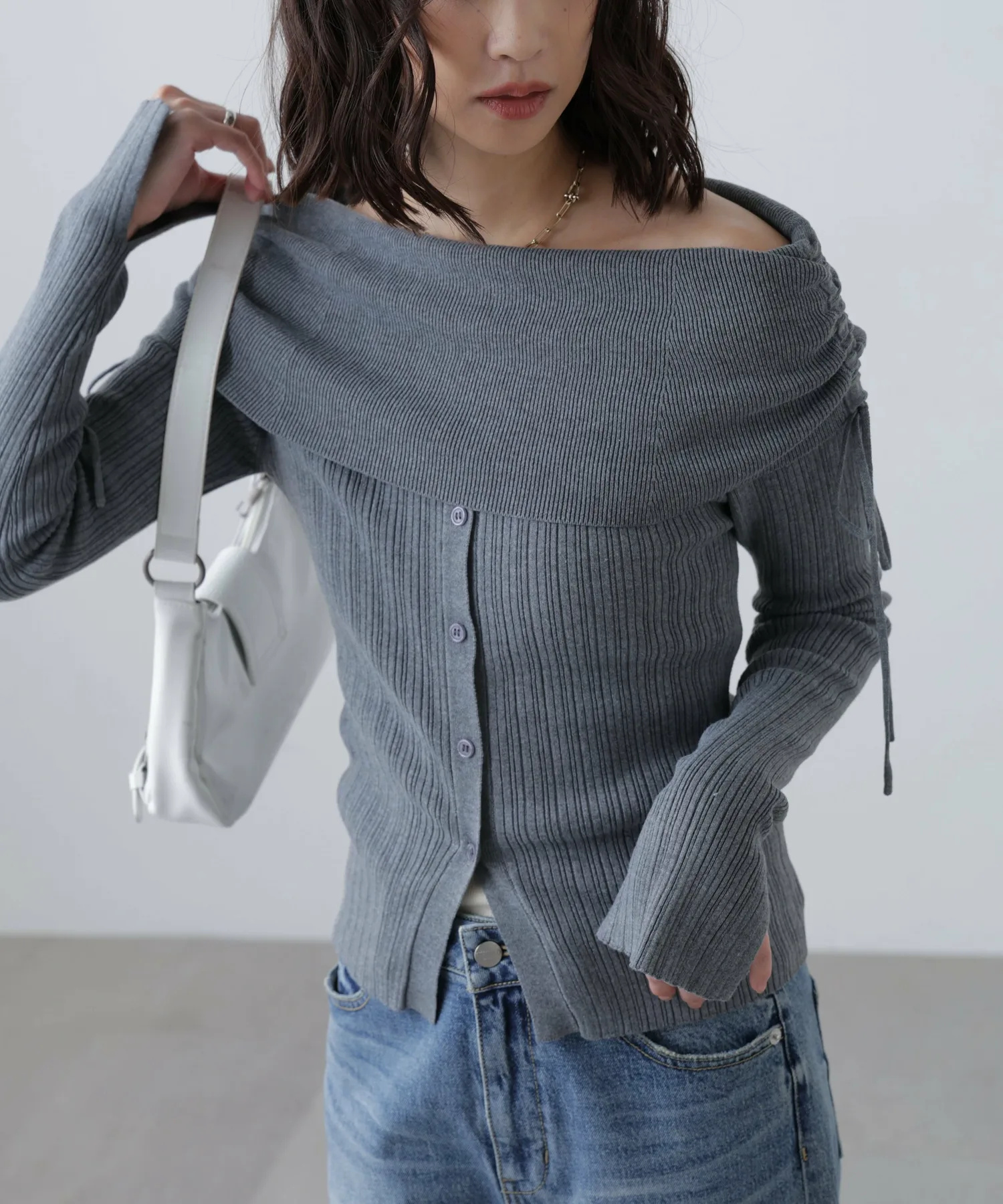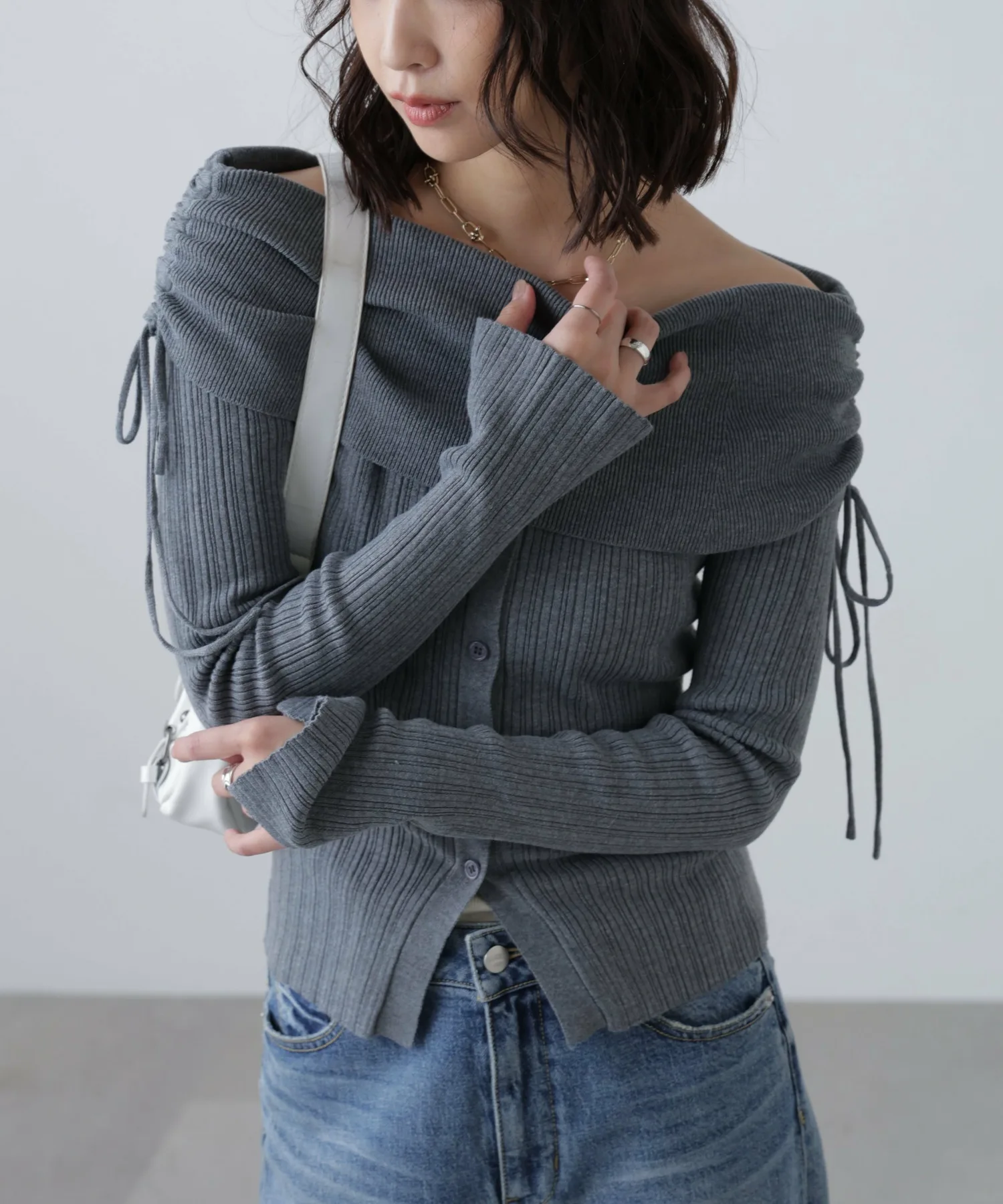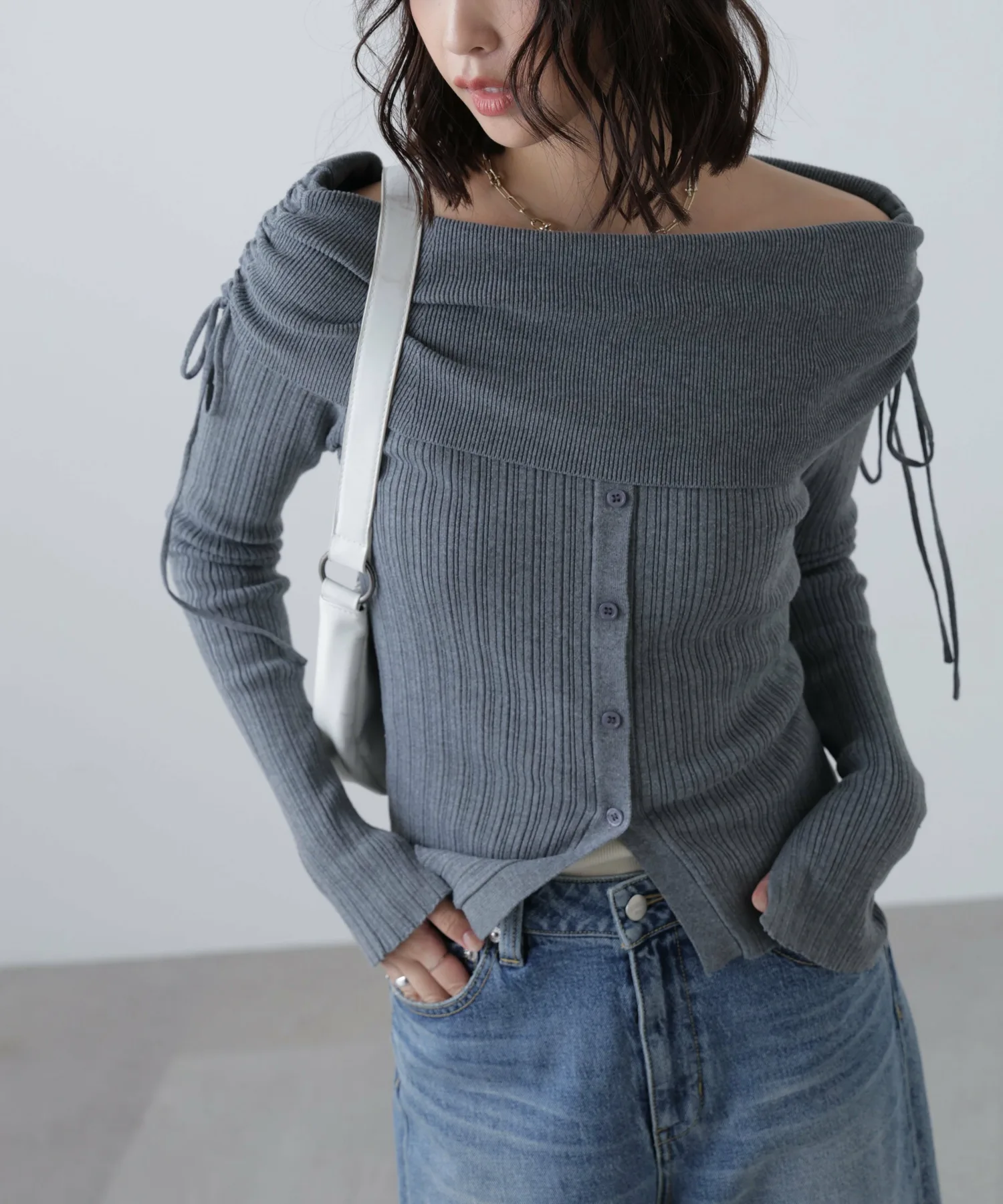 Модный трикотаж в рубчик произвольной формы, сочетающий открытые плечи с популярными ленточными деталями. Основная часть имеет облегающий силуэт, а передний разрез внизу создает расслабленный образ. Нежные ленточные детали по обеим сторонам открытых плеч придают женственность. Изготовленный из пушистой, объемной пряжи, обеспечивающей гладкость на ощупь, этот трикотаж легкий и приятный для кожи. Рекомендуется сочетать с юбками, брюками и джинсами, его можно носить с любыми брюками или юбками. Также можно надеть его поверх рубашки подходящего размера или прозрачной нижней одежды.