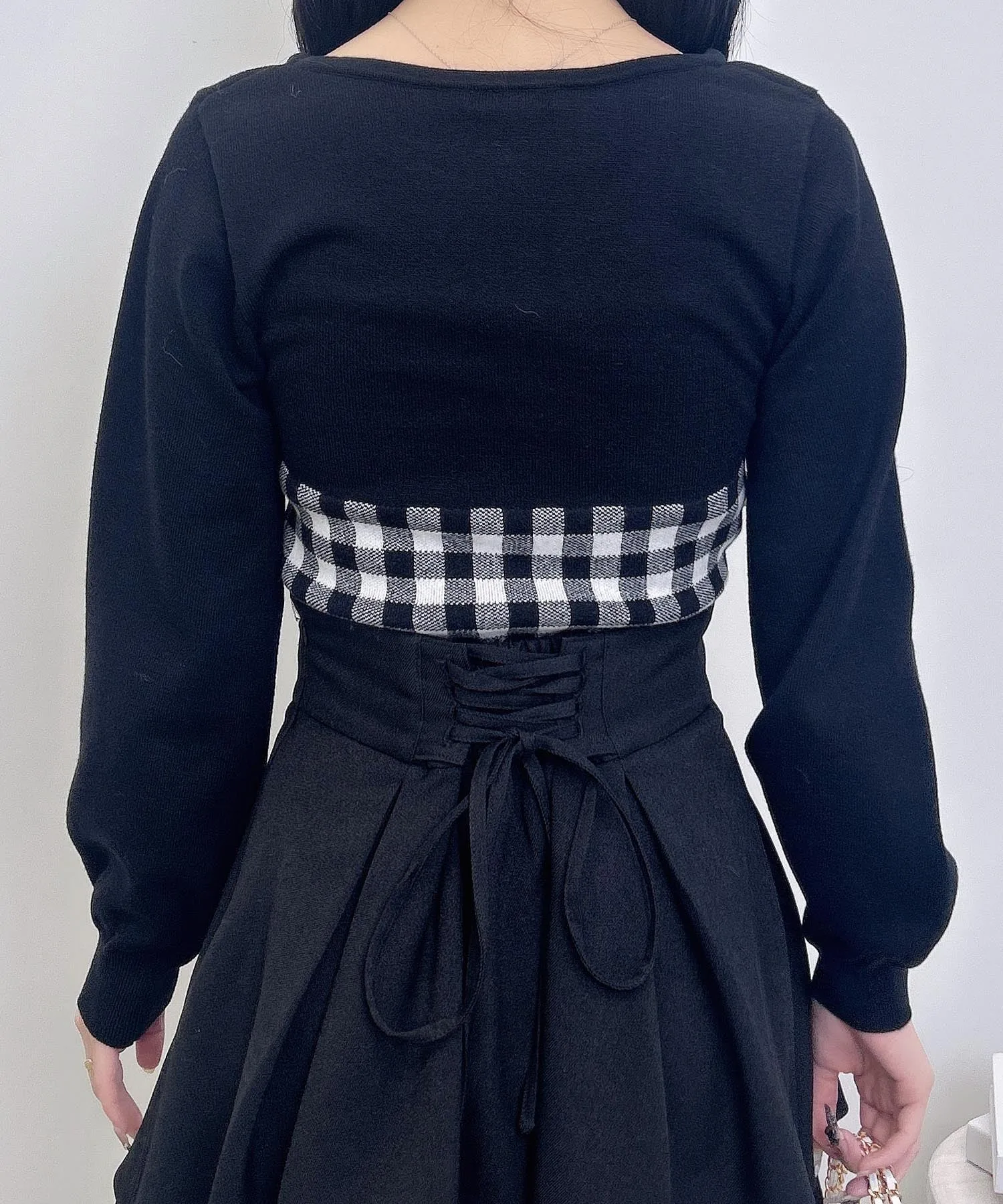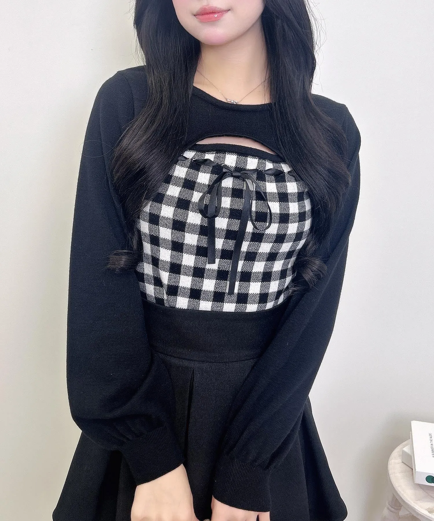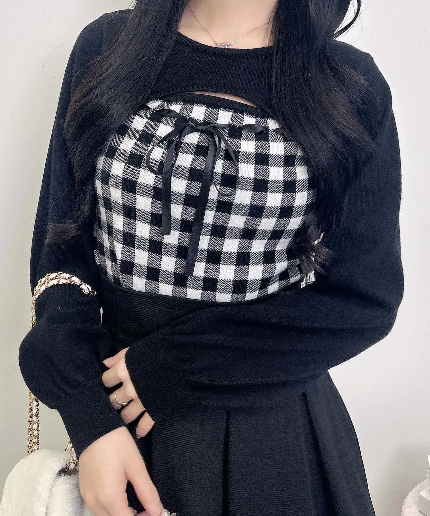 Ленточка на груди и клетчатый узор добавляют стильный акцент.