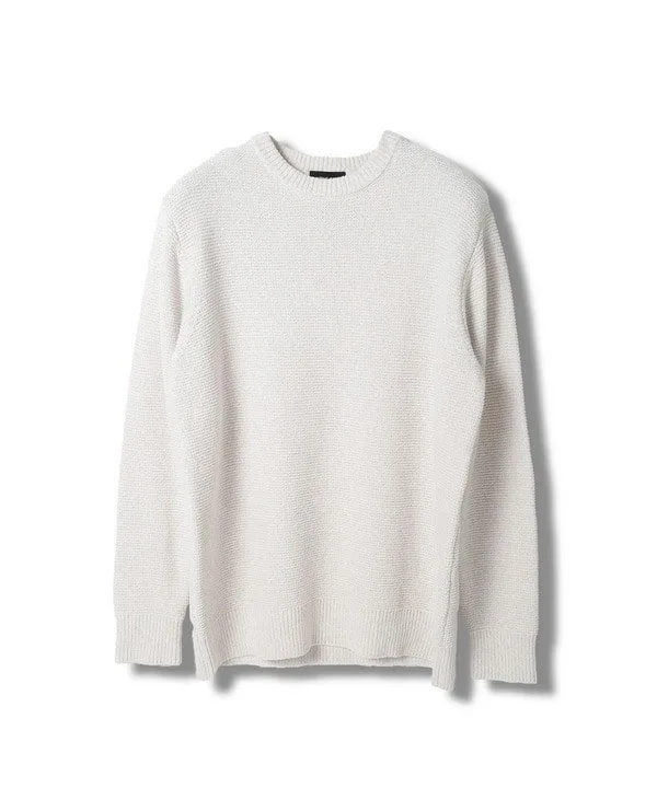 Этот меланжевый свитер, связанный платочной вязкой, создан путем скручивания двух цветов мохеровой пряжи (тонкой, пушистой пряжи из шелка, шерсти или синтетических волокон) с пряжей из перьев.