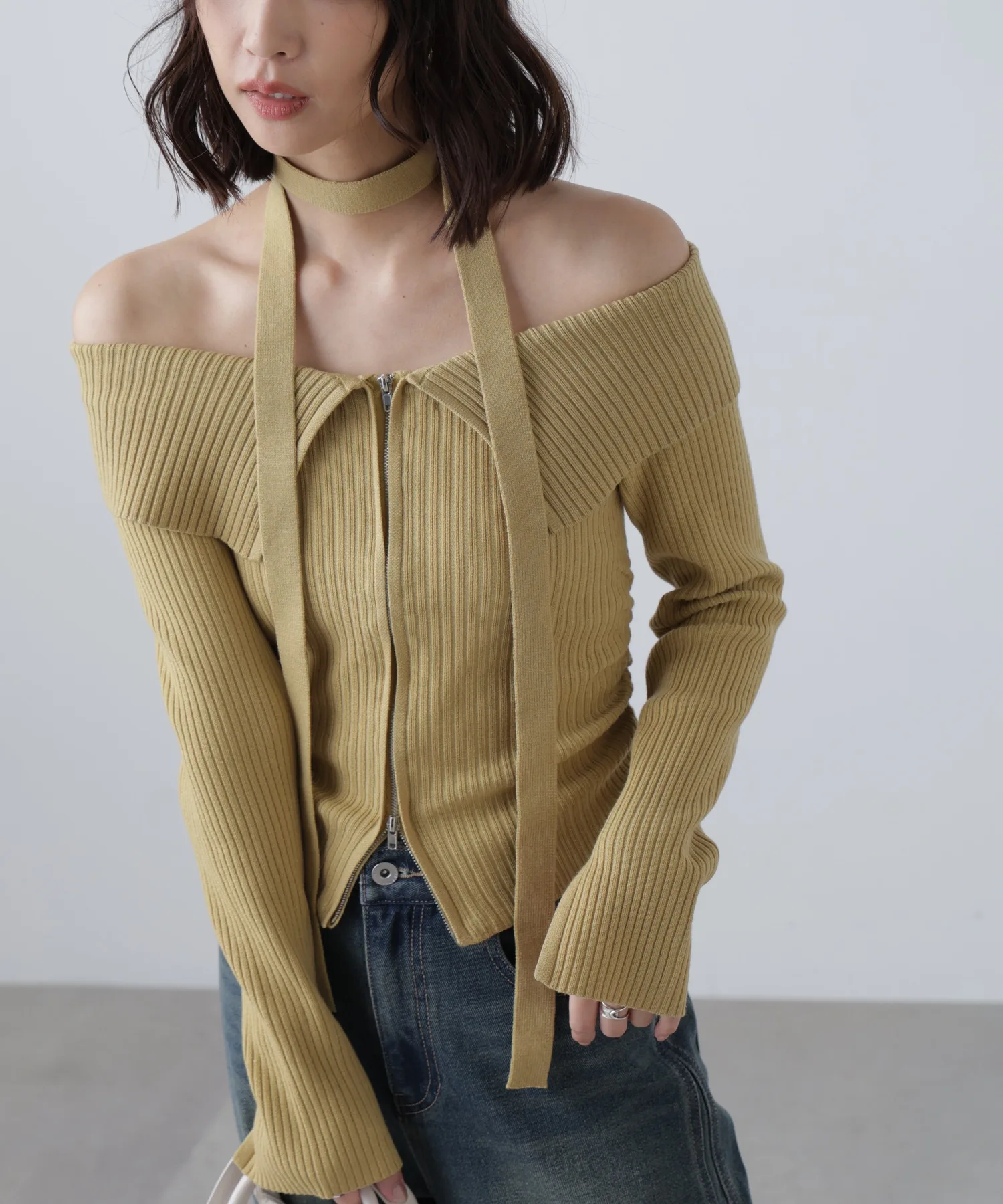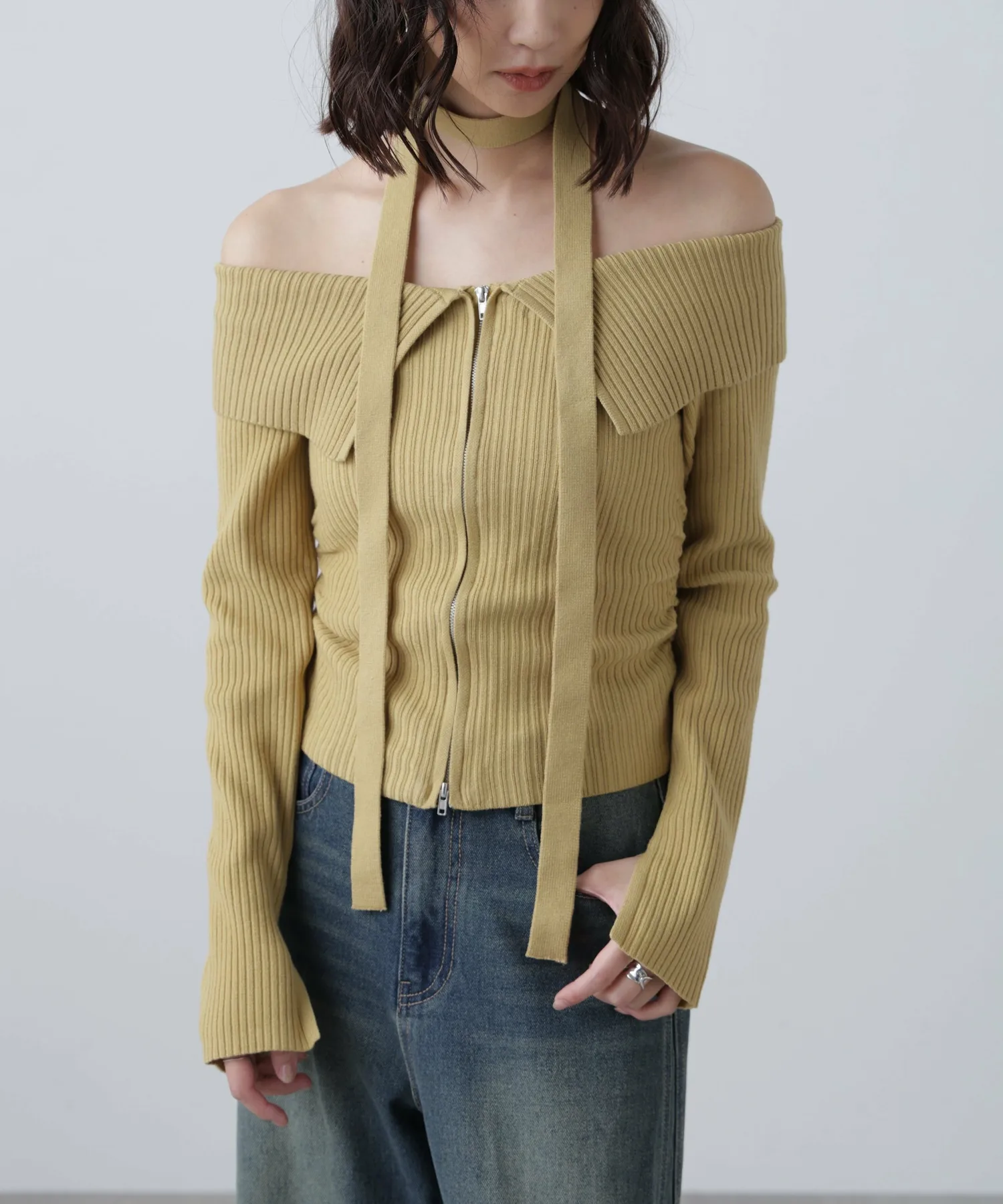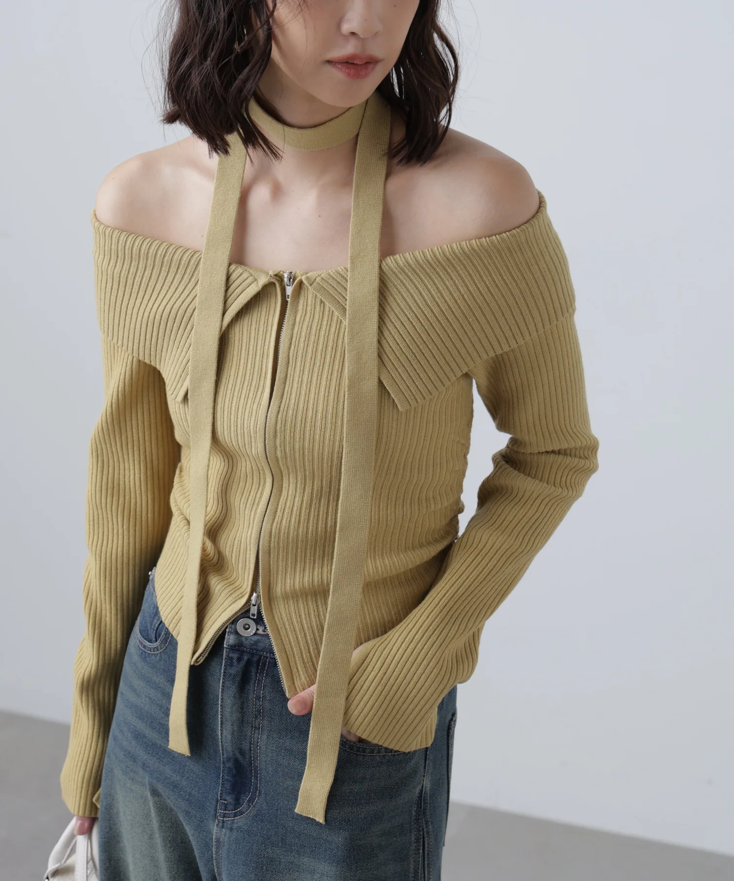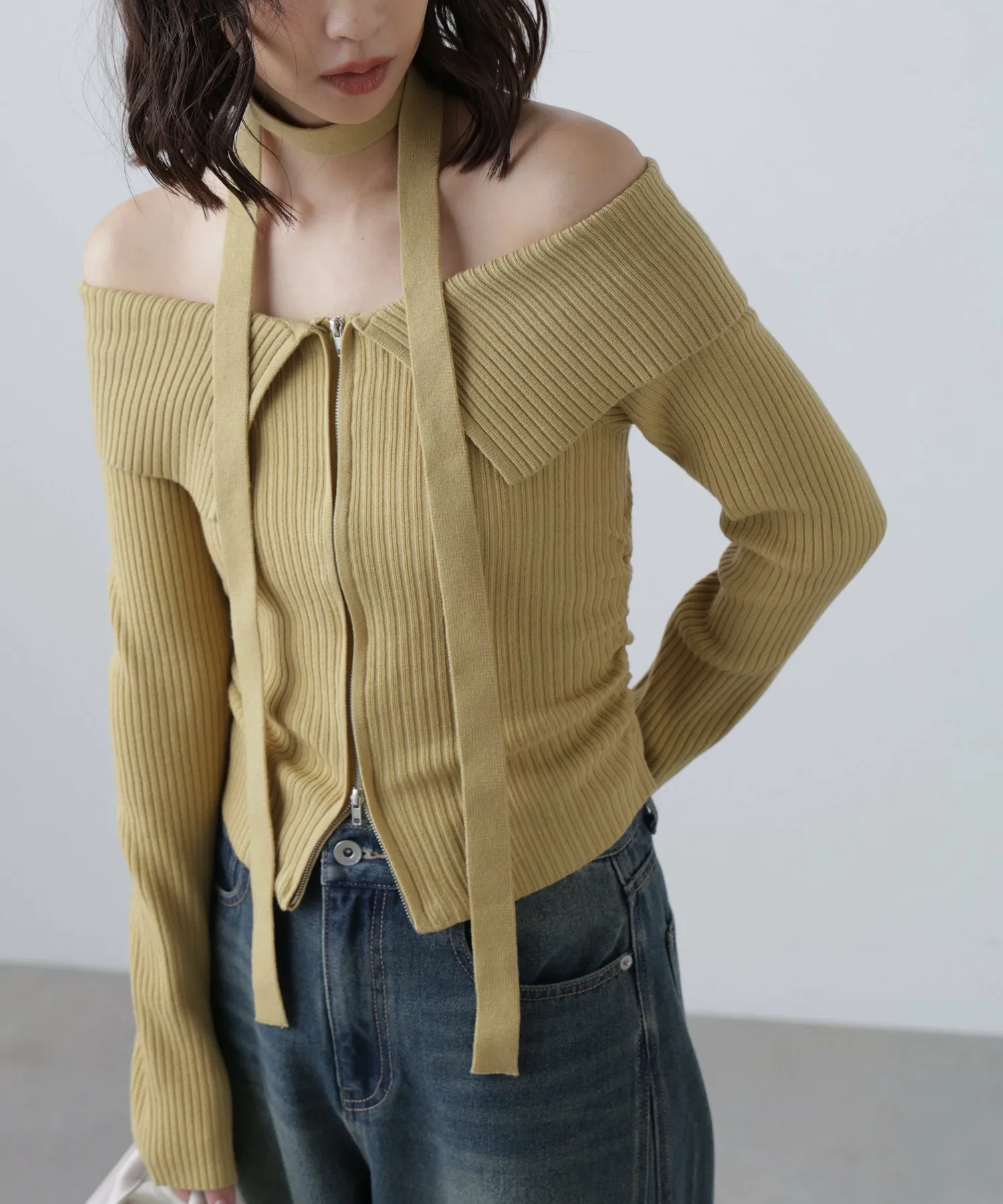 Трикотажное платье с открытыми плечами и воротником. Передняя молния застегивается сзади, поэтому его можно расстегнуть снизу и носить как разрез для более непринужденного образа. Талия собрана в складки, что визуально стройнит. Чокер из того же материала на шее скроет декольте и создаст повседневный образ. Его можно носить как с джинсами, так и с мини-юбкой и ботинками для более женственного образа.