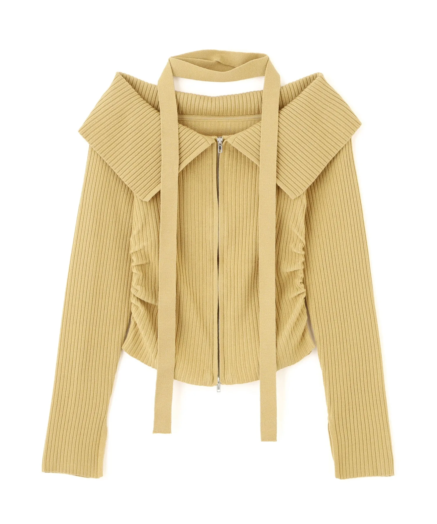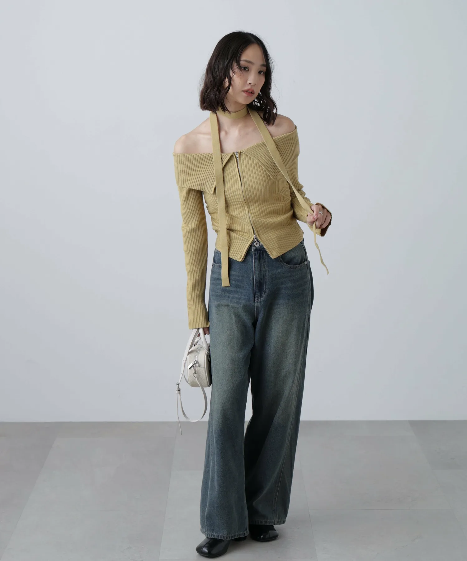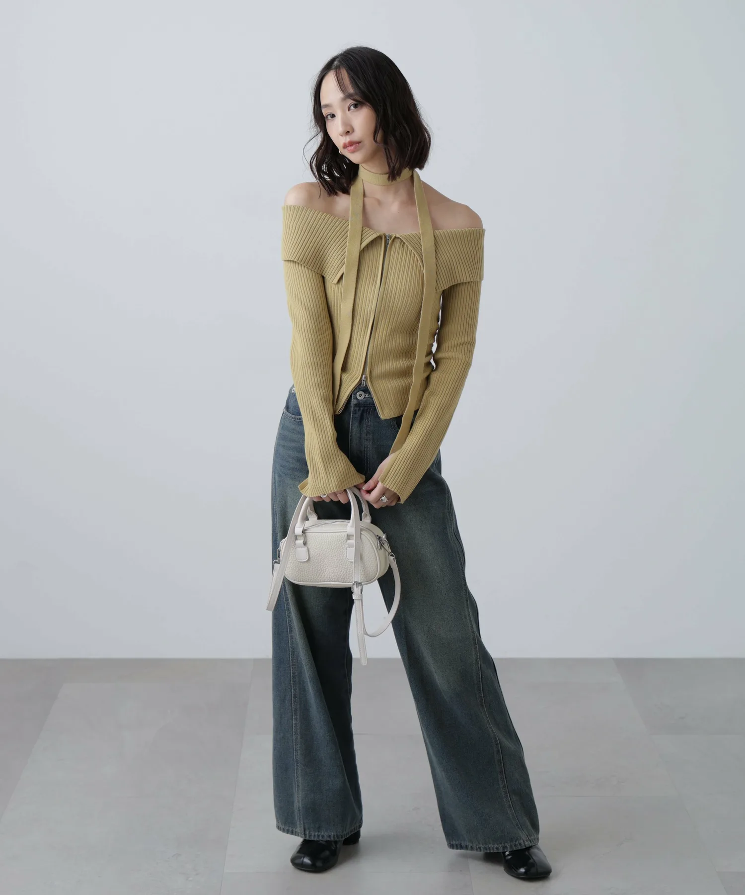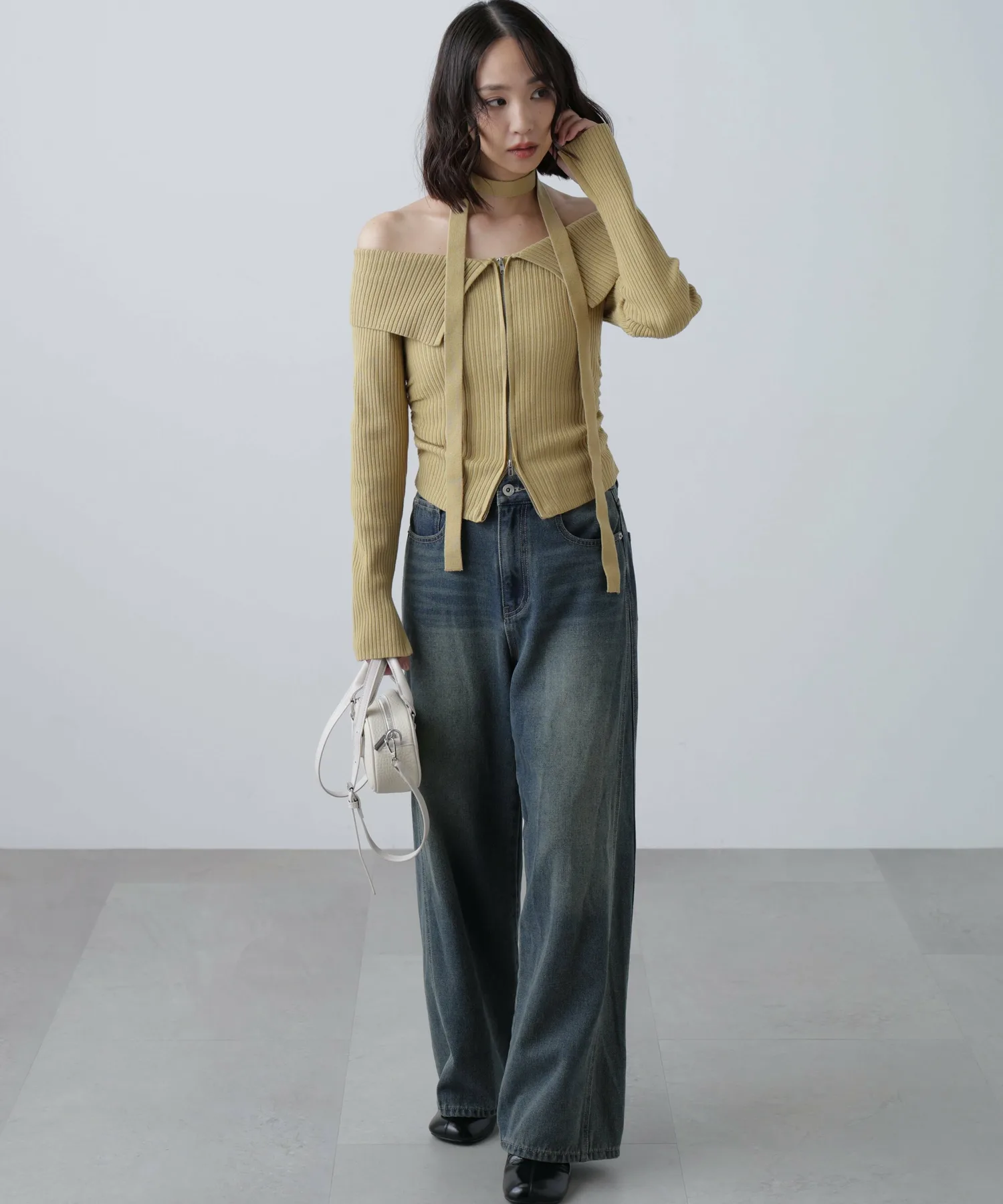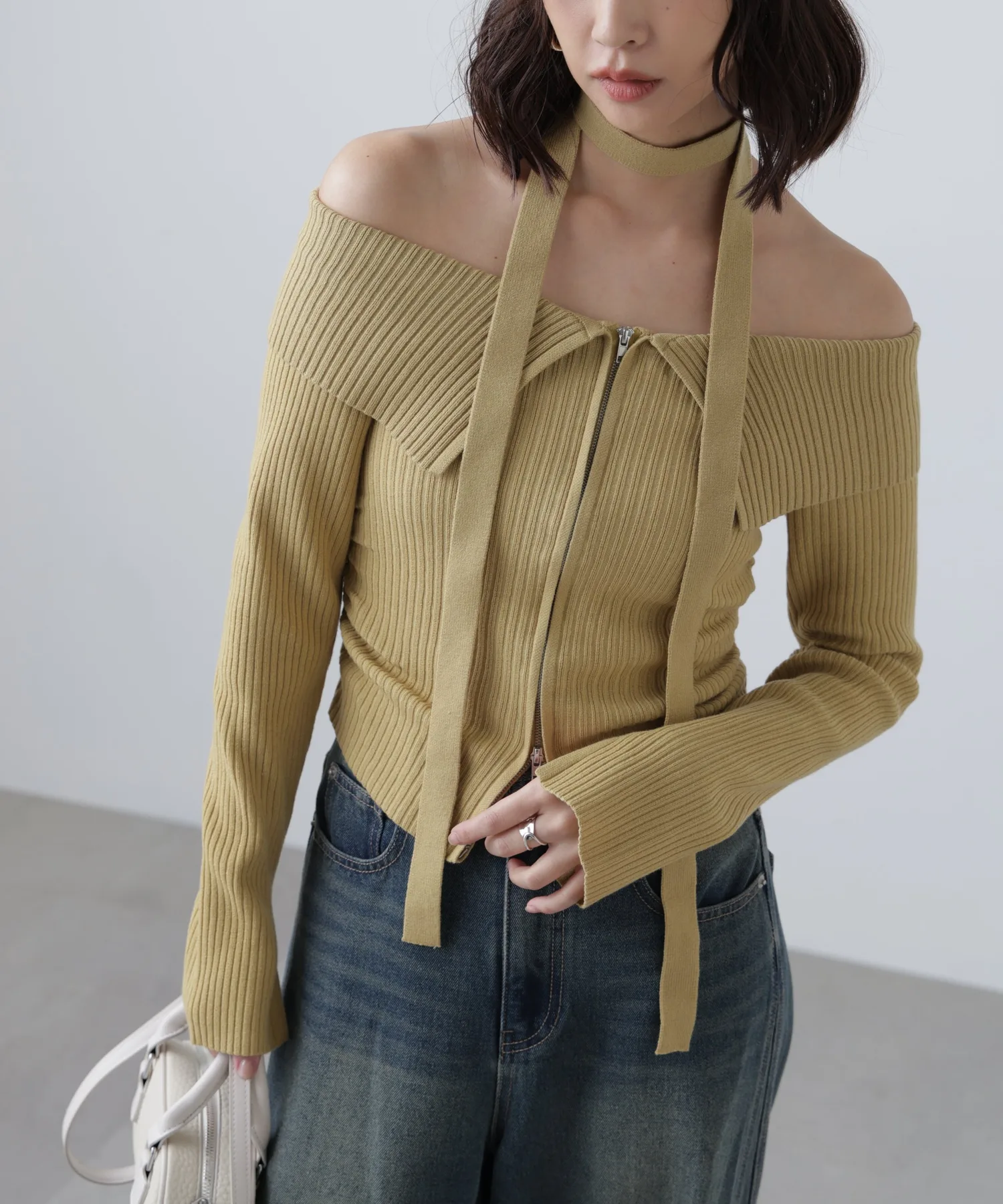 Трикотажное платье с открытыми плечами и воротником. Передняя молния застегивается сзади, поэтому его можно расстегнуть снизу и носить как разрез для более непринужденного образа. Талия собрана в складки, что визуально стройнит. Чокер из того же материала на шее скроет декольте и создаст повседневный образ. Его можно носить как с джинсами, так и с мини-юбкой и ботинками для более женственного образа.