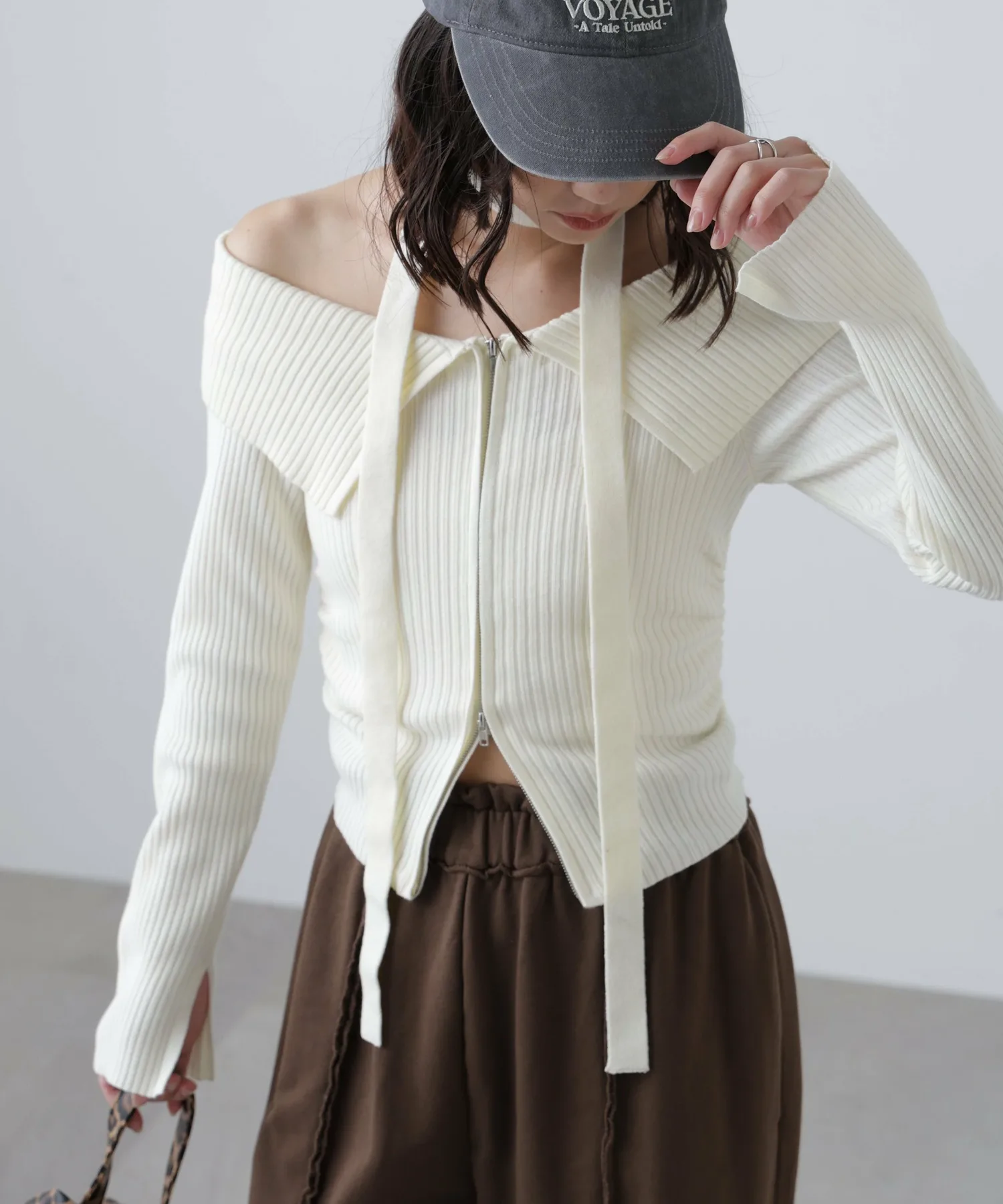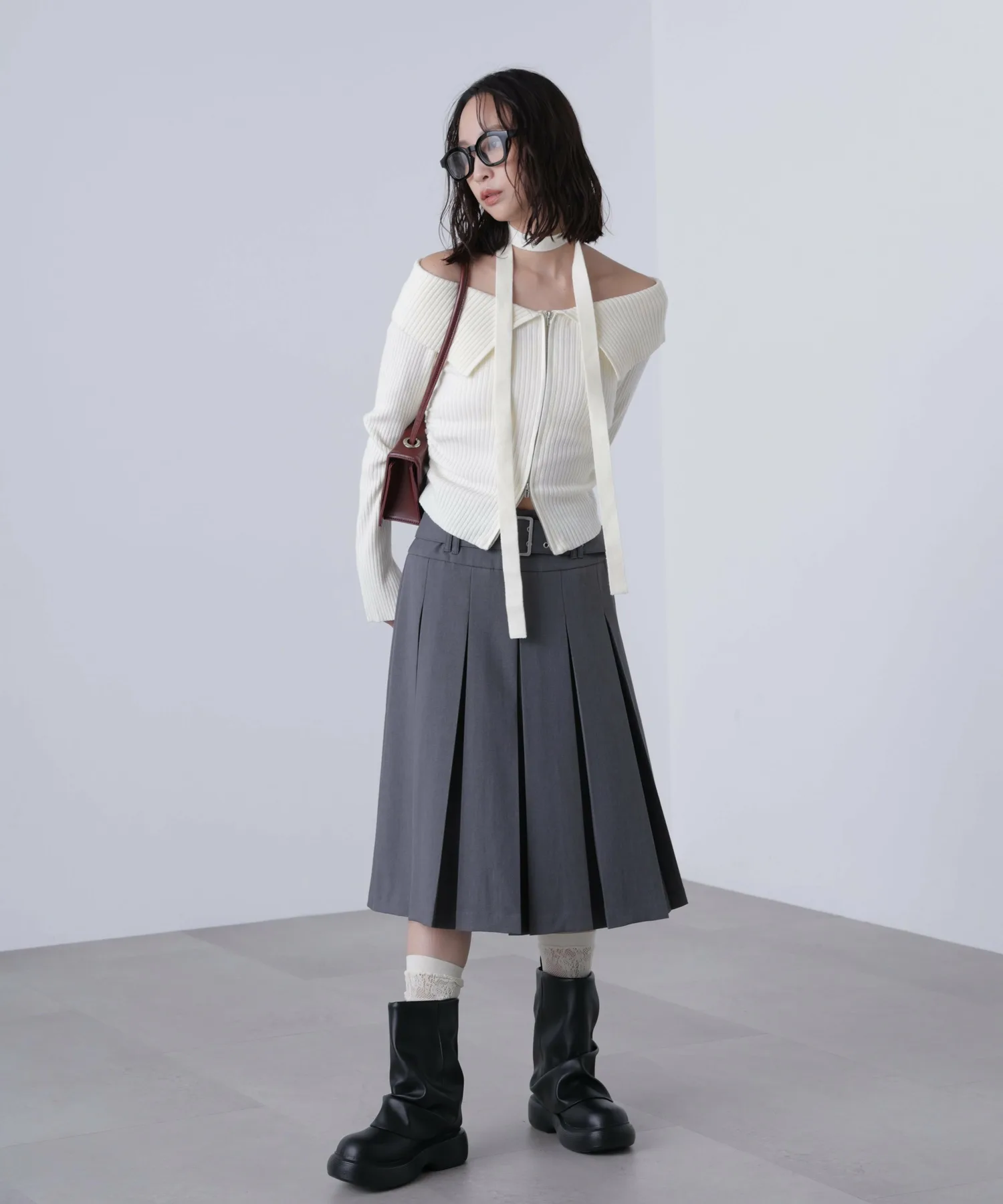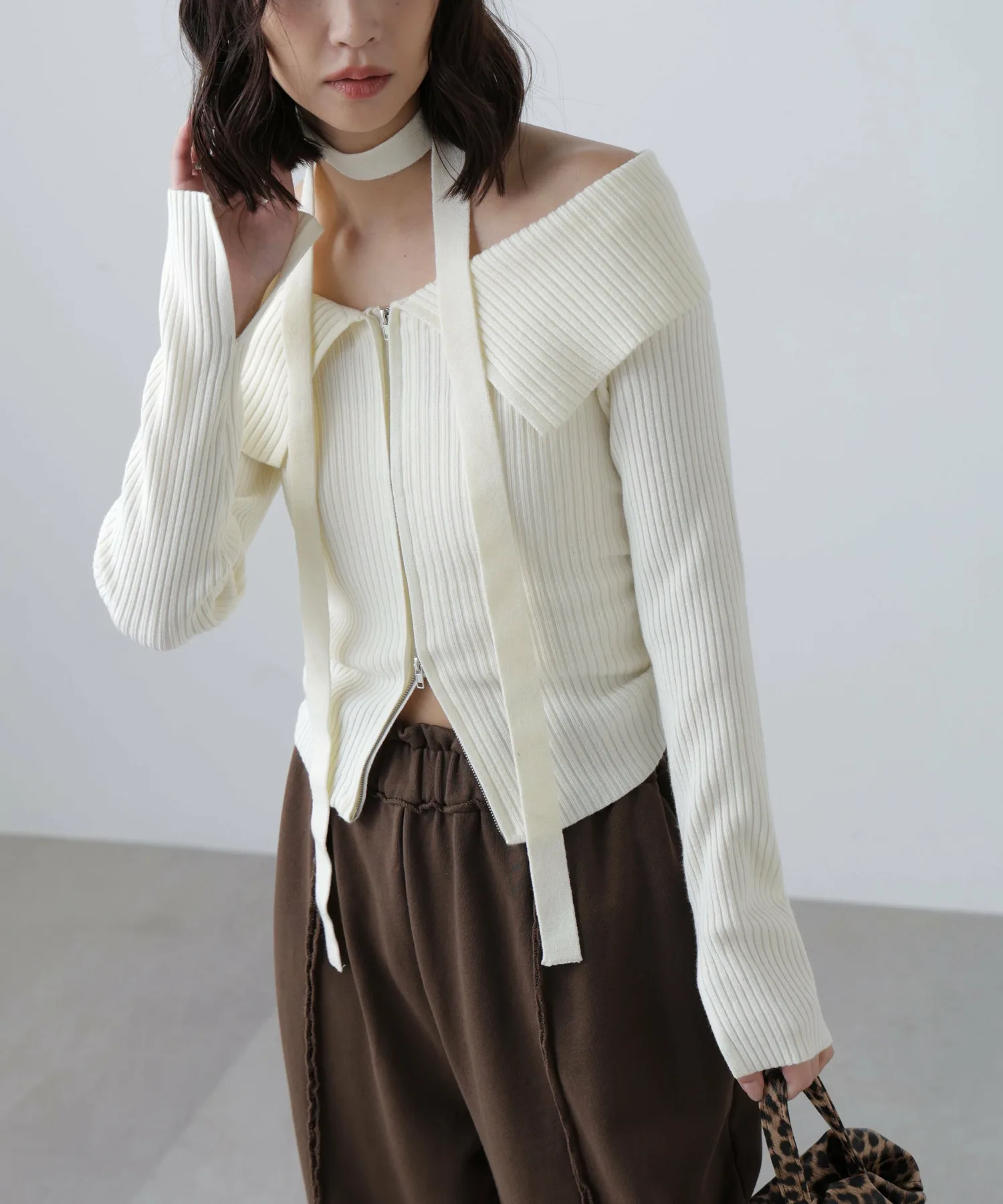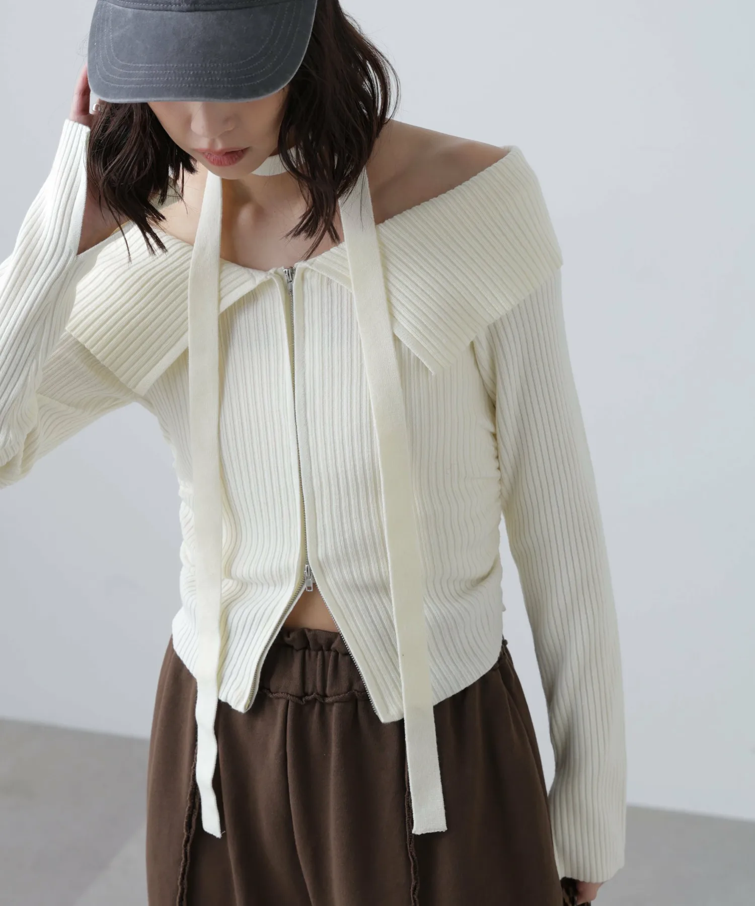 Трикотажное платье с открытыми плечами и воротником. Передняя молния застегивается сзади, поэтому его можно расстегнуть снизу и носить как разрез для более непринужденного образа. Талия собрана в складки, что визуально стройнит. Чокер из того же материала на шее скроет декольте и создаст повседневный образ. Его можно носить как с джинсами, так и с мини-юбкой и ботинками для более женственного образа.