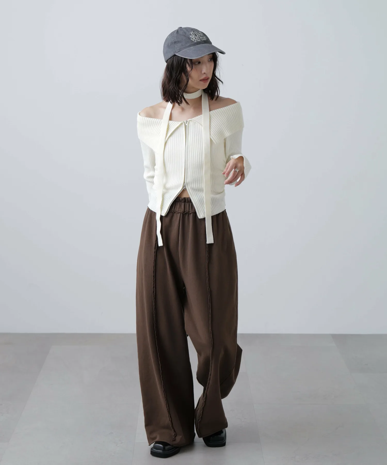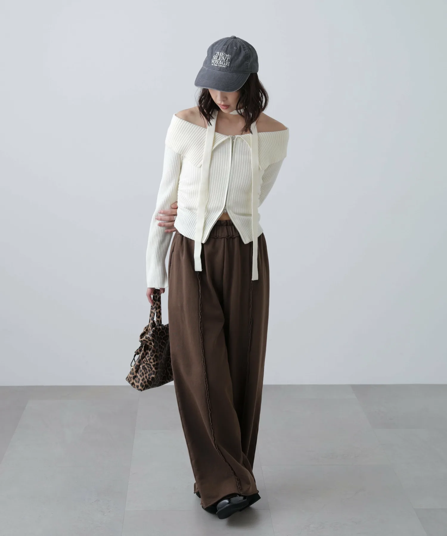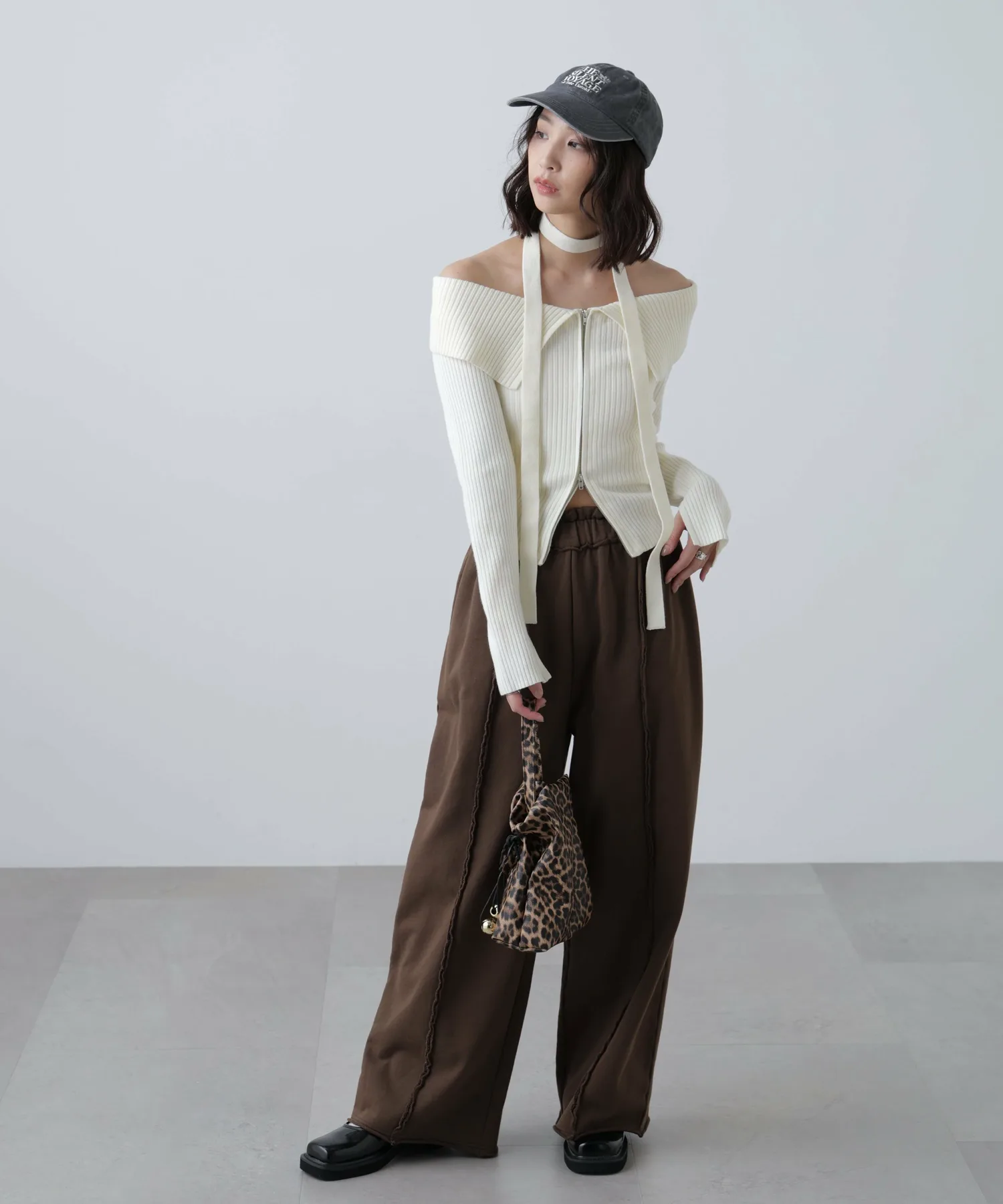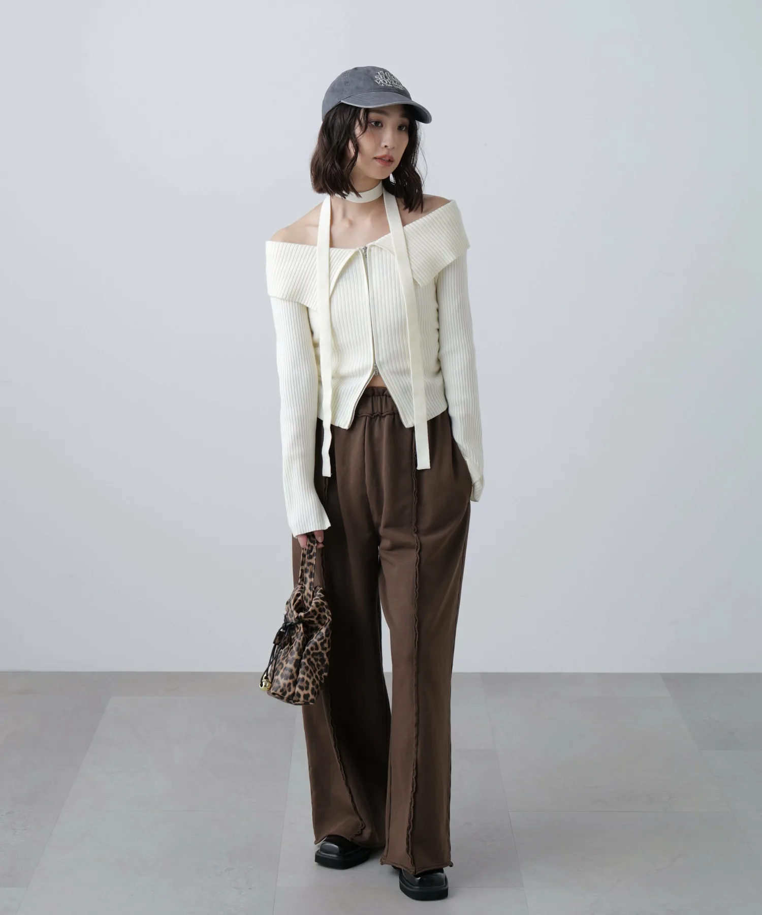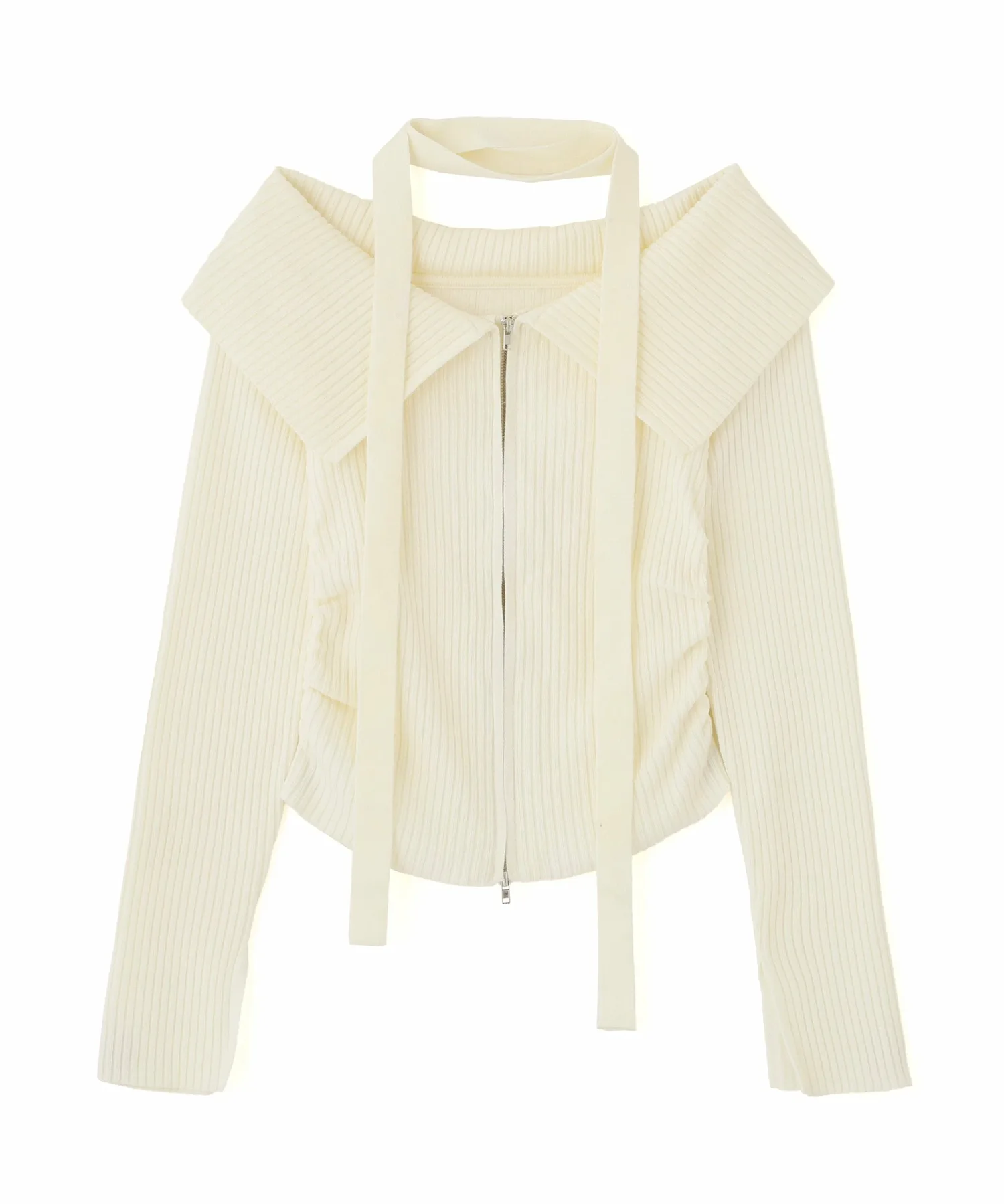 Трикотажное платье с открытыми плечами и воротником. Передняя молния застегивается сзади, поэтому его можно расстегнуть снизу и носить как разрез для более непринужденного образа. Талия собрана в складки, что визуально стройнит. Чокер из того же материала на шее скроет декольте и создаст повседневный образ. Его можно носить как с джинсами, так и с мини-юбкой и ботинками для более женственного образа.
