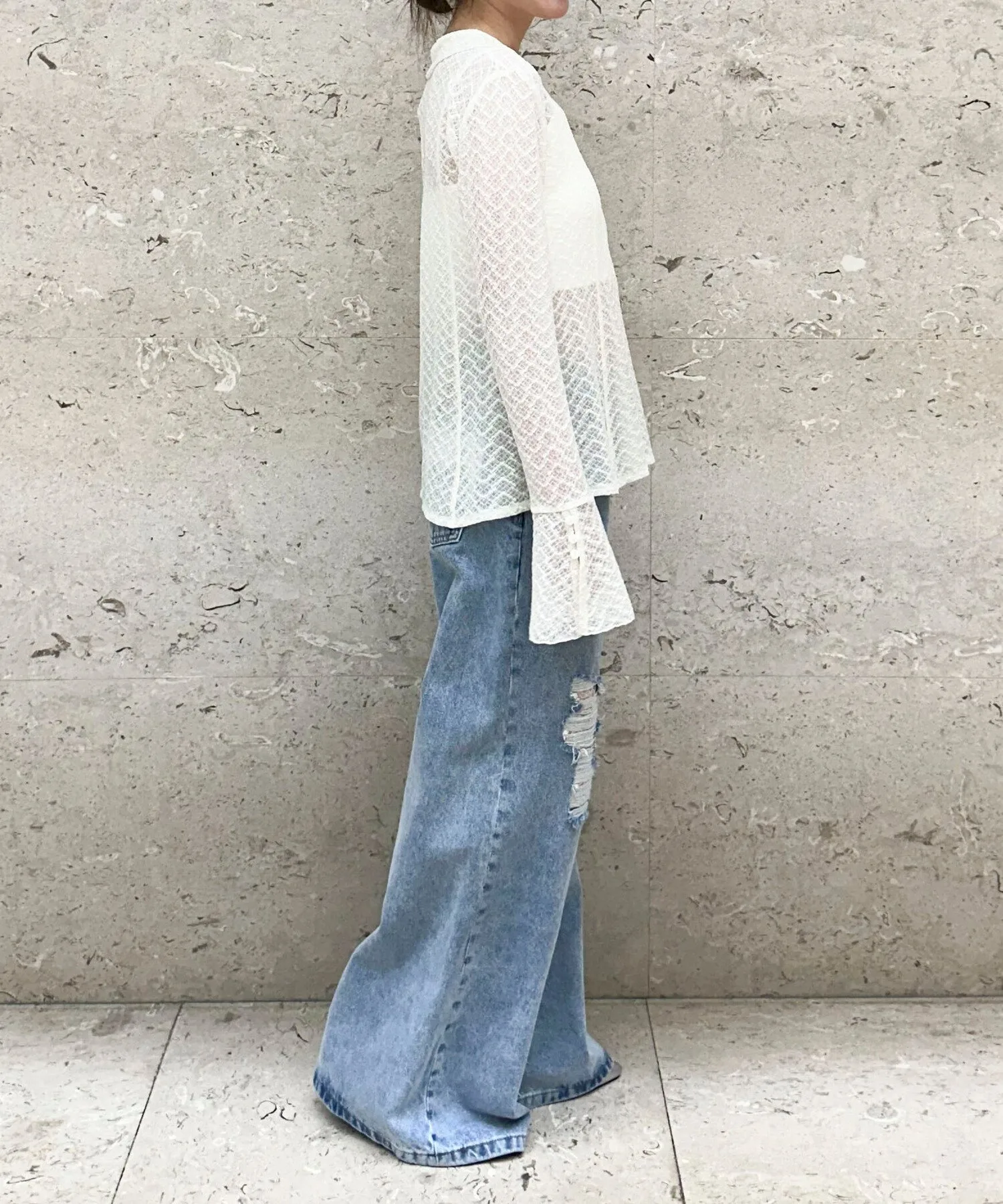 Расклешенная кружевная блузка-поло, которая эффектно смотрится в многослойных образах