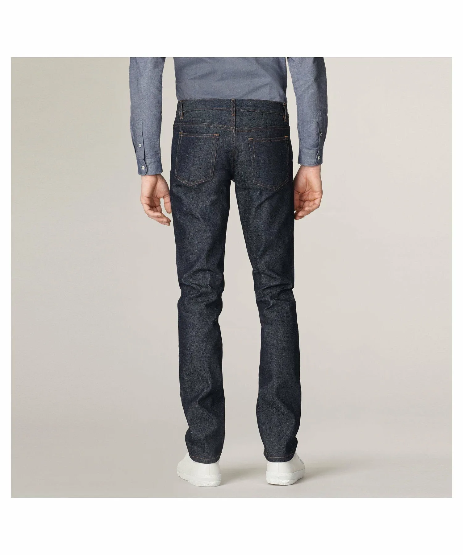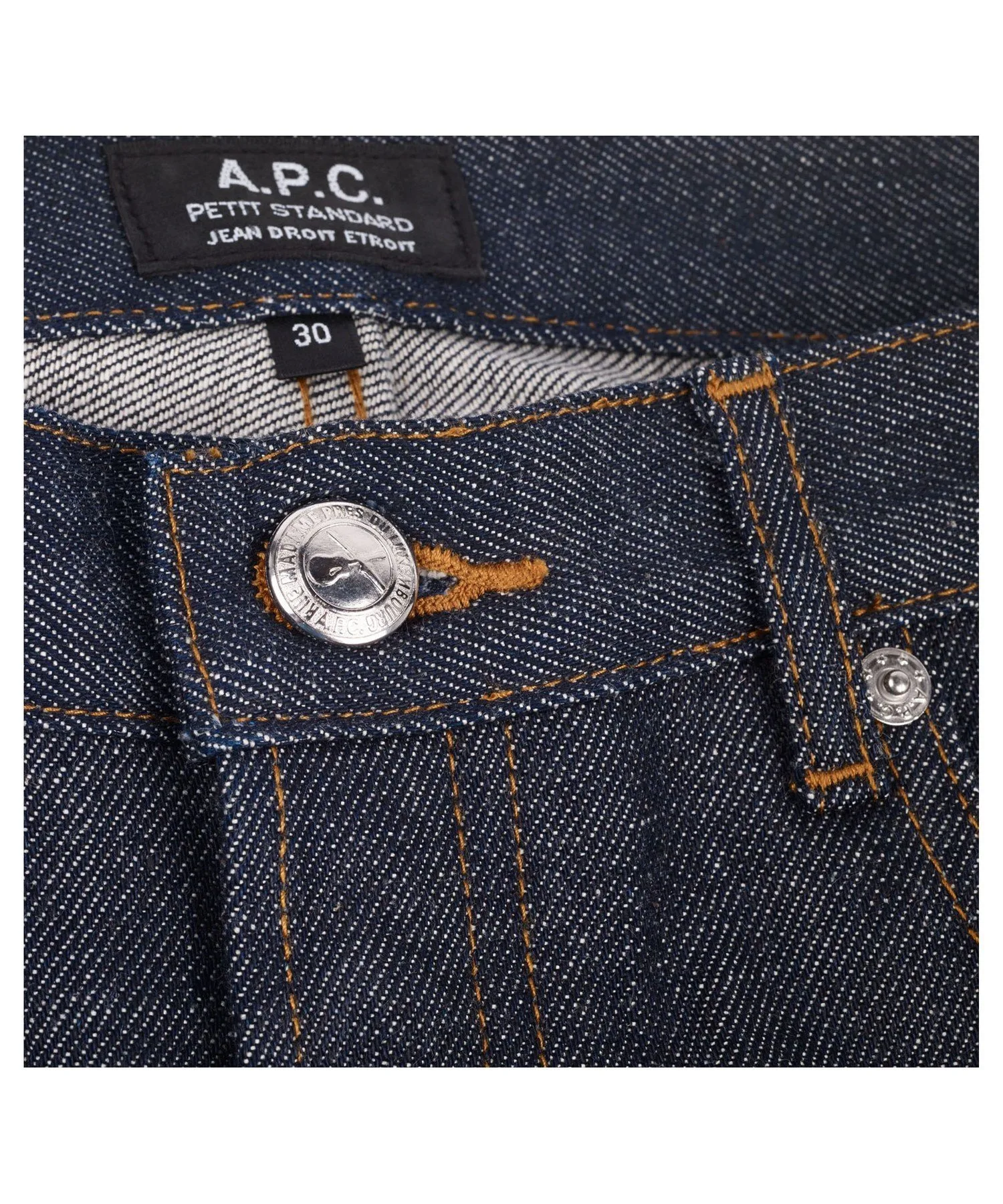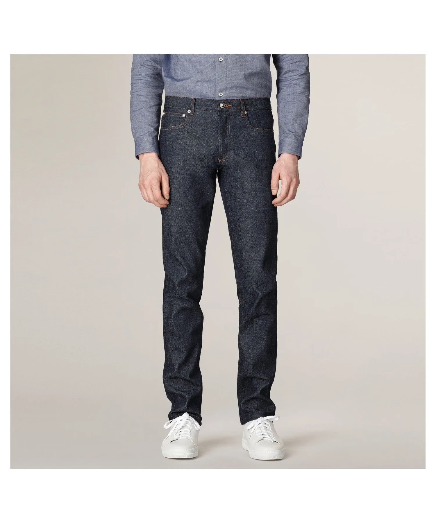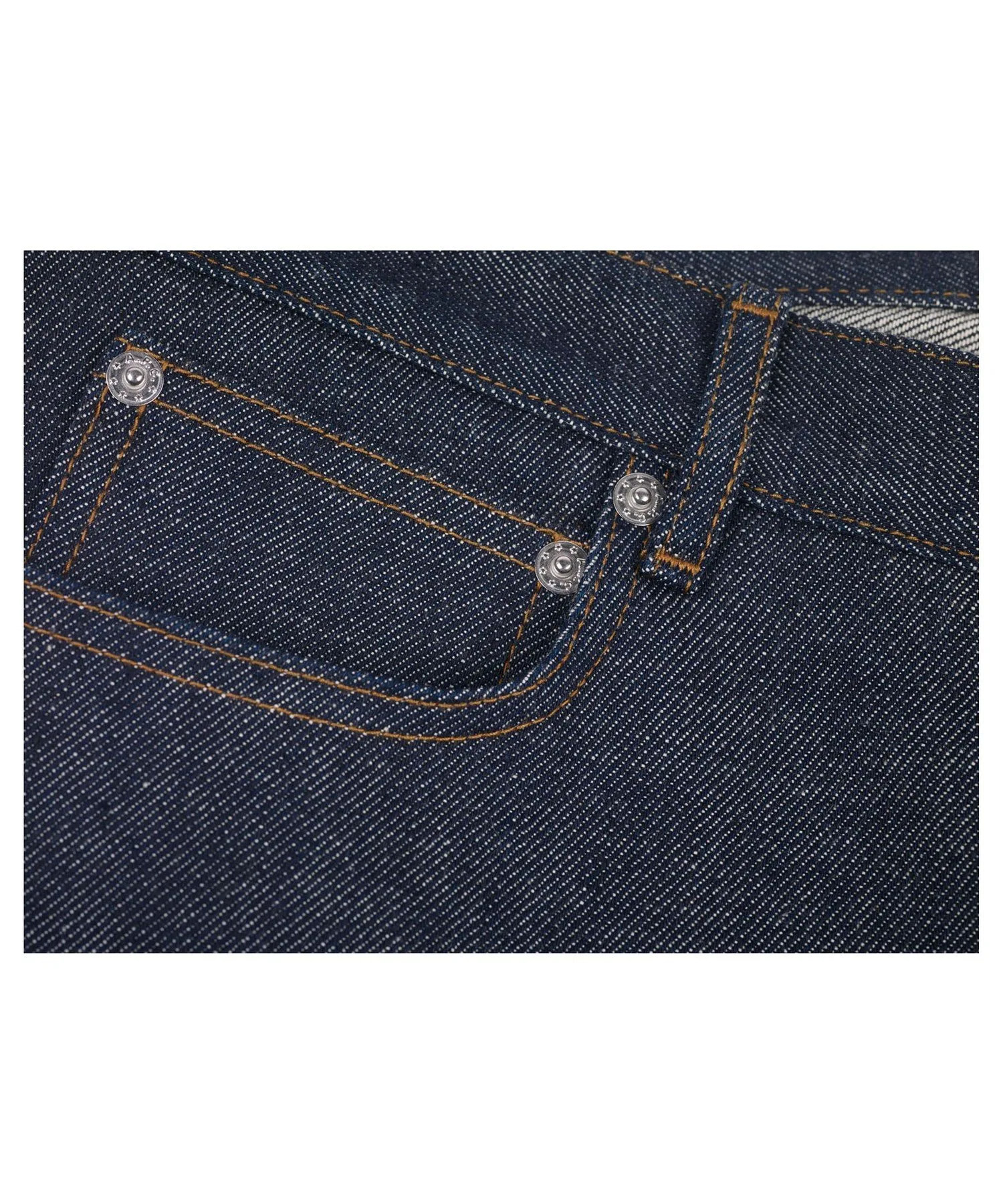 Нестиранный японский деним. Джинсы унисекс. Узкий прямой крой. Слегка зауженный низ. Низкая талия. Прямой пояс. Пять карманов. Застежка на пуговицах. Надпись "APCrueMadamepresduLuxembourg" на пуговице пояса. Красная кромка. Оранжевая строчка. 14,50 унций.