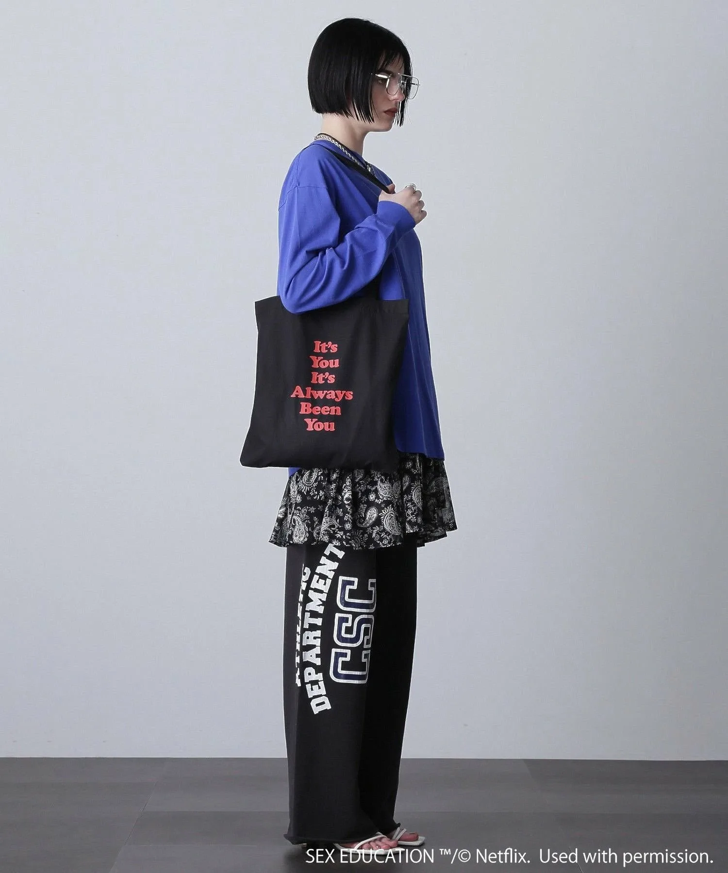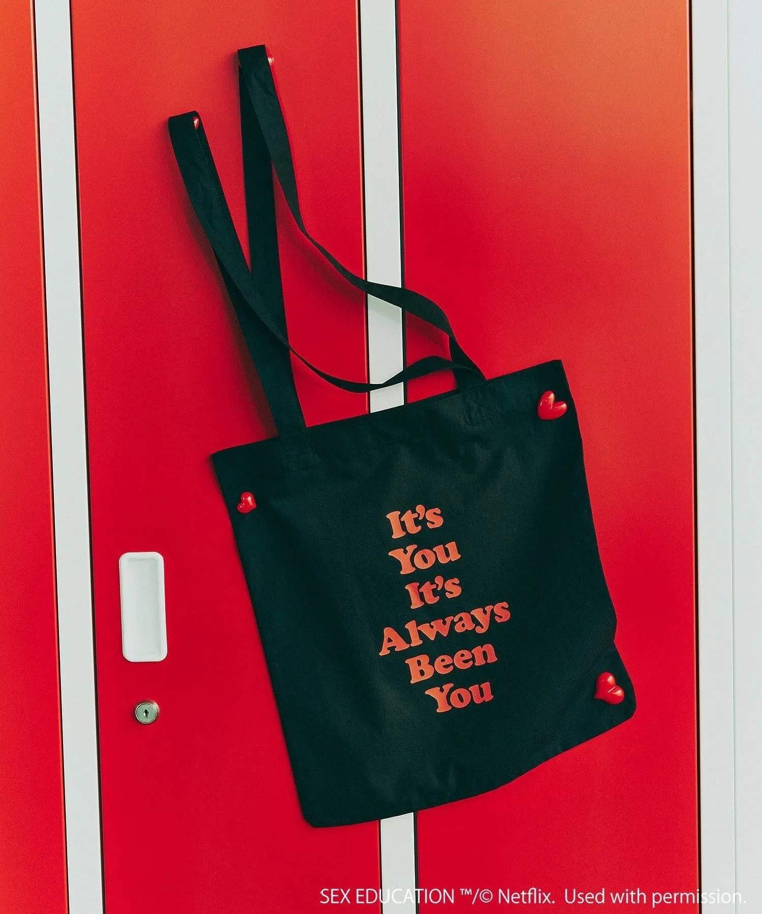 - Сумка-шоппер с принтом, на котором напечатаны слова из запоминающихся сцен сериала «Половое воспитание».