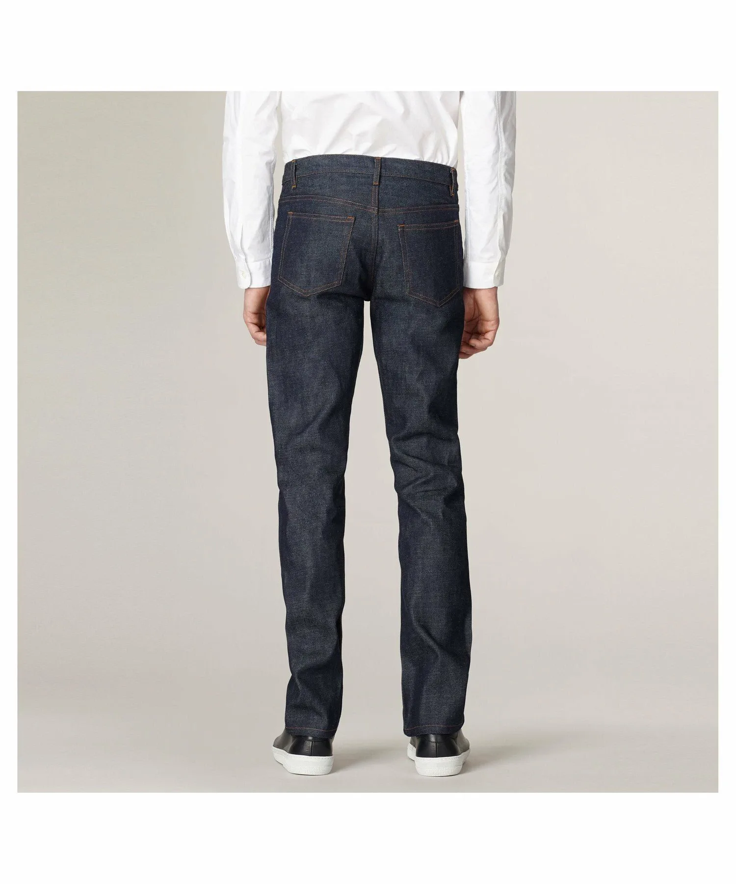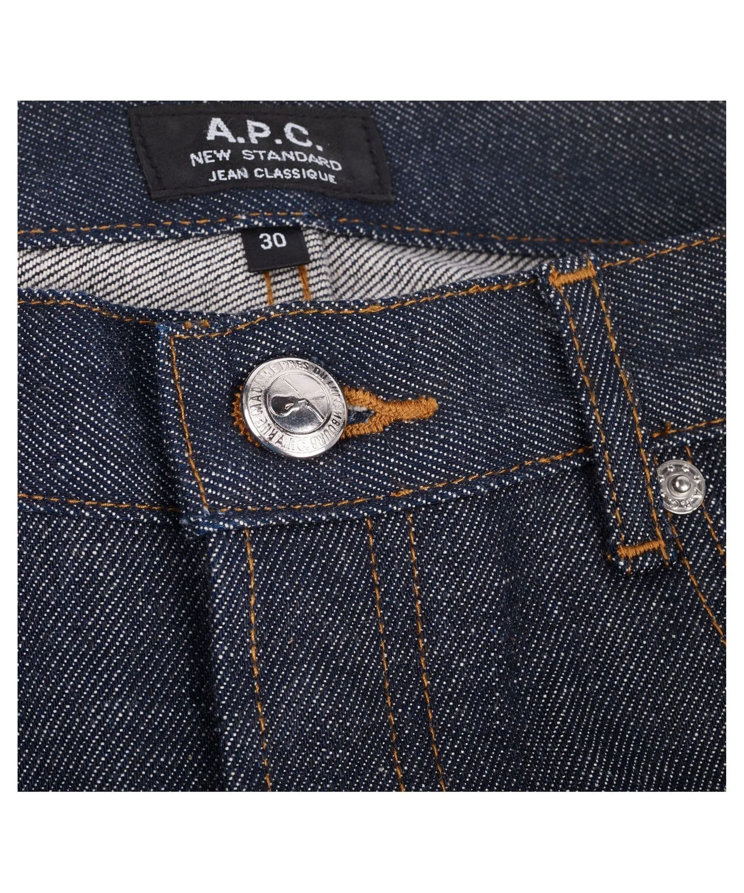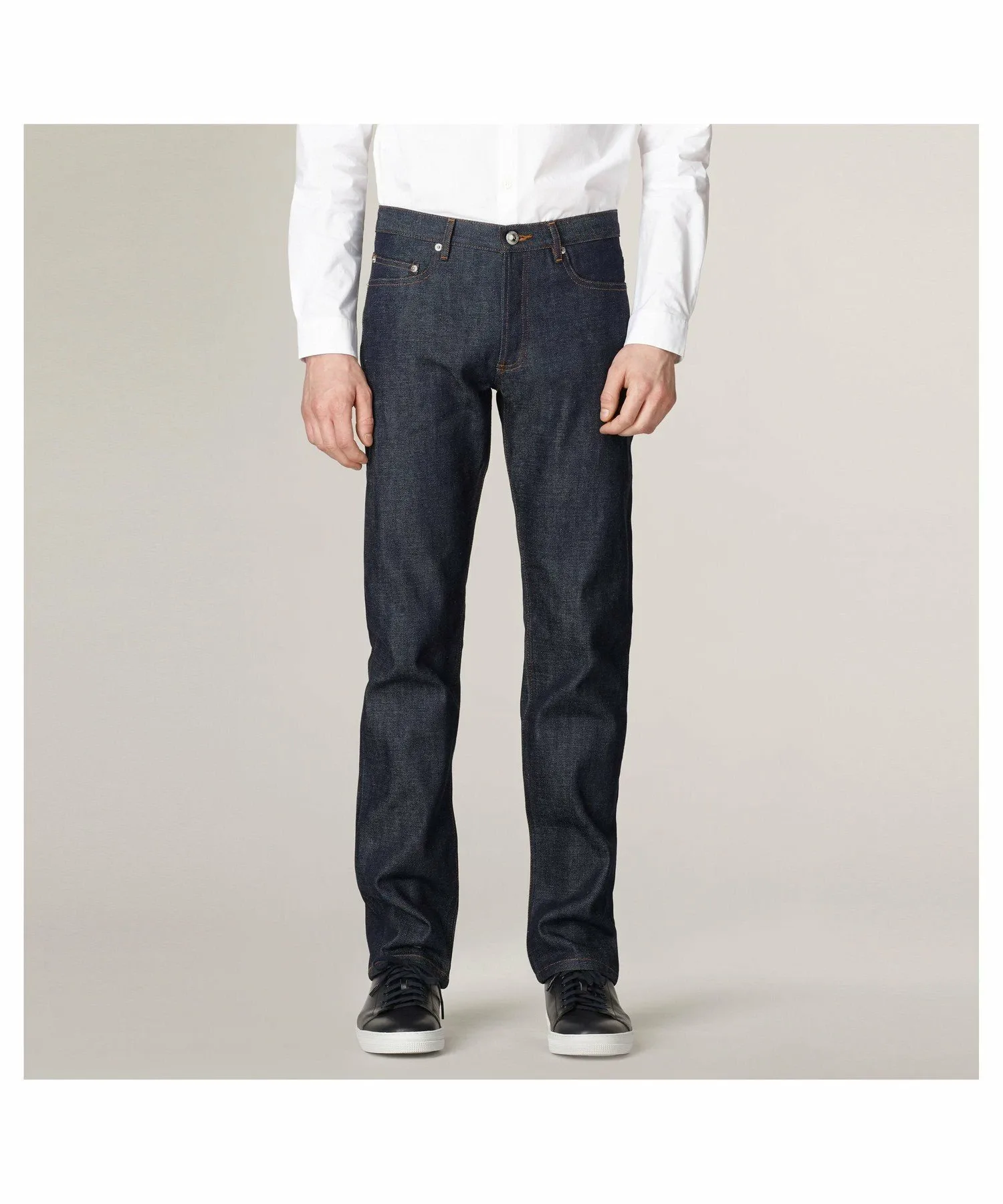Сделано в Японии, нестиранный деним. Джинсы унисекс. Классические джинсы APC. Прямой крой. Слегка зауженный низ. Средняя посадка. Прямой пояс. Пять карманов. Застежка на пуговицах. Надпись "APCrueMadamepresduLuxembourg" на пуговице пояса. Красная кромка. Оранжевая строчка. 14,50 унций.