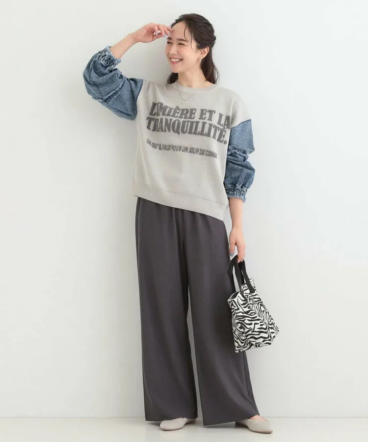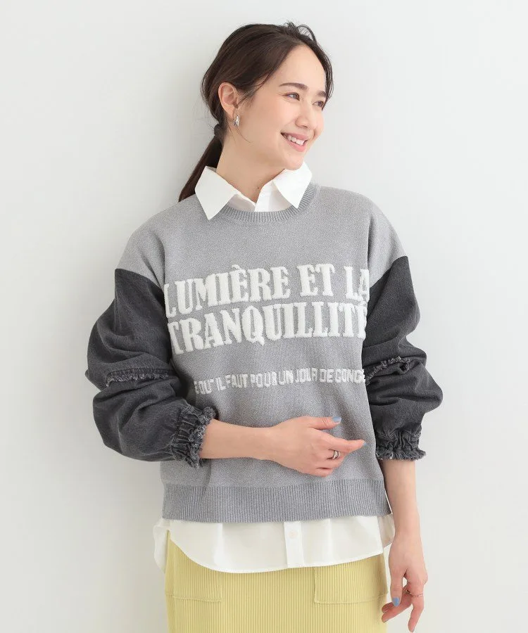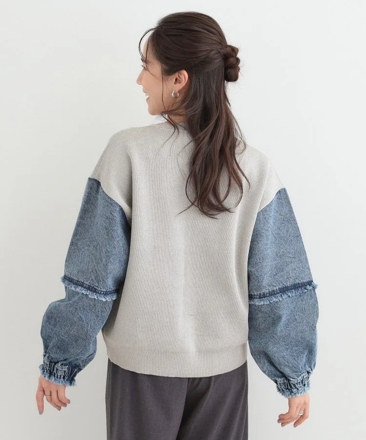 Этот вязаный пуловер имеет рукава из джинсовой ткани контрастного цвета.