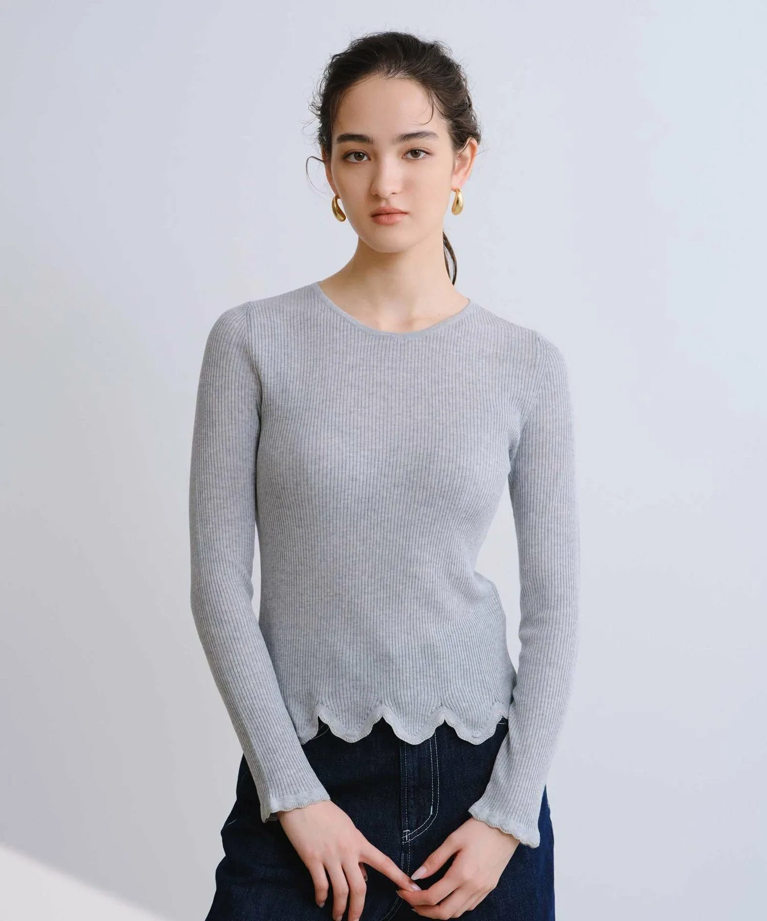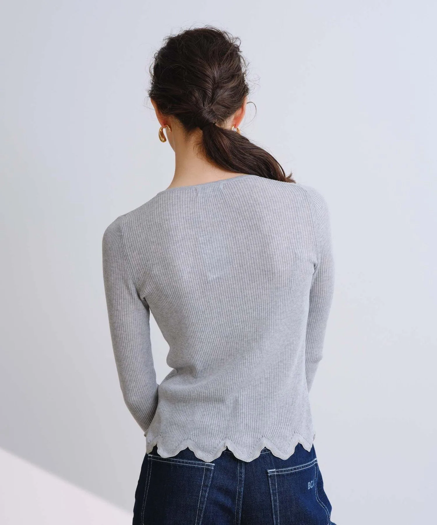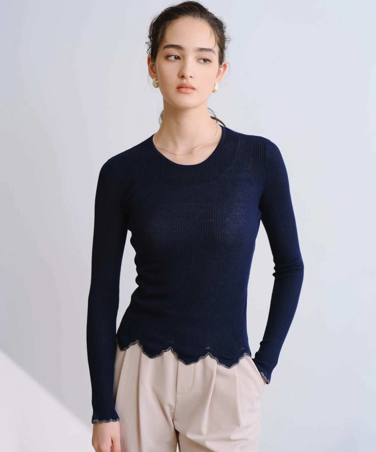 Изготовленный из тонкой трикотажной резинки плотностью 16 нитей, этот свитер обеспечивает удобную посадку и аккуратную отделку. Волнистый фестончатый край является изюминкой, а использование пряжи с блестками создает нежный мерцающий эффект при движении. Этот трикотаж универсален и подходит для самых разных стилей, от повседневной носки до более изысканных образов.