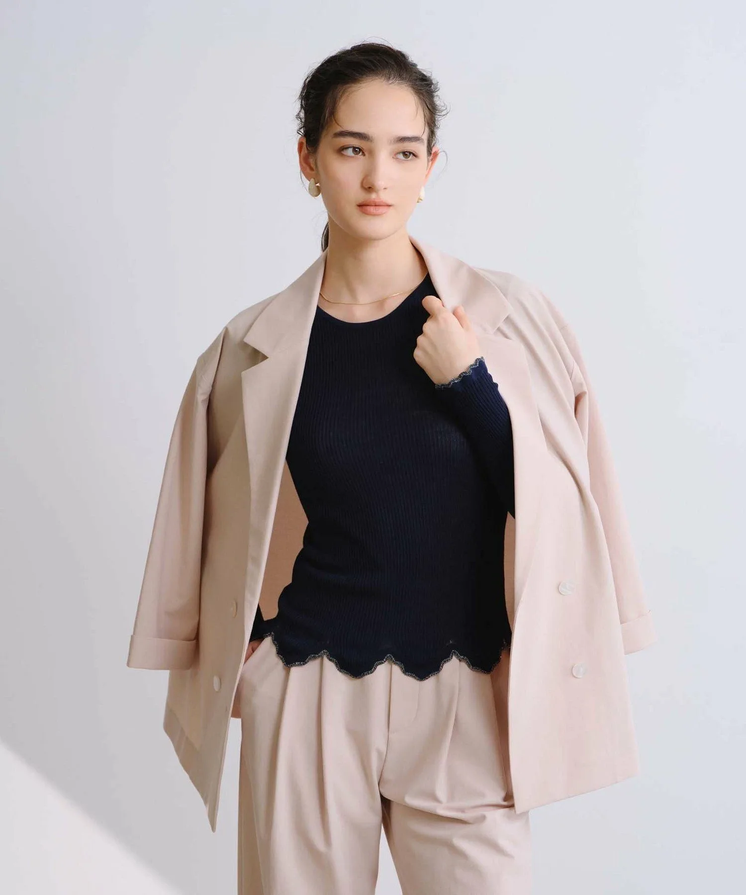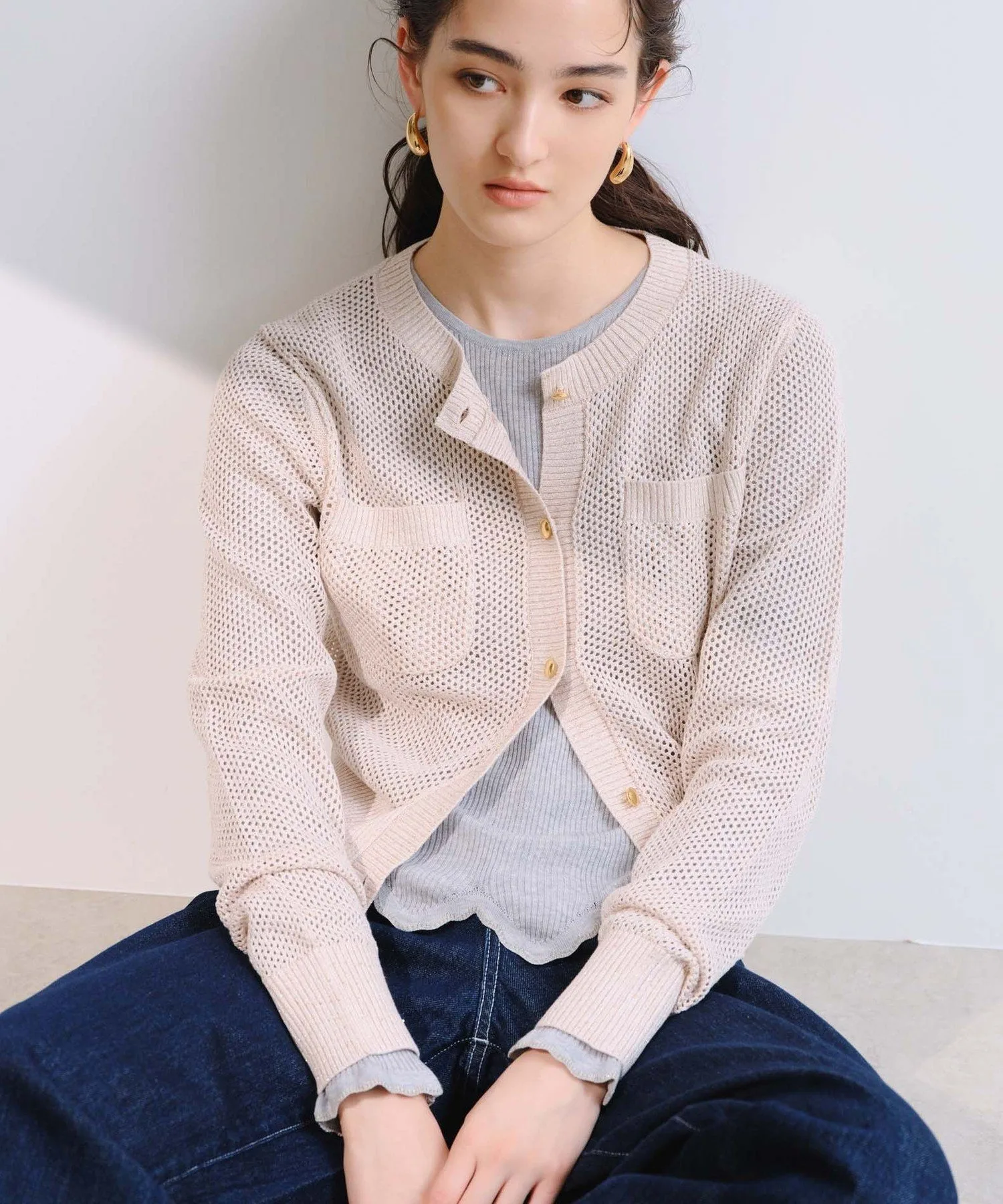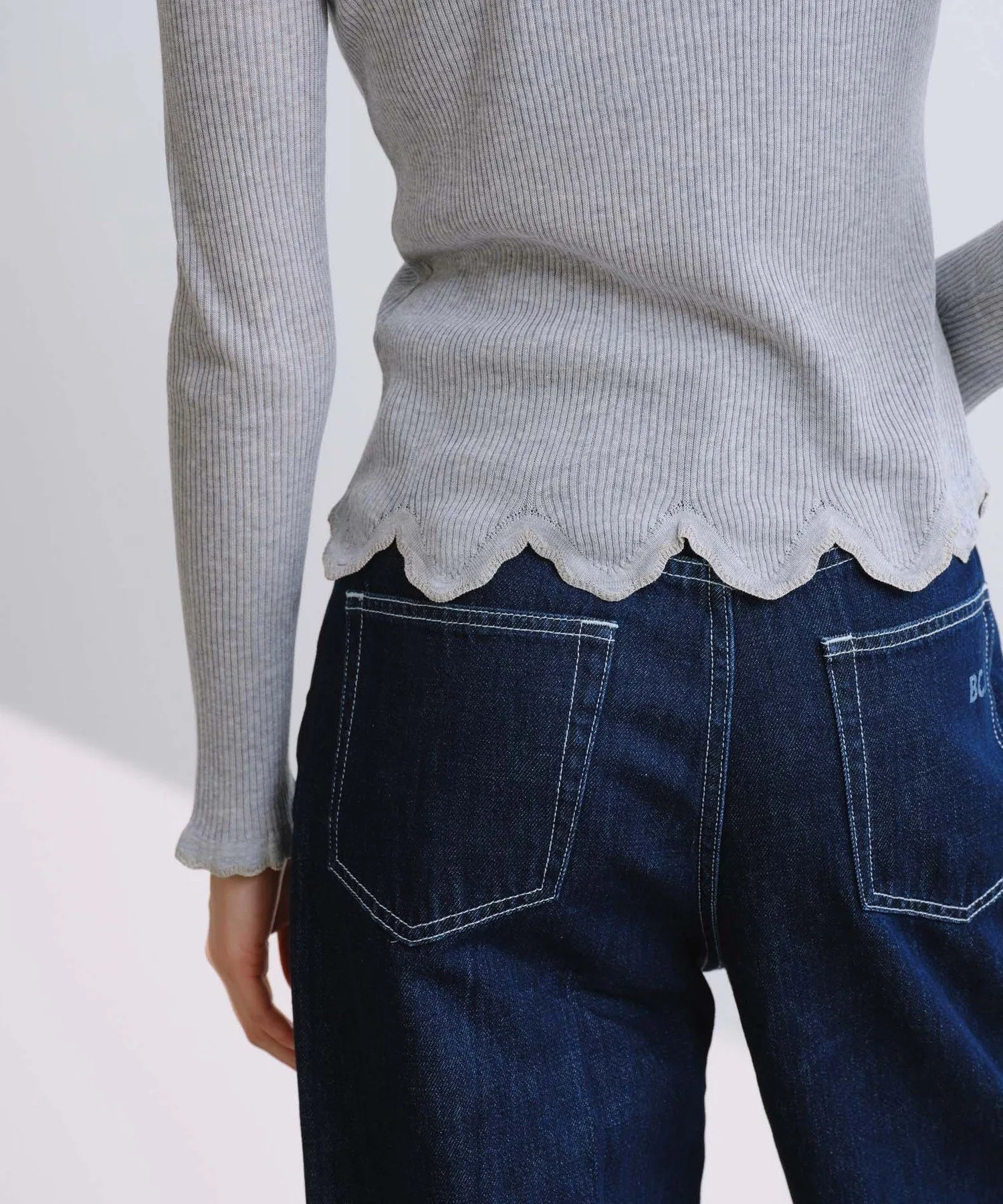 Изготовленный из тонкой трикотажной резинки плотностью 16 нитей, этот свитер обеспечивает удобную посадку и аккуратную отделку. Волнистый фестончатый край является изюминкой, а использование пряжи с блестками создает нежный мерцающий эффект при движении. Этот трикотаж универсален и подходит для самых разных стилей, от повседневной носки до более изысканных образов.