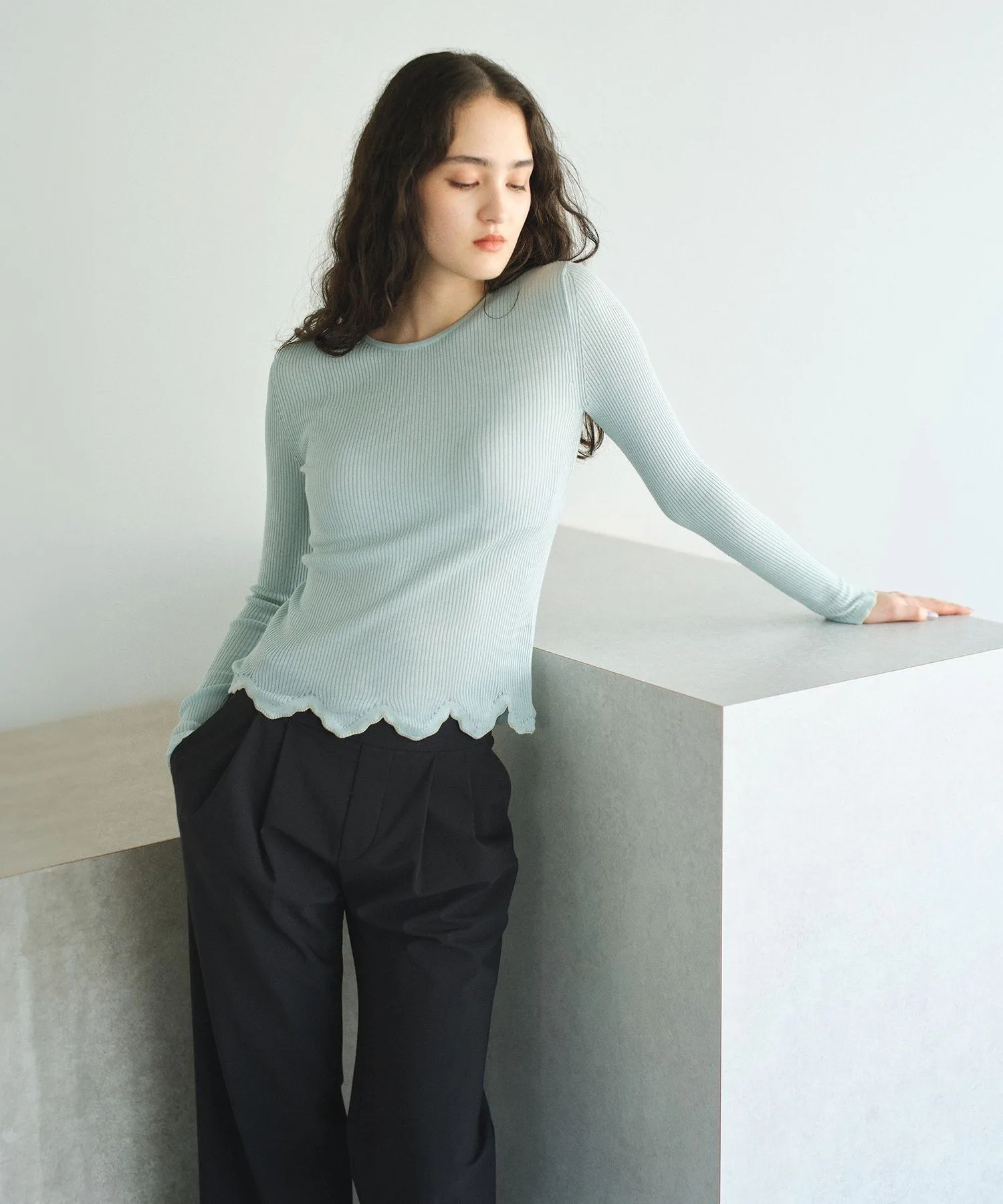 Этот элегантный трикотаж имеет фестончатый край. Тонкая ребристая отделка позволяет легко носить его как нижний слой, а волнистый край добавляет элегантности. Нежный блеск придает изделию изысканность, делая его идеальным для повседневной носки. Мятно-зеленый цвет – свежий оттенок, который поднимет вам весеннее настроение.