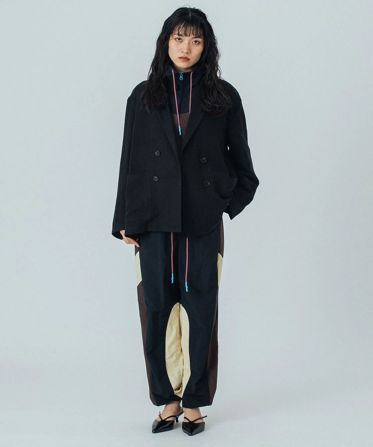 Двубортная застёжка придаёт ей аккуратный вид, но её также можно носить в повседневном стиле с футболкой и джинсами.